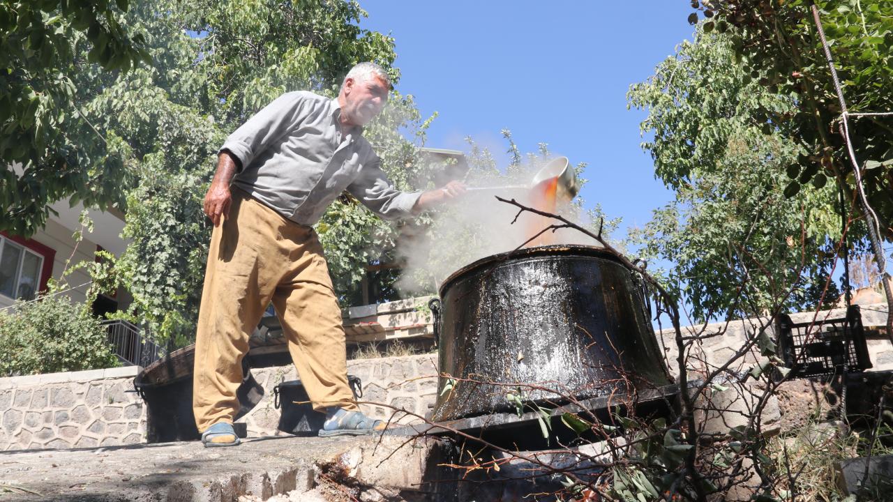 Taşlardan yaptıkları ocakların üzerine yerleştirdikleri bakır kazanlarda 5-6 saat kaynatılan üzüm suyu, meşakkatli bir yolculuğun ardından pekmeze dönüştürülerek kahvaltı sofralarını tatlandırıyor.