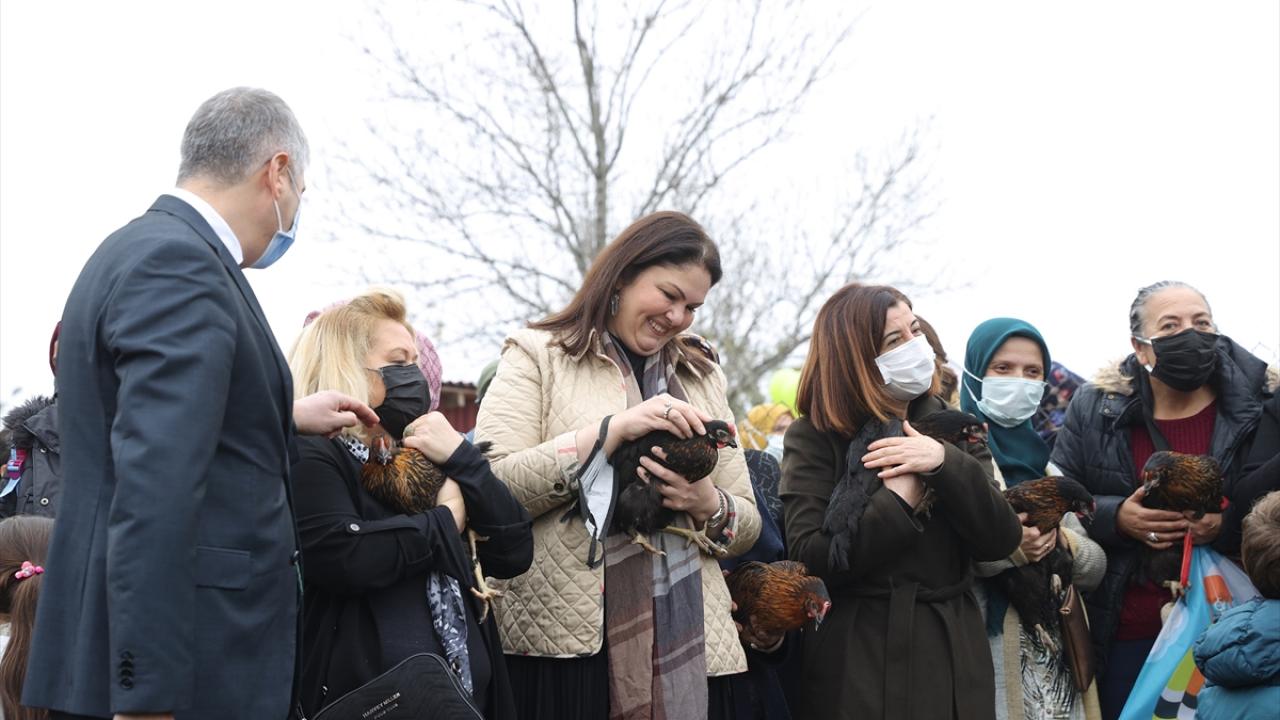 Konuşmaların ardından nakil kamyonundan indirilen 105 tavuk üretici Remziye Çakıcı`ya teslim edildi.