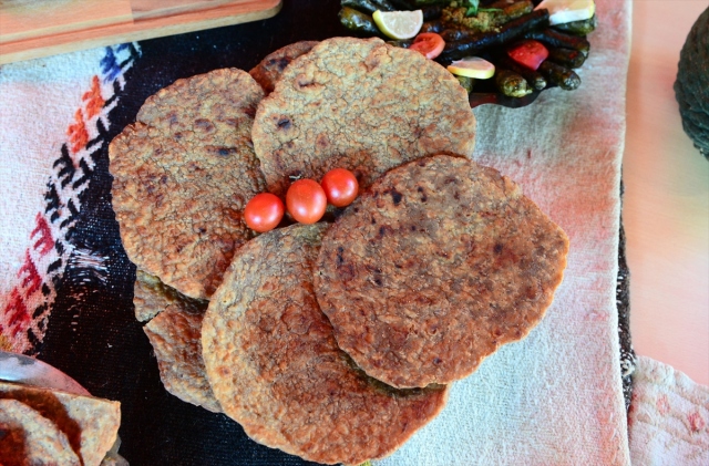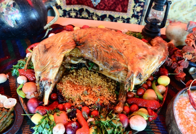 Yörük kültürünün egemen olduğu Uşak mutfağının birbirinden farklı lezzetleri ziyaretçilerin ilgisini çekiyor. Fotoğrafta bu lezzetlerden kuzu çevirme görülüyor.
