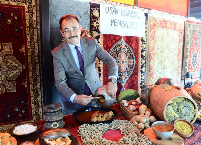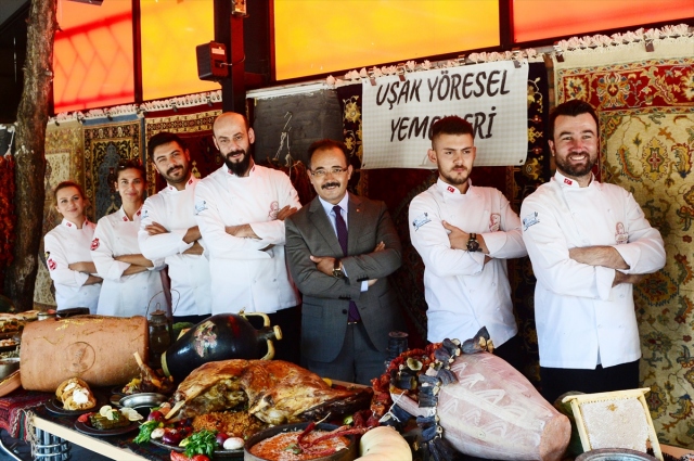 Yörük kültürünün egemen olduğu Uşak mutfağının birbirinden farklı lezzetleri ziyaretçilerin ilgisini çekiyor. Uşak Belediye Başkanı Nurullah Cahan (sağ 3), kentin yemek kültürünü tanıtmak için çaba harcadıklarını söyledi.