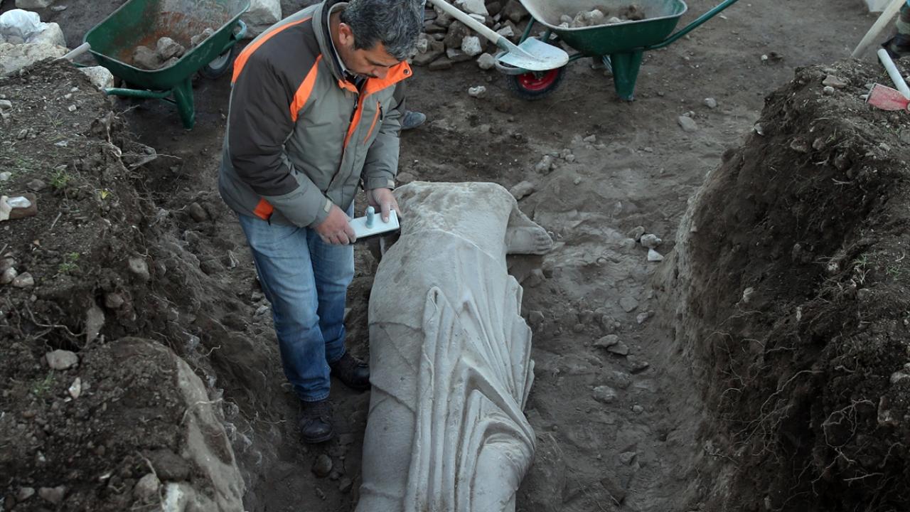Uşak Üniversitesi Arkeoloji Bölümü Öğretim Üyesi Prof. Dr. Birol Can başkanlığında yürütülen çalışmalar sırasında, kentin merkezinde yer alan tapınağın avlusunda iki heykel bulunduğu fark edildi.
