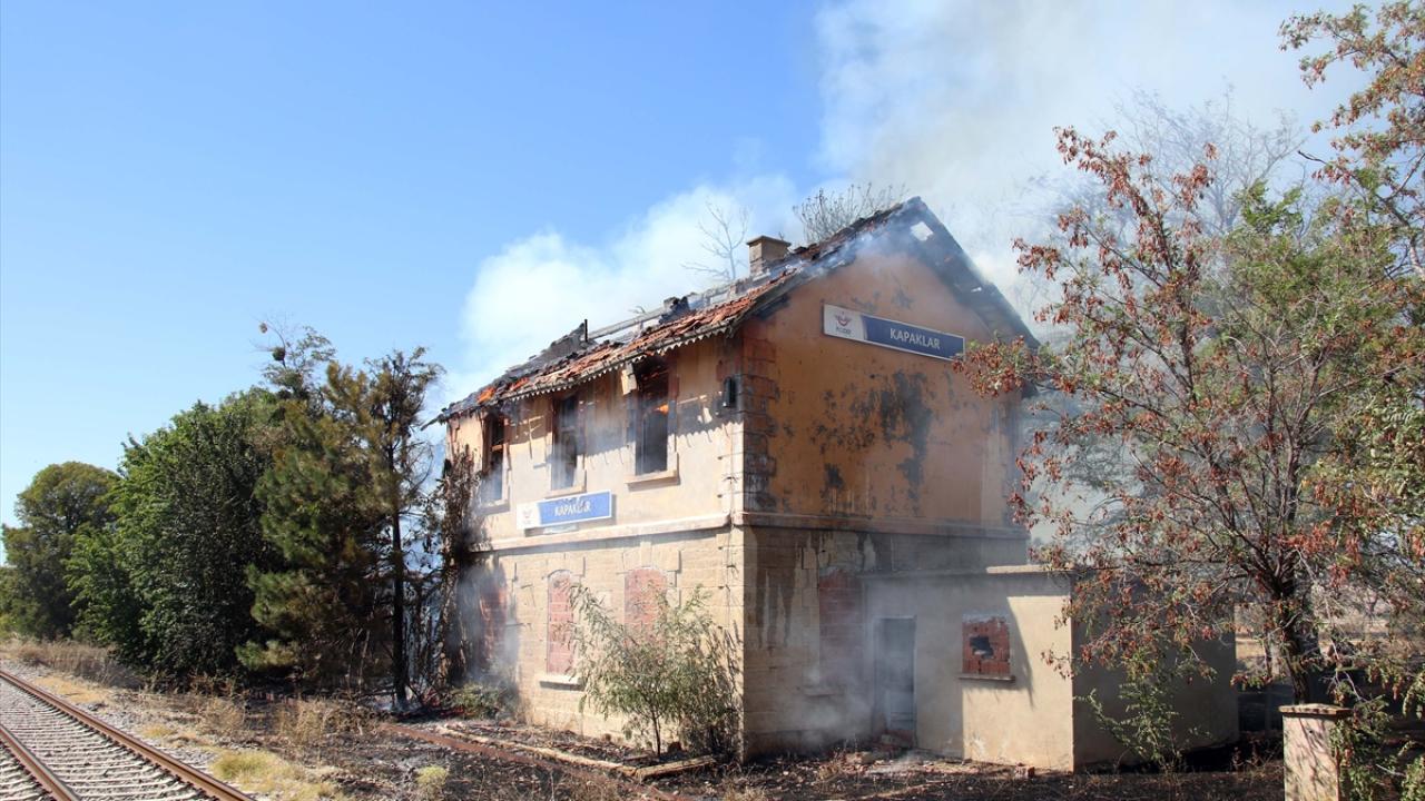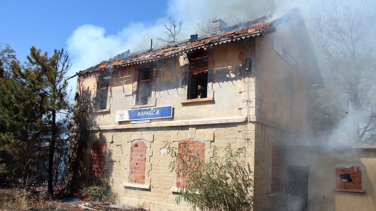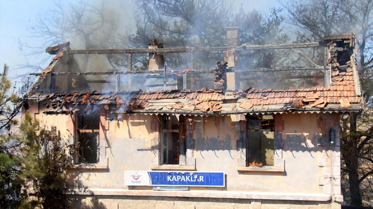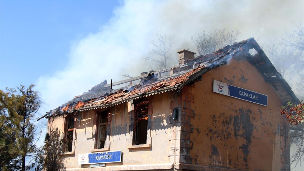 Rüzgarın da etkisiyle büyüyen yangın, İzmir-Ankara tren yolu hattındaki Kapaklar Tren İstasyonu binasına sıçradı.