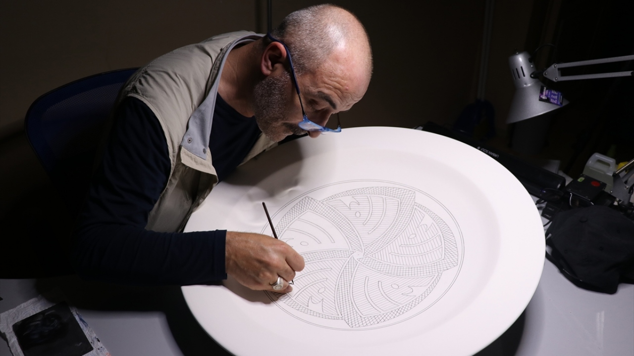 Kütahyalı Kültür ve Turizm Bakanlığı çini ve seramik sanatçısı Fahri Çetinkaya, çininin yapım aşamasında elmas uç kullanarak eserlerine farklı bir boyut kazandırdı.