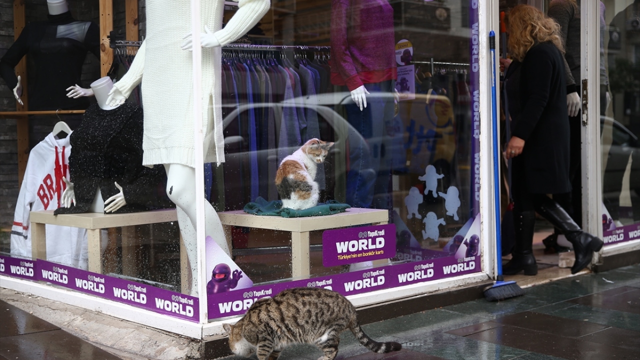 Antalya'da bir grup iş yeri sahibi, elbiselerin sergilendiği vitrinleri ve oturdukları koltukları sokakta üşüyen kedilere açarak, görenlerin takdirini topluyor.