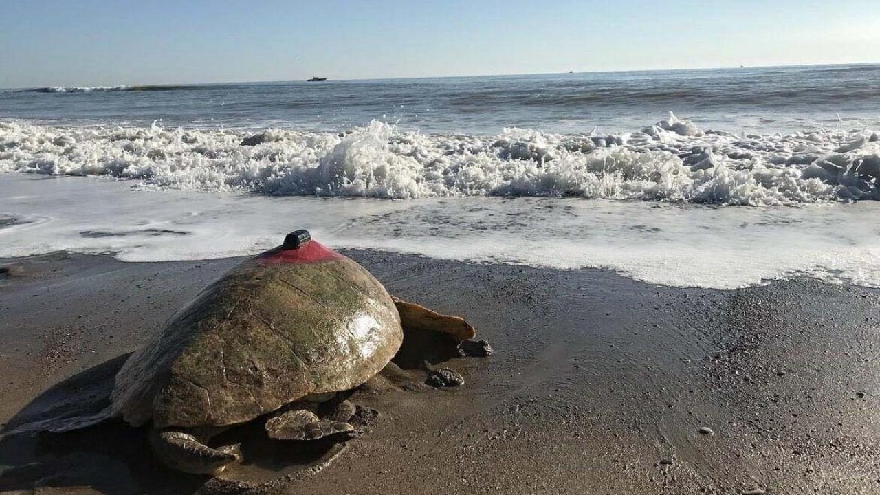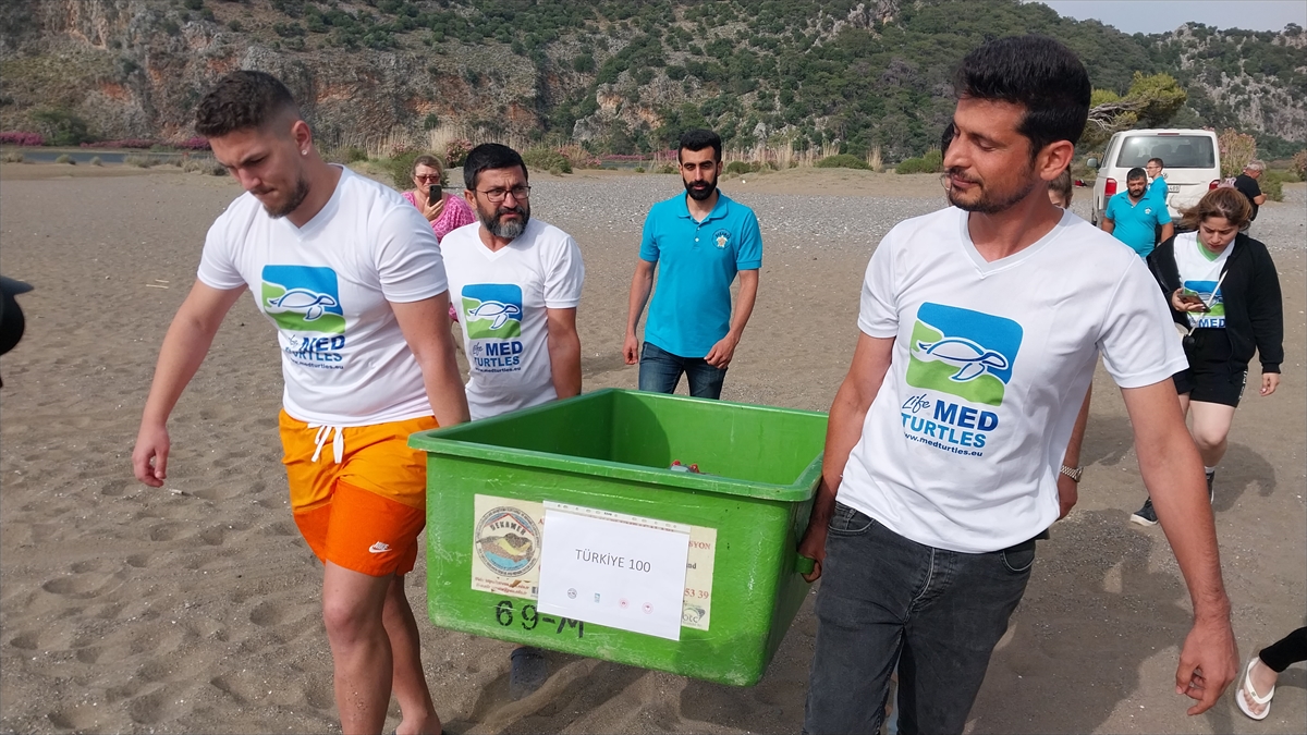 Ortaca ilçesindeki İztuzu kumsalına yumurta bıraktıktan sonra DEKAMER görevlileri tarafından güneş enerjili uydu takip cihazı takılan ve Cumhuriyet`in 100. yılı dolayısıyla "Türkiye 100" ismi verilen 58-63 yaşlarındaki deniz kaplumbağası, denizle buluşturuldu.
