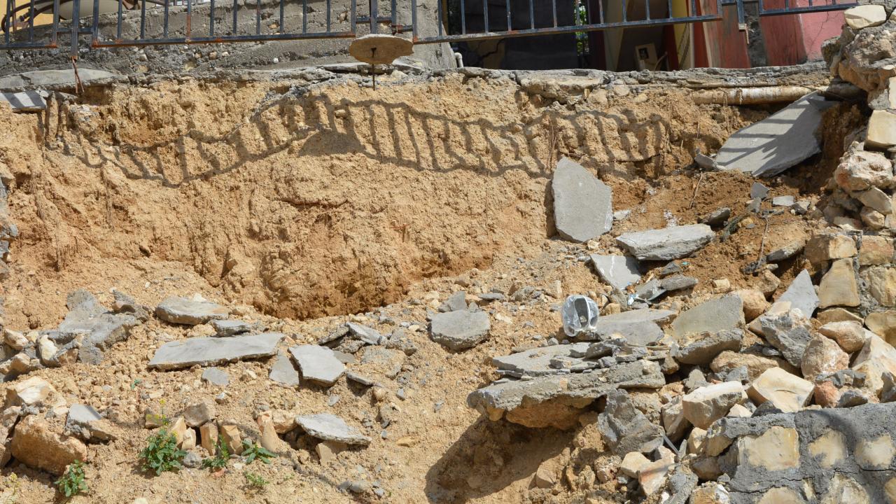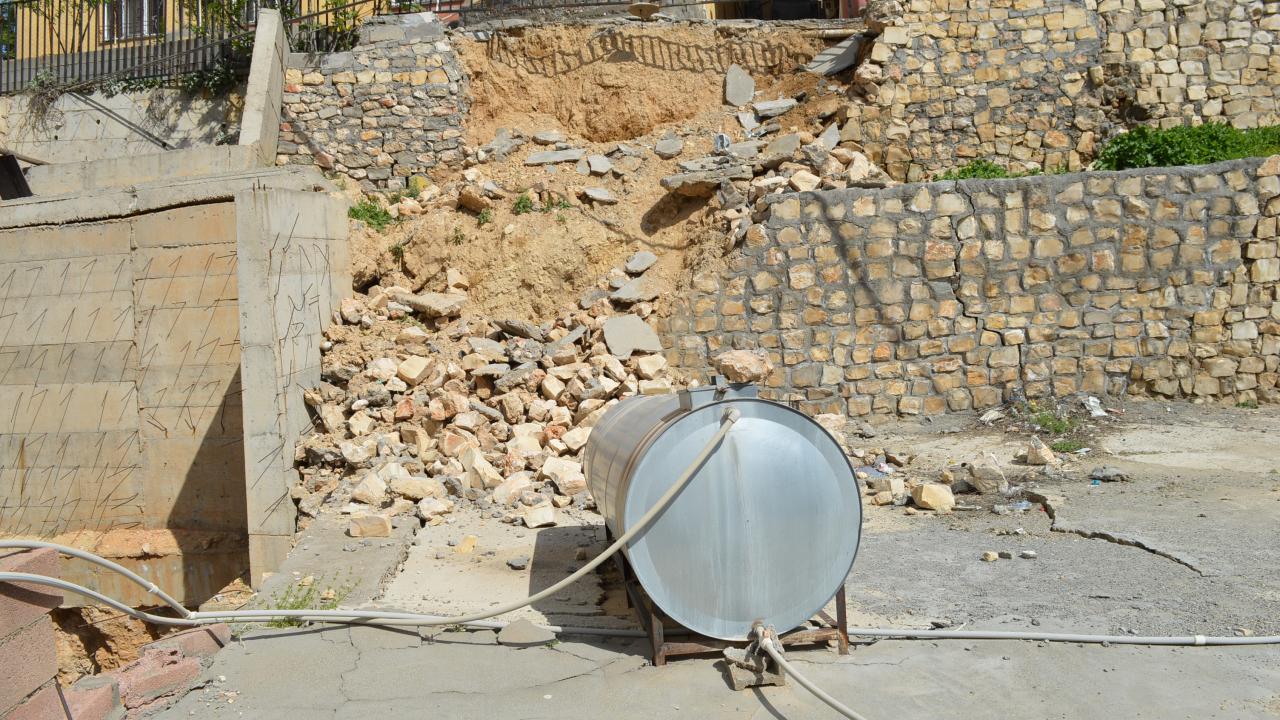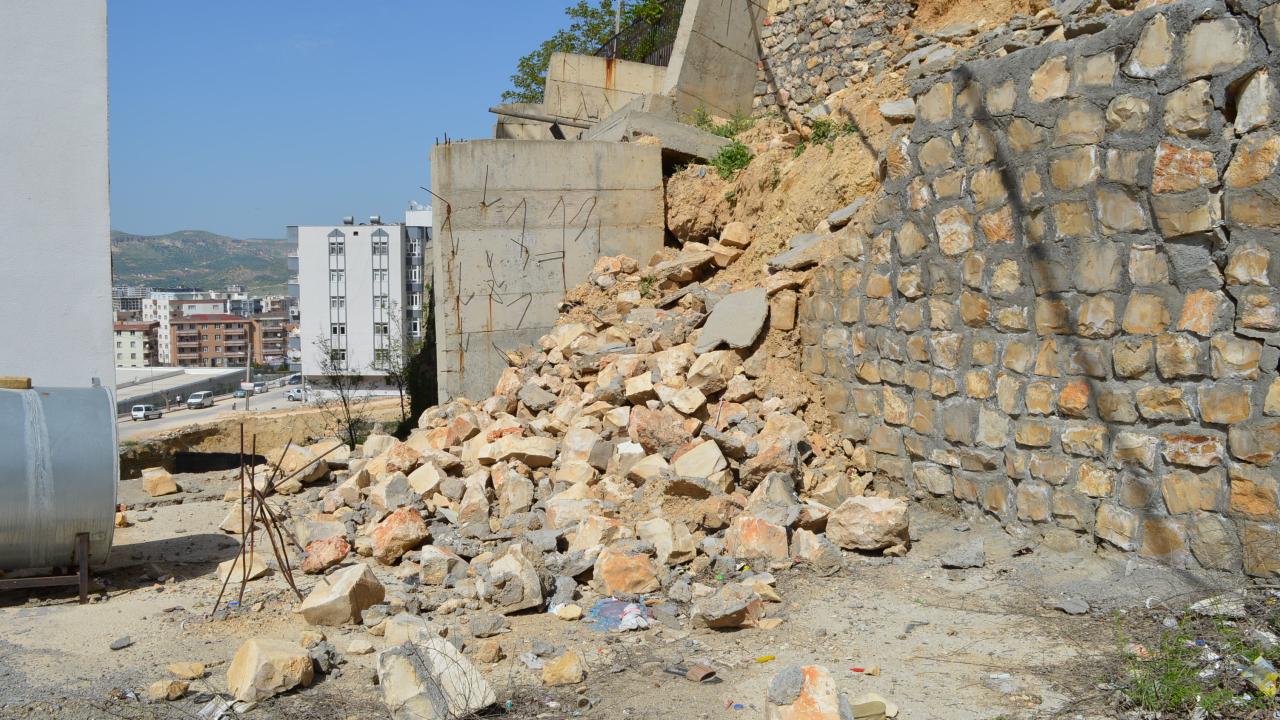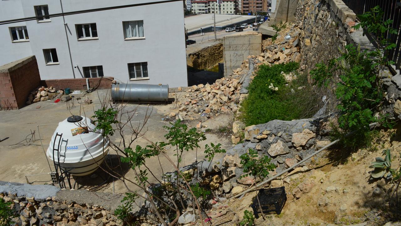 Stadyum Caddesi’ndeki istinat duvarı, kot farkından dolayı aşağıda kalan bitişiğindeki 2 katlı müstakil evin üzerine çöktü.