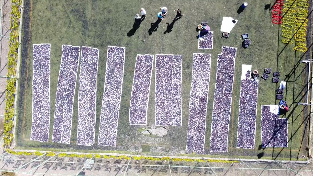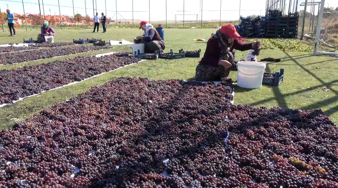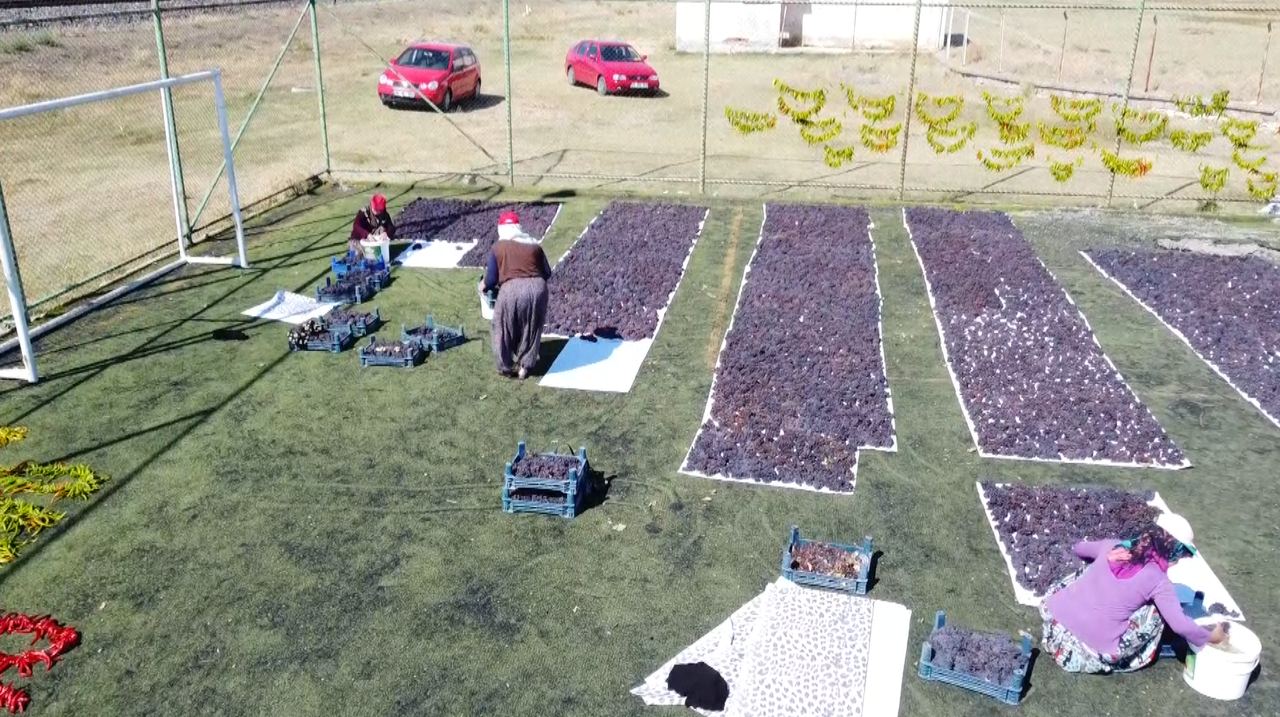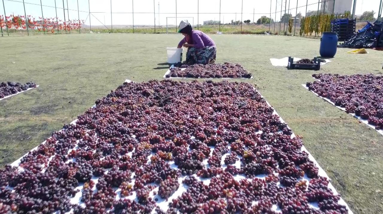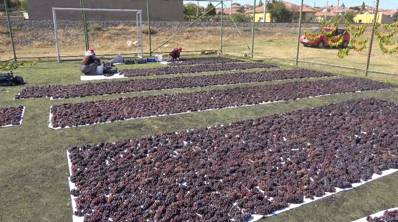 Üzümler halı sahada kurutuluyor