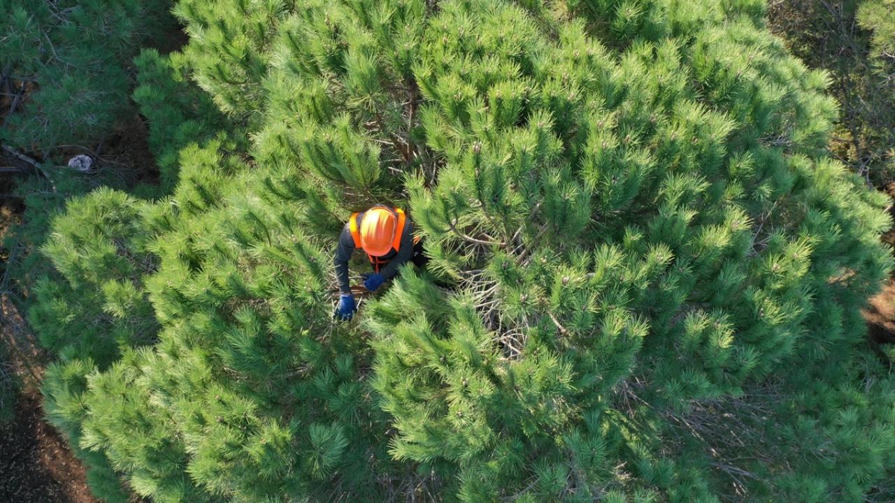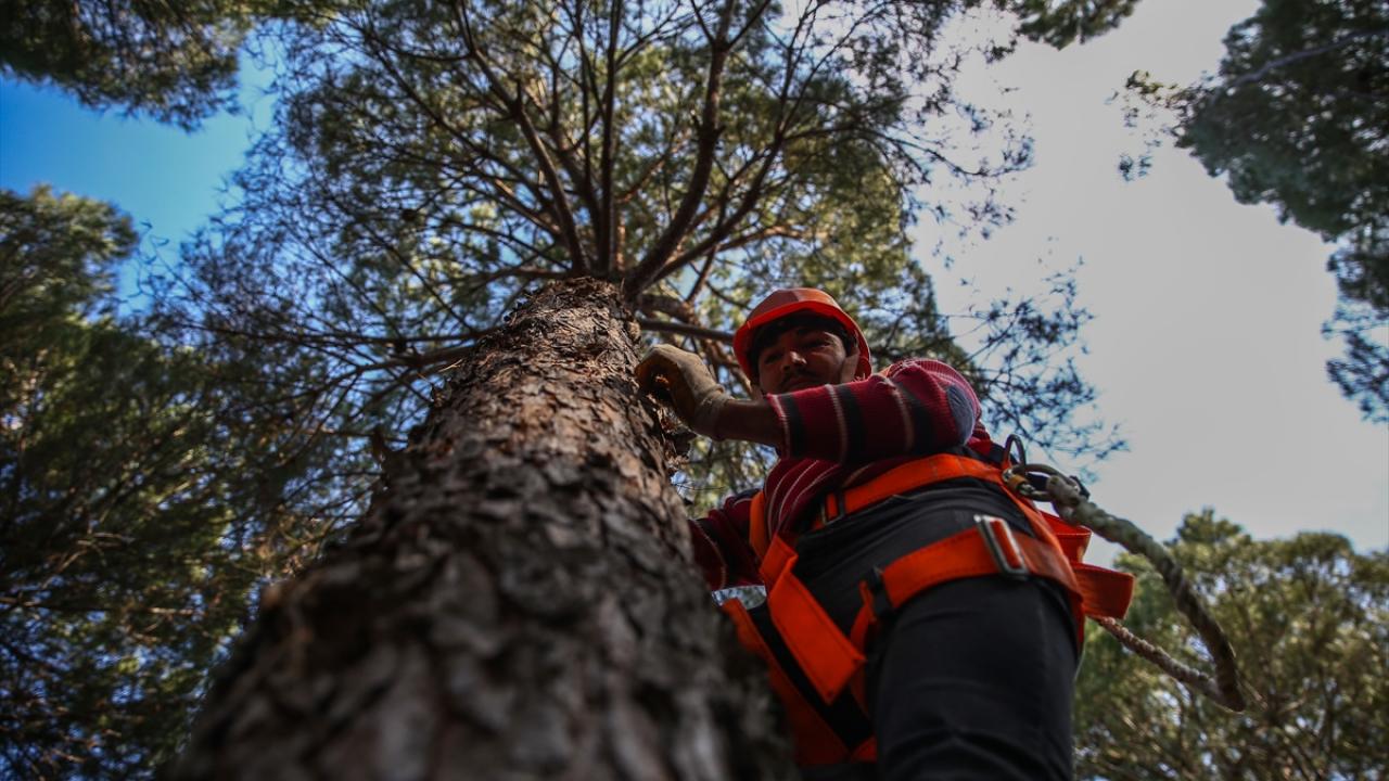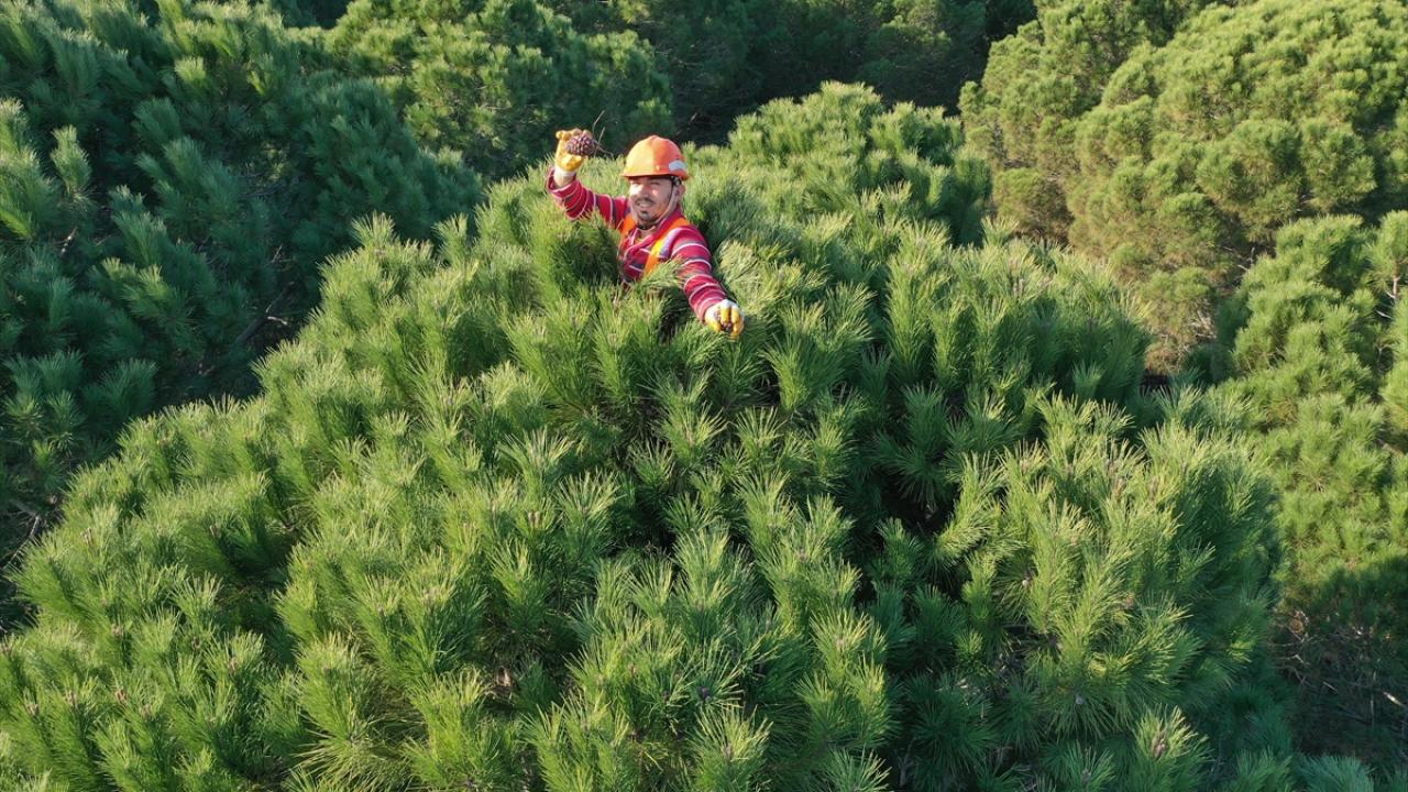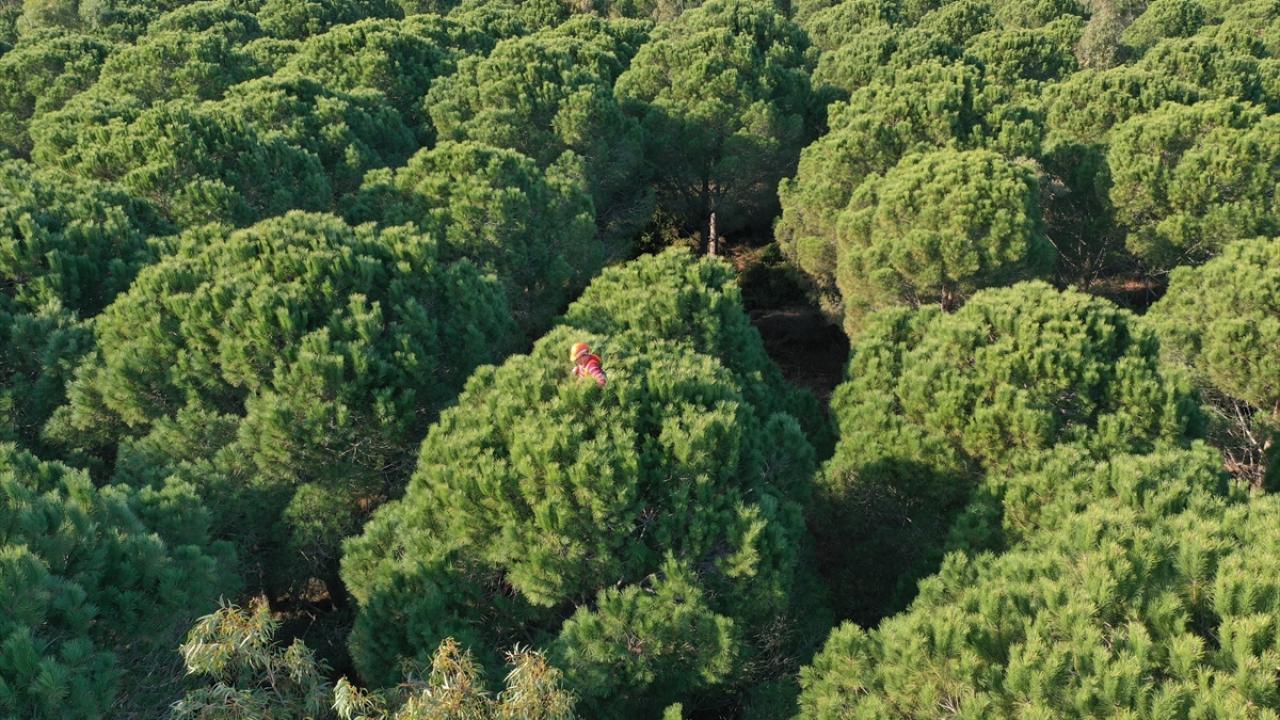 Adana çam fıstığının elde edildiği kozalakları toplayan işçiler, yüksekliği zaman zaman 15 metreyi bulabilen ağaçların zirvelerinde zorlu bir çalışmayla para kazanıyor.