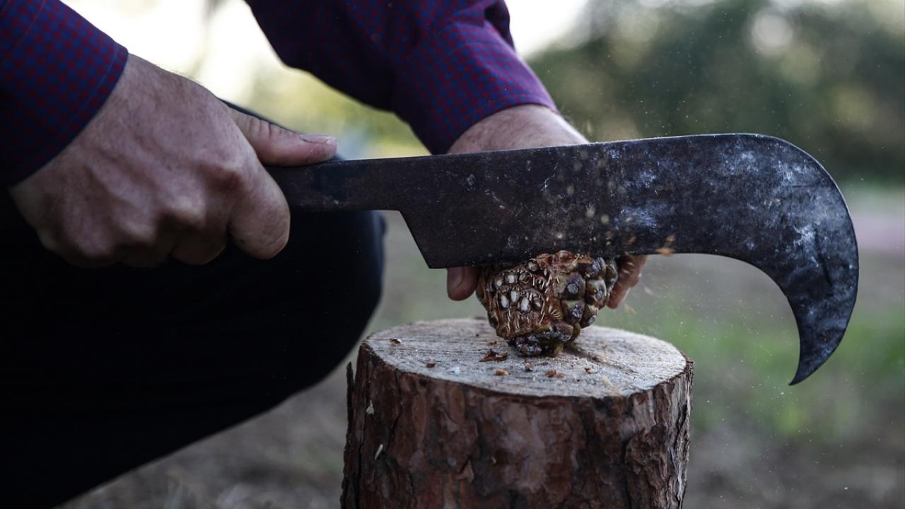 Ağaçlardaki olgunlaşmış kozalak miktarına göre çalışma süreleri değişen işçiler, günde ortalama 20 ağaca tırmanarak hasat yapıyor.