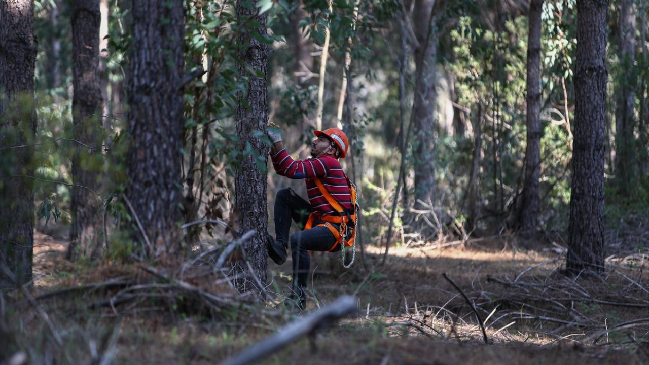 Yüksekliği zaman zaman 15 metreye ulaşan ve yaşları itibarıyla alt kısımlarında dalları olmayan ağaçların altına gelen işçiler, yılların getirdiği alışkanlıkla kısa sürede ağaçlara tırmanıyor.