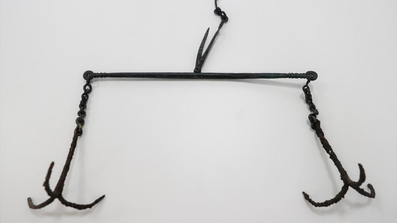 "Bu tür demir askılı baskül teraziler, Geç Antik Dönem`de oldukça yaygın. Daha da ilginci terazi takımıyla birlikte 5 ağırlık çıktı. Ağırlıklar Antik Yunan alfabesinin harfleri şeklinde yapılmış. Hepsi birbirinin katları şeklinde belli ağırlıklara sahip. O dönem `litra` denen ağırlık sistemi kullanılıyor. Elimizdeki ağırlıklar yarım litradan 5 litraya kadar yükseliyor. Bu da günümüz ölçülerinde yaklaşık 150 gram ila 1,5 kilogram arasındaki ağırlıklara karşılık geliyor. "
