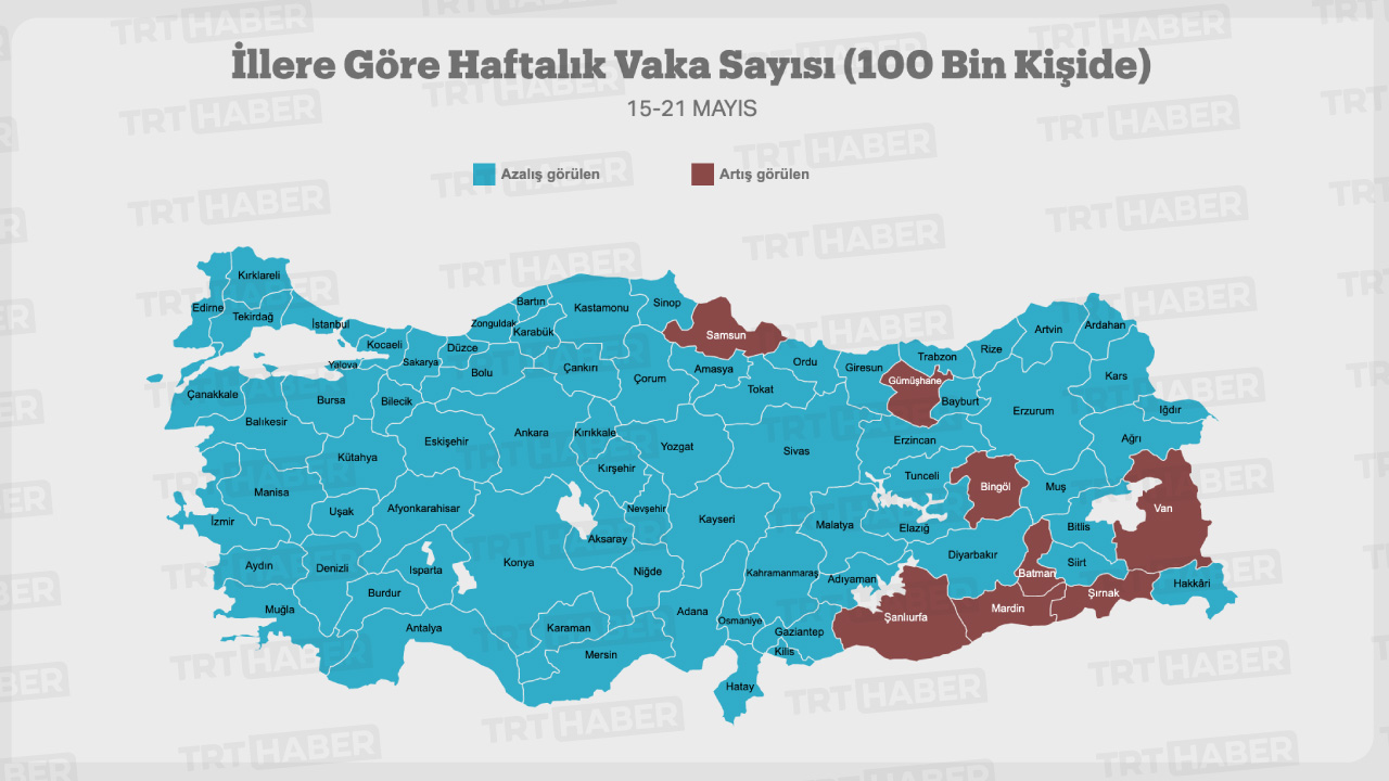 15-21 Mayıs tarihleri arasında illere göre her 100 bin kişide görülen vaka sayıları açıklandı. Bir önceki haftaya göre 73 ilde vaka sayıları azalırken, 8 ilin vaka sayılarında artış görüldü.