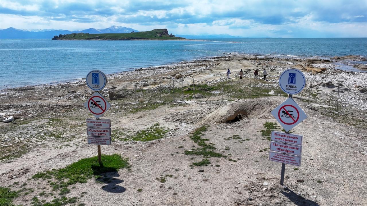 Kuraklık ve aşırı buharlaşmanın etkisiyle su kaybının yaşandığı Van Gölü`nde, kıyılardaki çekilme sonucu bazı tarihi yapılar, binlerce yılda oluşan mikrobiyalitler görünür hale geldi.