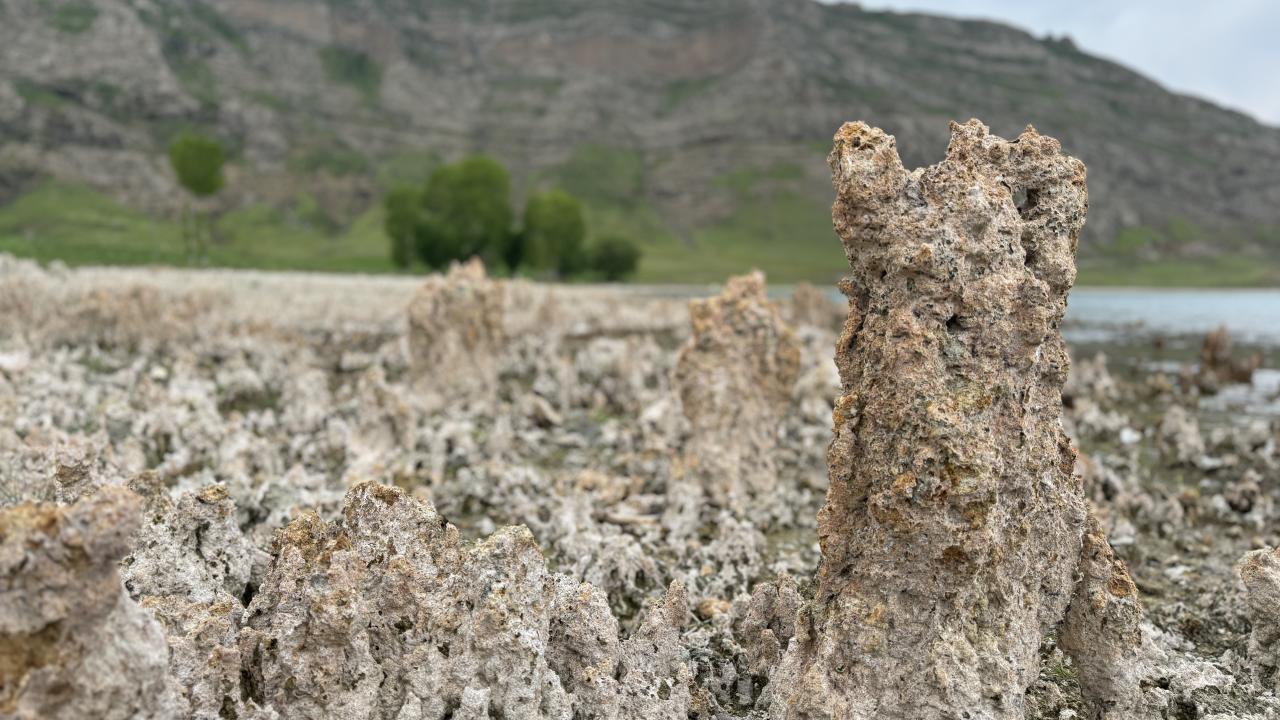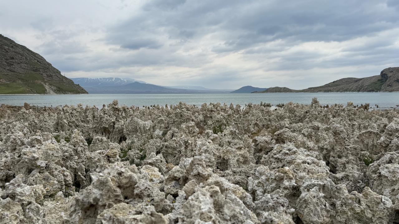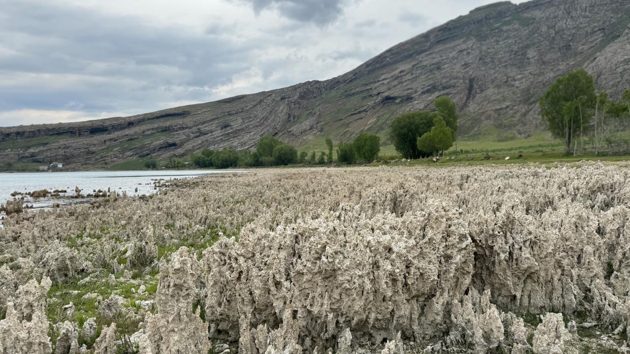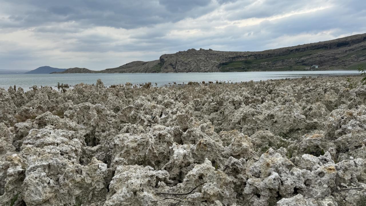 Dünyanın en büyük sodalı gölü olan Van Gölü’nde iklim değişikliğine bağlı yaşanan kuraklık nedeniyle suların çekilmesiyle ortaya çıkan mikrobiyalitler dikkat çekti.