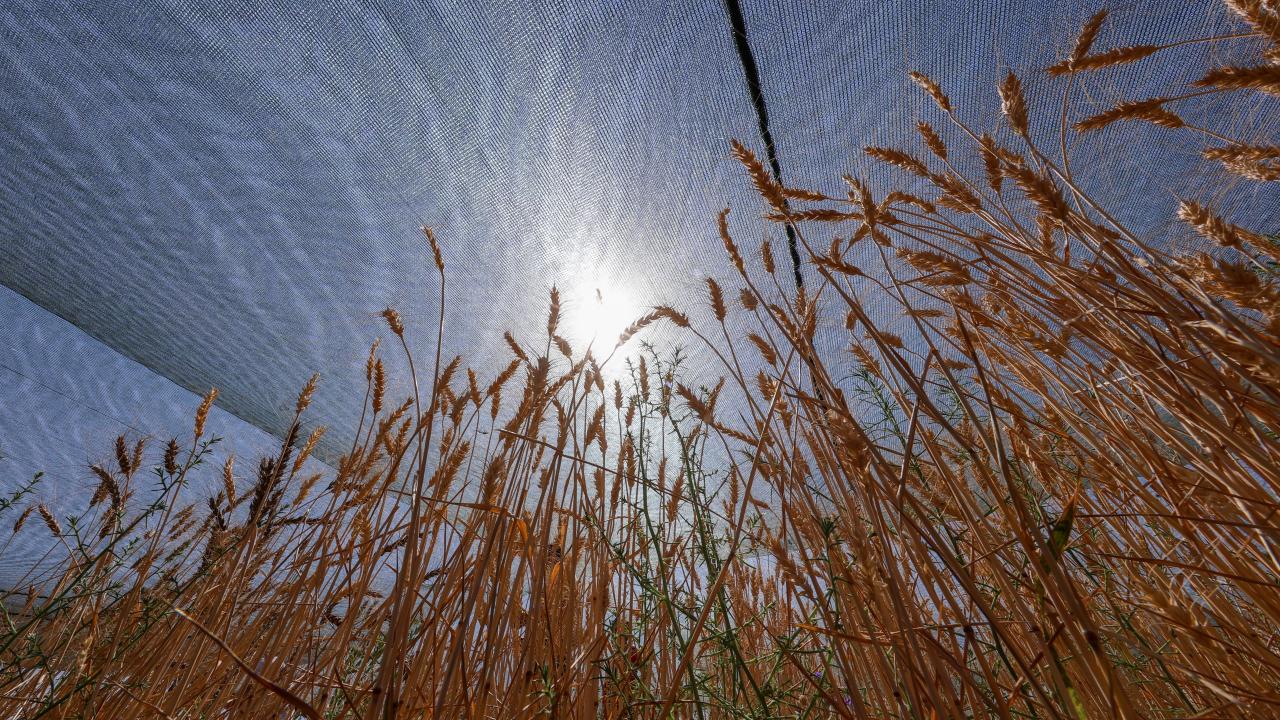 Çevresel faktörlerden etkilenmemeleri için etrafı fileyle kapatılan alanda yetiştirilen ve kışlık yetiştirme sezonu boyunca özenle bakılan buğdaylar hasat edildi.