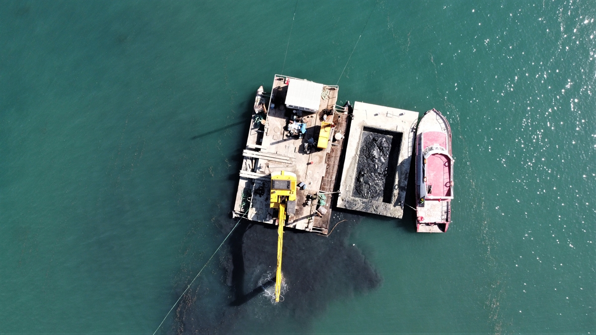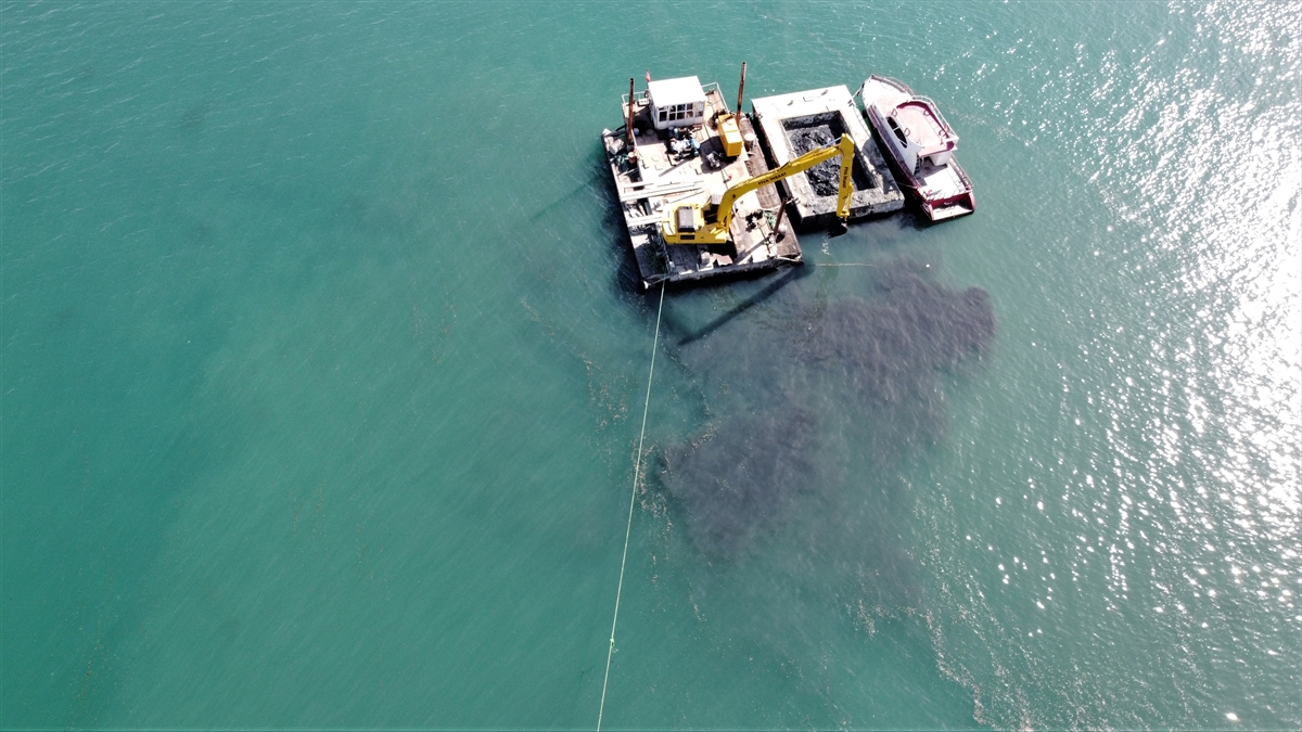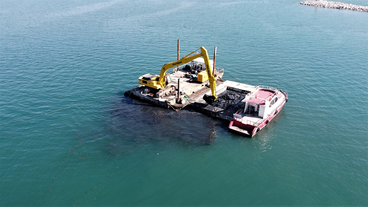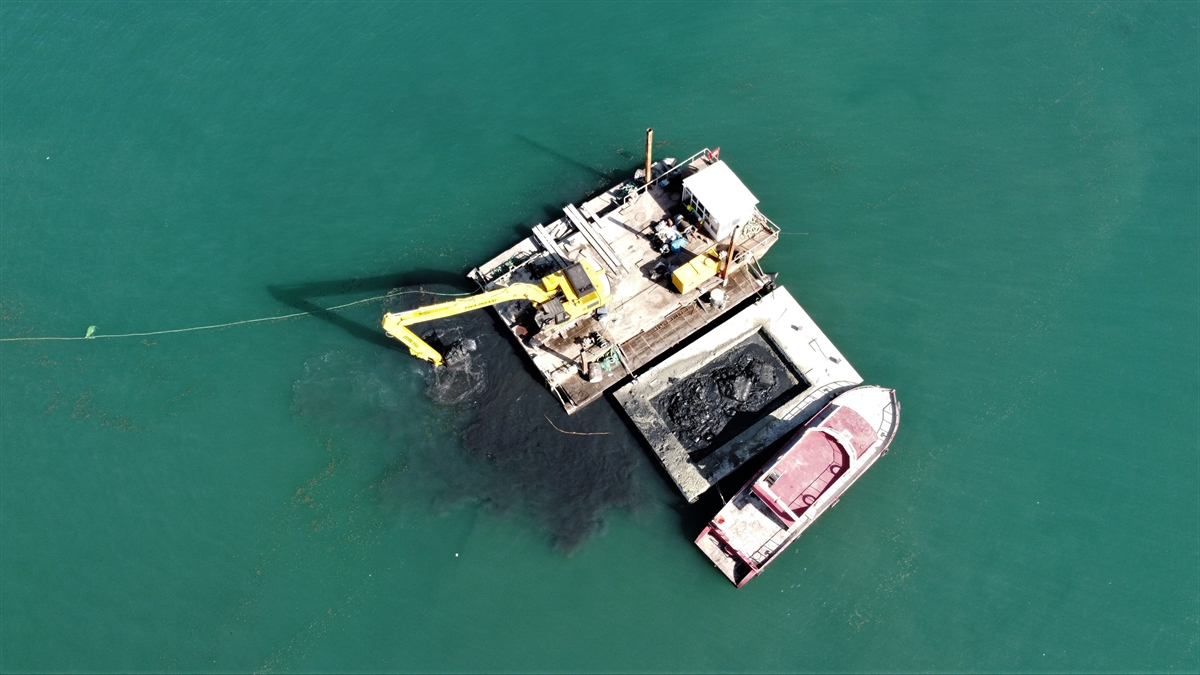 Van Gölü'nün kirlilikten kurtarılması amacıyla başlatılan dip çamuru temizleme çalışmaları kapsamında, İskele sahilinde 45 tonluk platform üzerindeki 17 metrelik paletli ekskavatörle 15 günde 6 bin metreküp balçık çıkarıldı.