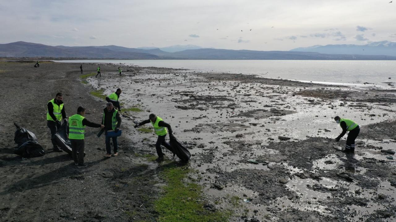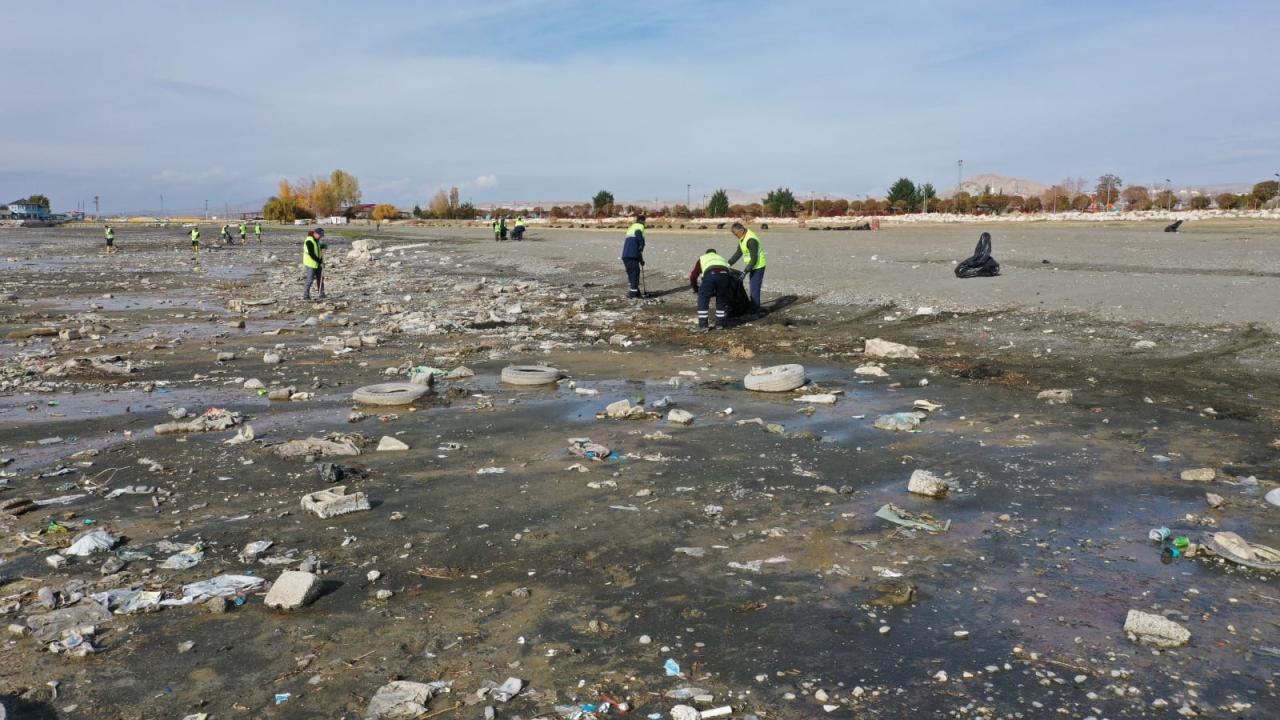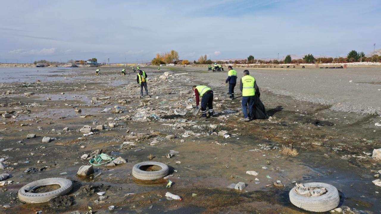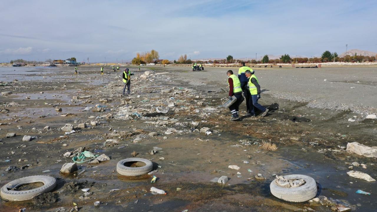 Çevre Koruma ve Kontrol Müdürlüğüne bağlı ekipler, göl kıyısında suların çekildiği bölgede yaklaşık 40 ton çöp toplayarak geri dönüşüme kazandırdı.