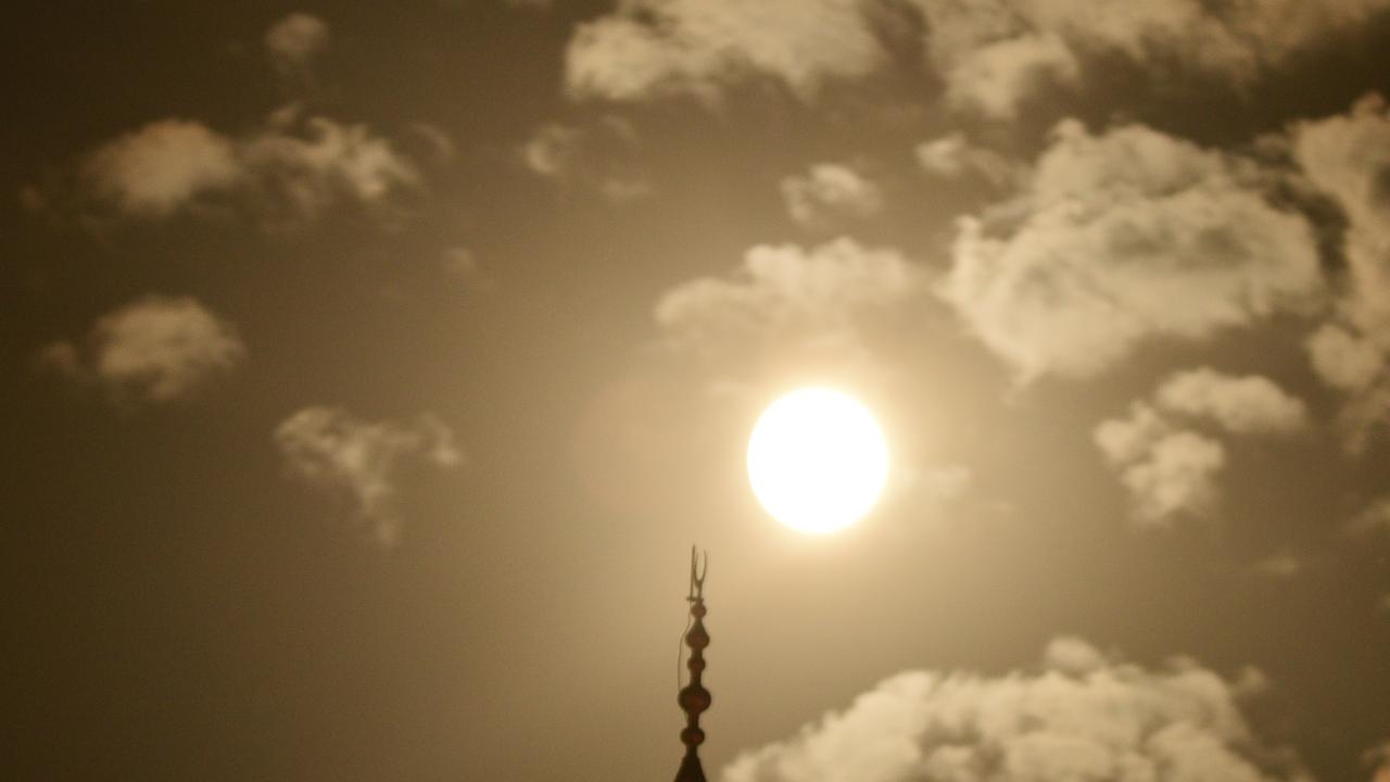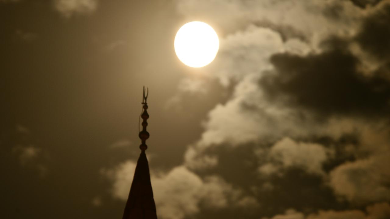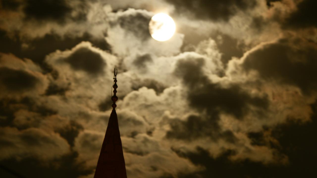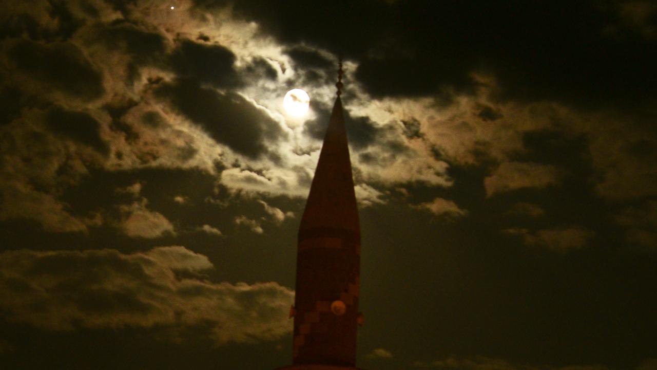 Dolunayın ağaç dalları, uçan kuşlar ve cami minareleri ile oluşturduğu manzara görenleri mest etti.