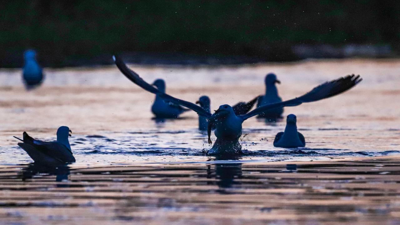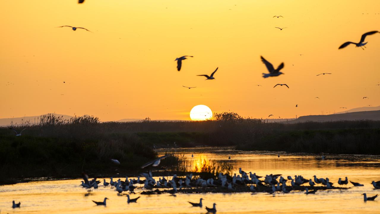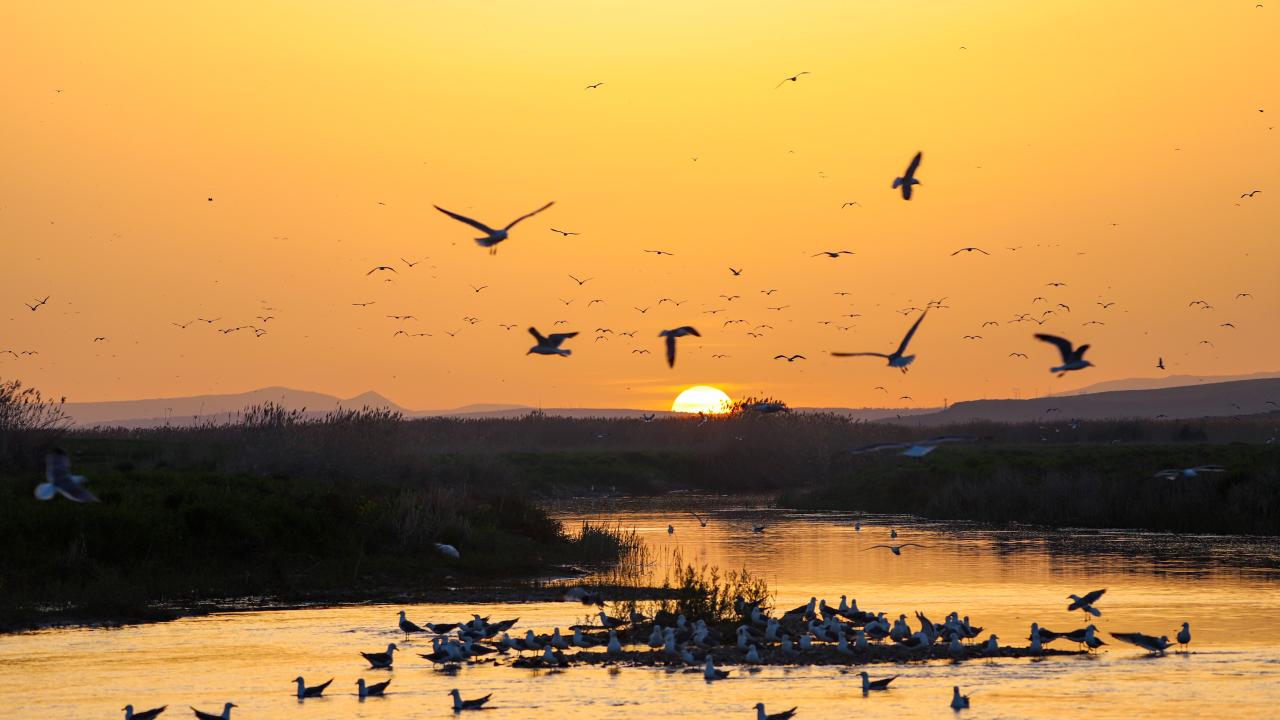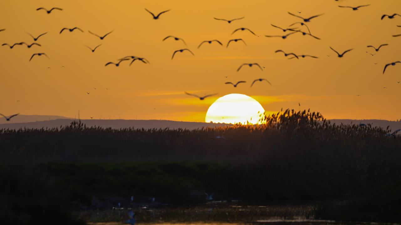 Van'ın Muradiye ilçesinde Van Gölü semalarında gün batımı sırasında gökyüzünde oluşan kızıllık, güzel görüntü oluşturdu. Martılar da akarsulara göç eden inci kefallerini avladı.