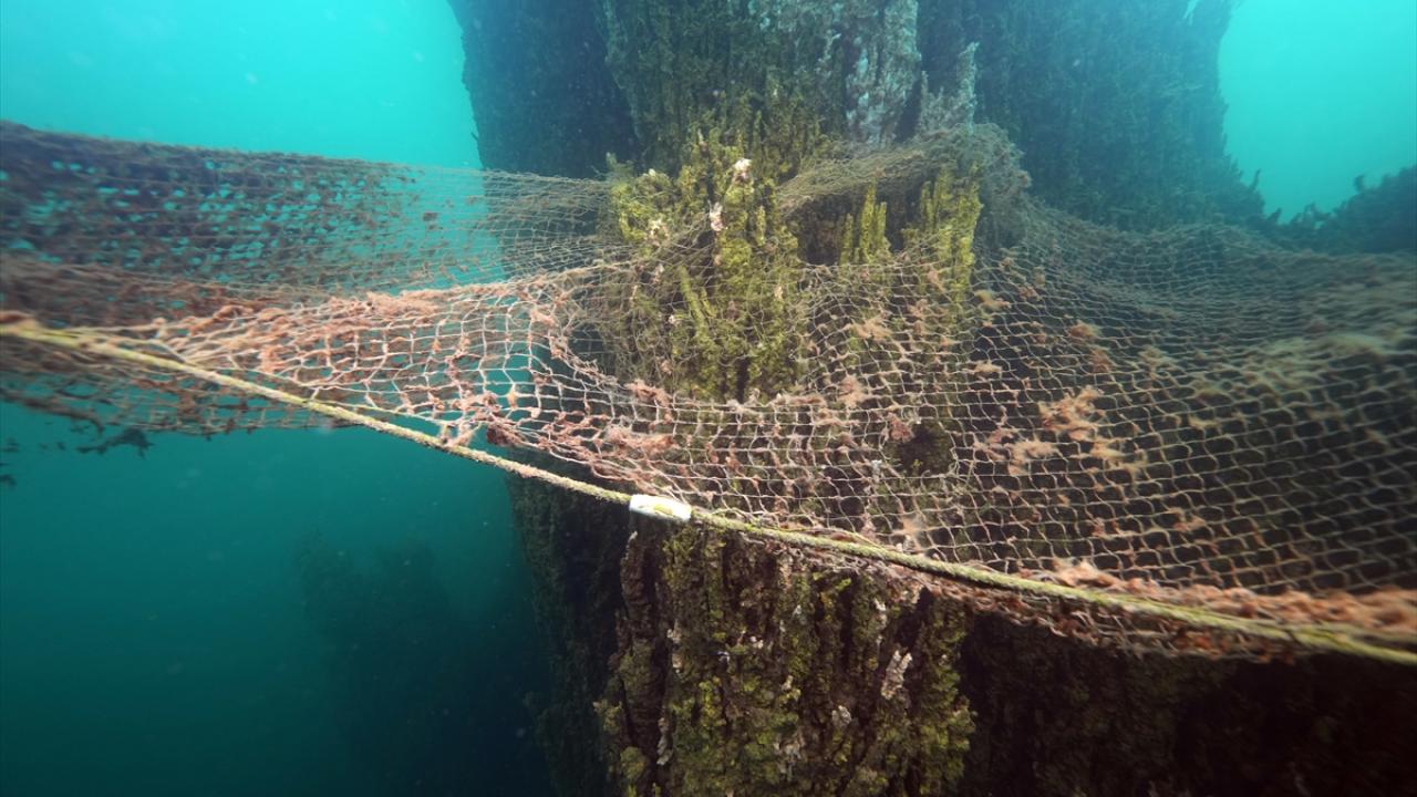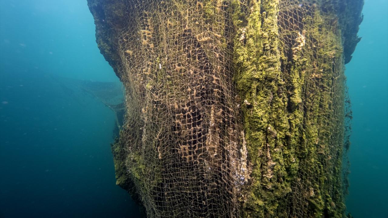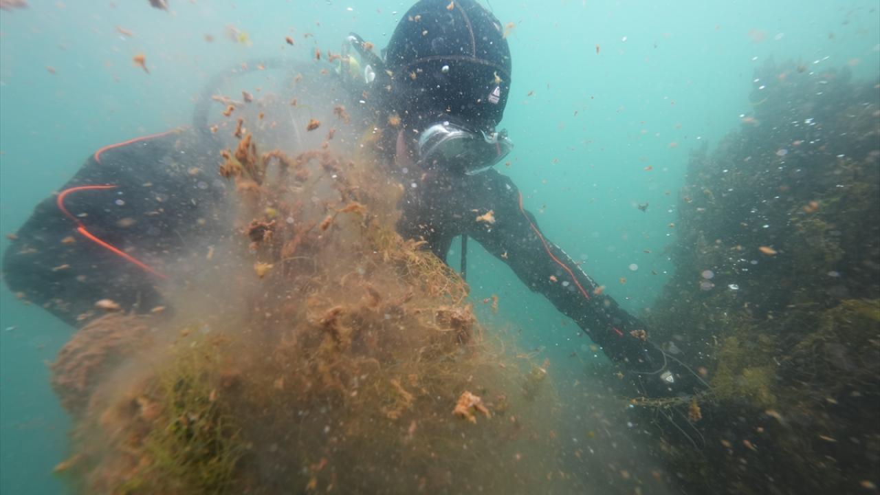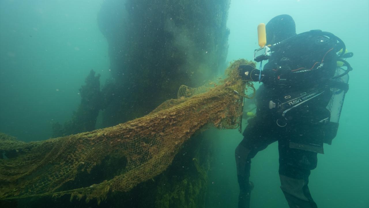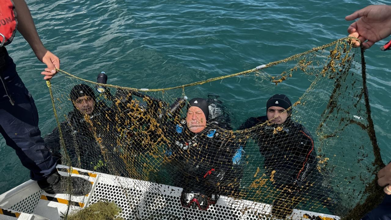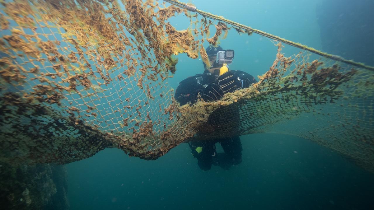 Mikrobiyalitlerin çevresini saran balıkçı ağları da dalış ekibi tarafından temizlendi.