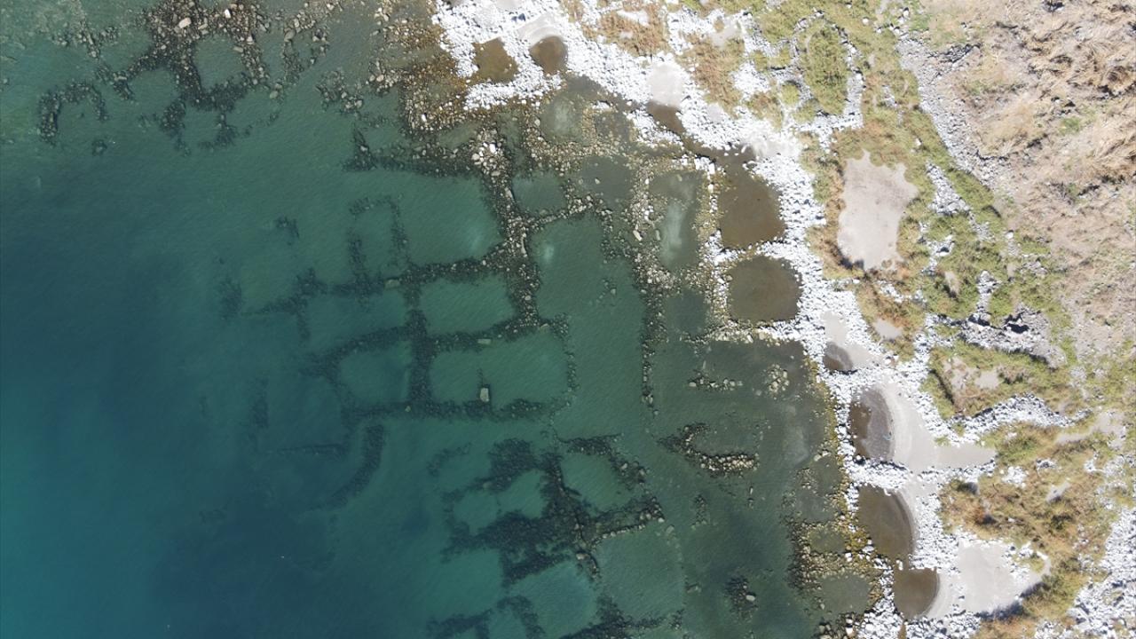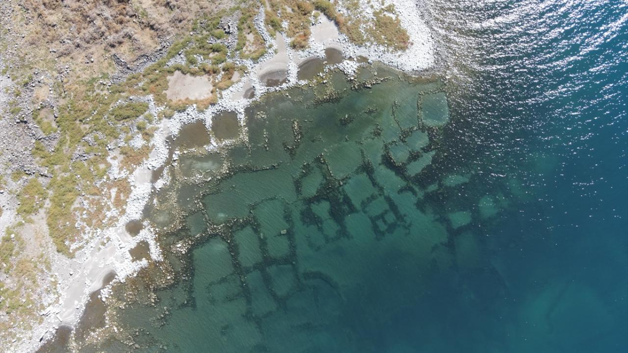 Sıcaklıkların artmasına bağlı buharlaşma ve yağışların azalmasıyla seviyesinde düşme yaşanan Van Gölü`nün kıyı kesimlerinde, geçmişte su altında kalan yapılar görünür hale geldi.