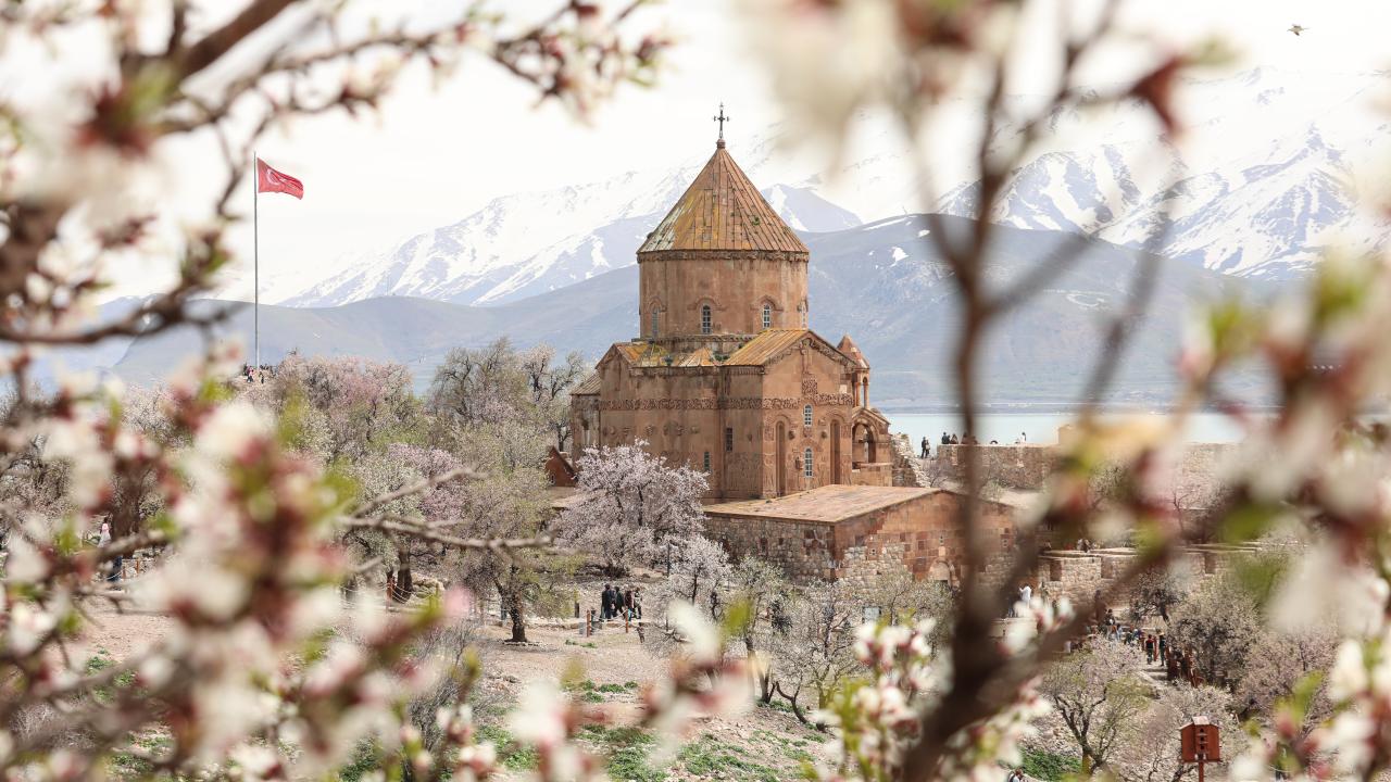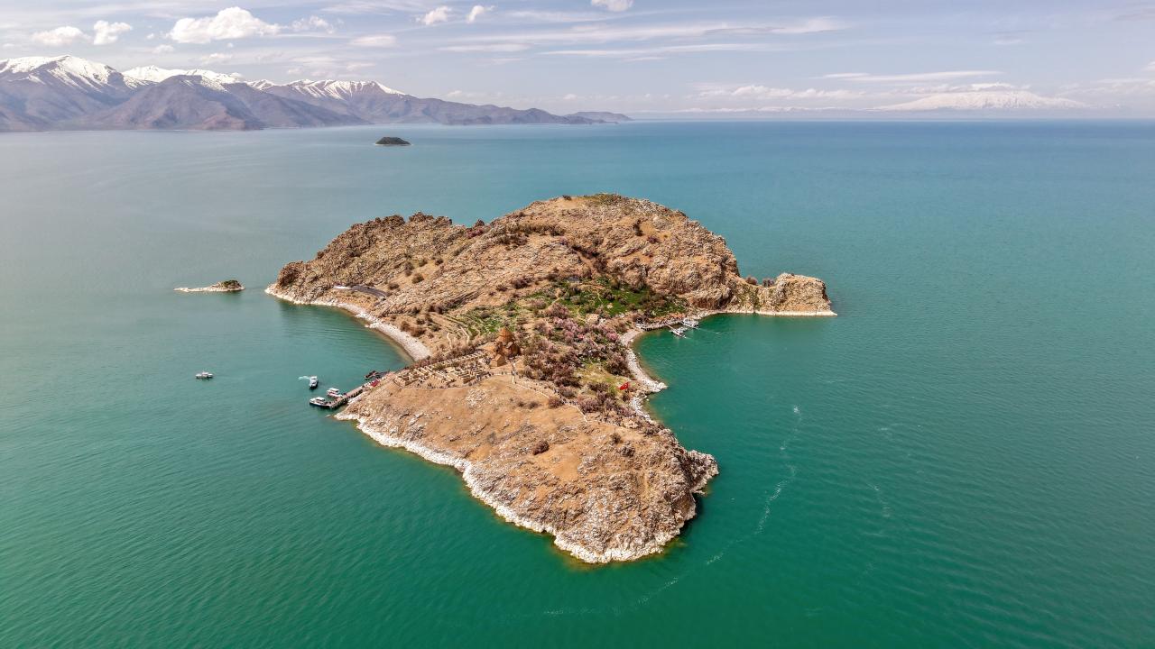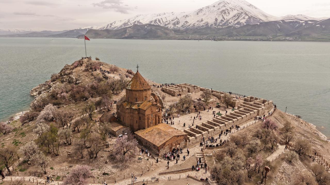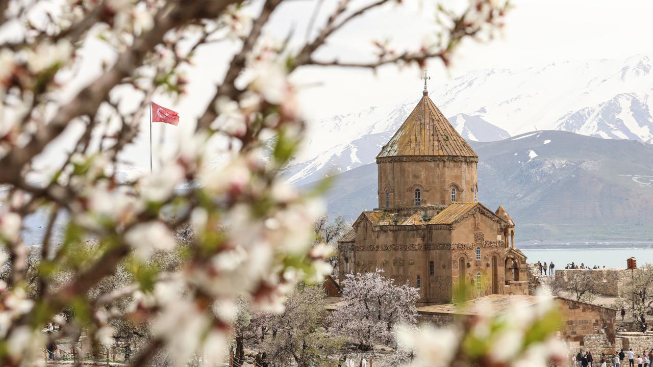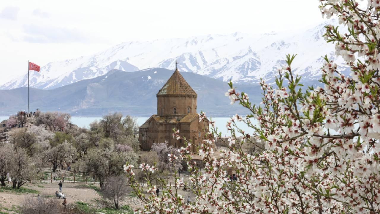 Özellikle drone görüntülerinde Van Gölü’nün mavisi, karlı Artos Dağı manzarası, ada üzerindeki beyaz ve pembe çiçekler ile kilisenin tarihi silueti aynı karede buluştu.