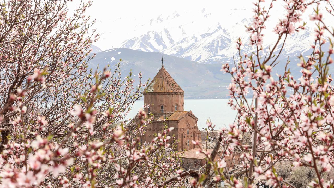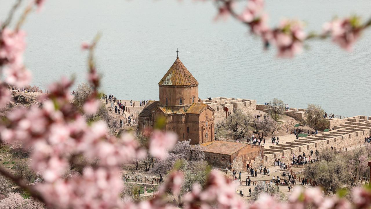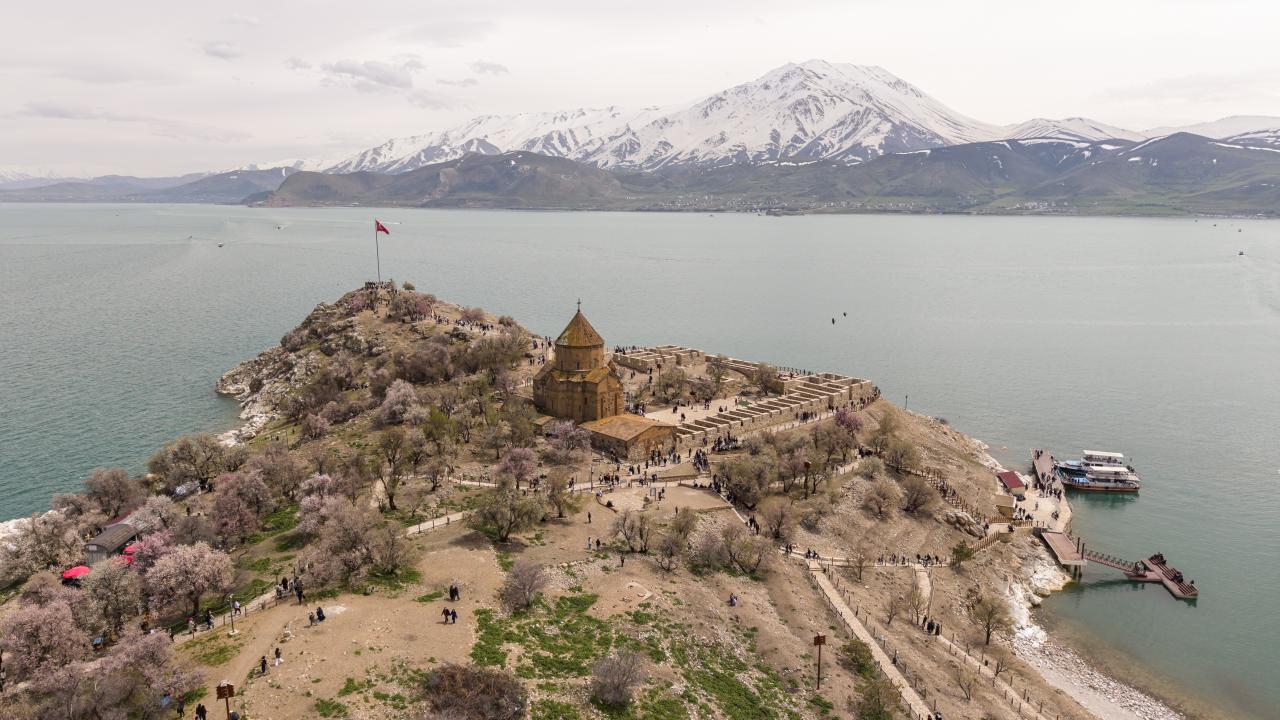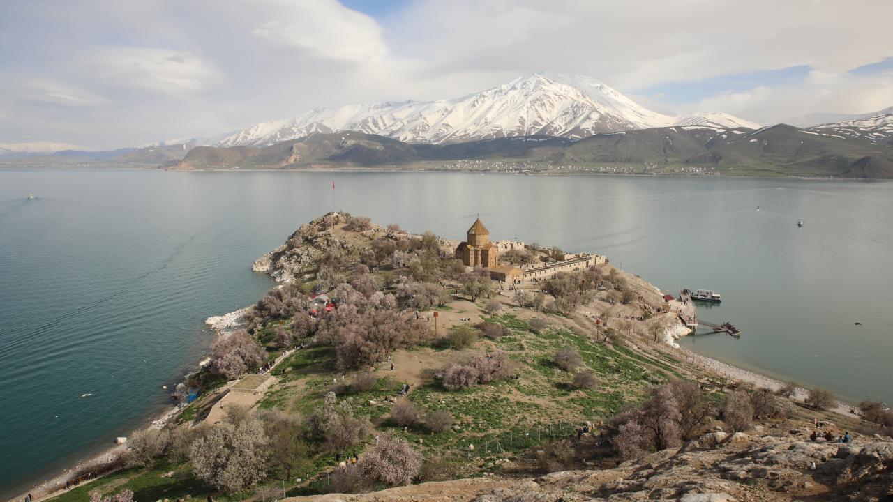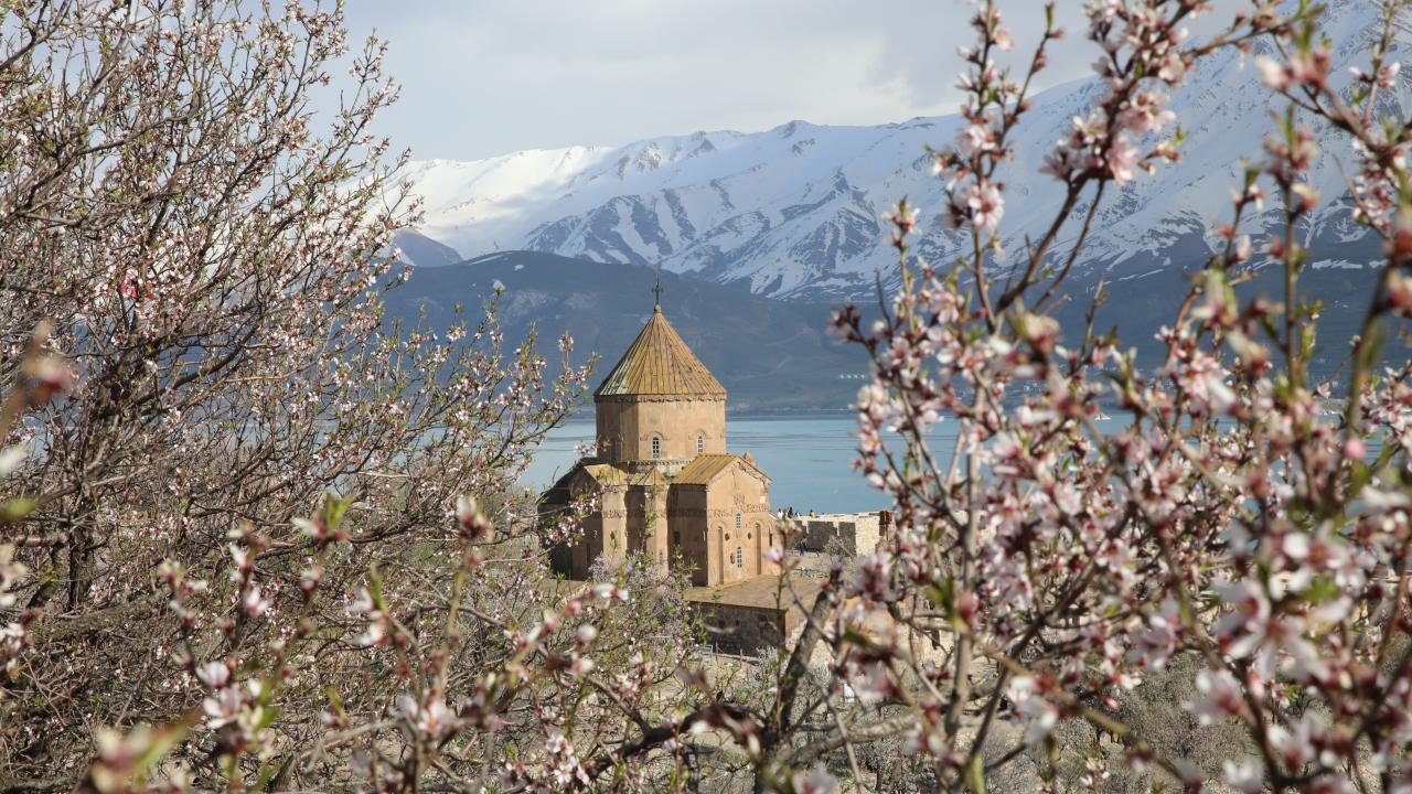 Özellikle drone görüntülerinde Van Gölü’nün mavisi, karlı Artos Dağı manzarası, ada üzerindeki beyaz ve pembe çiçekler ile kilisenin tarihi silueti aynı karede buluştu.