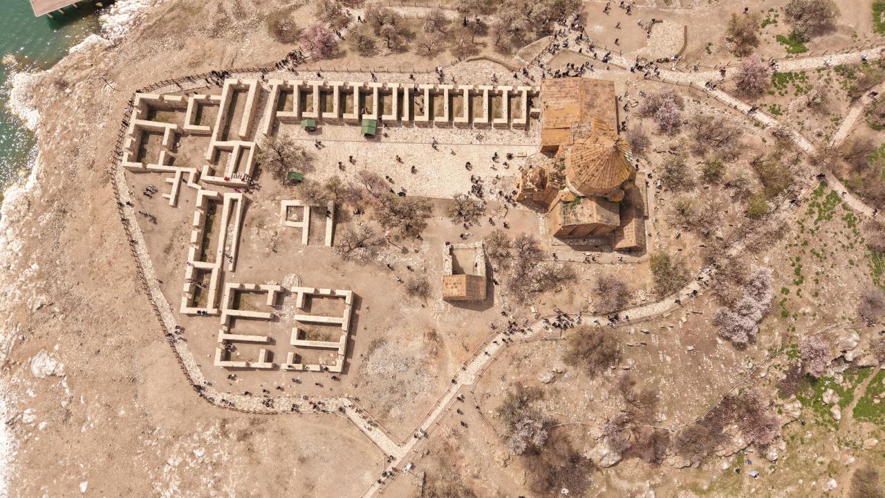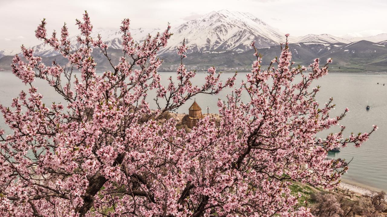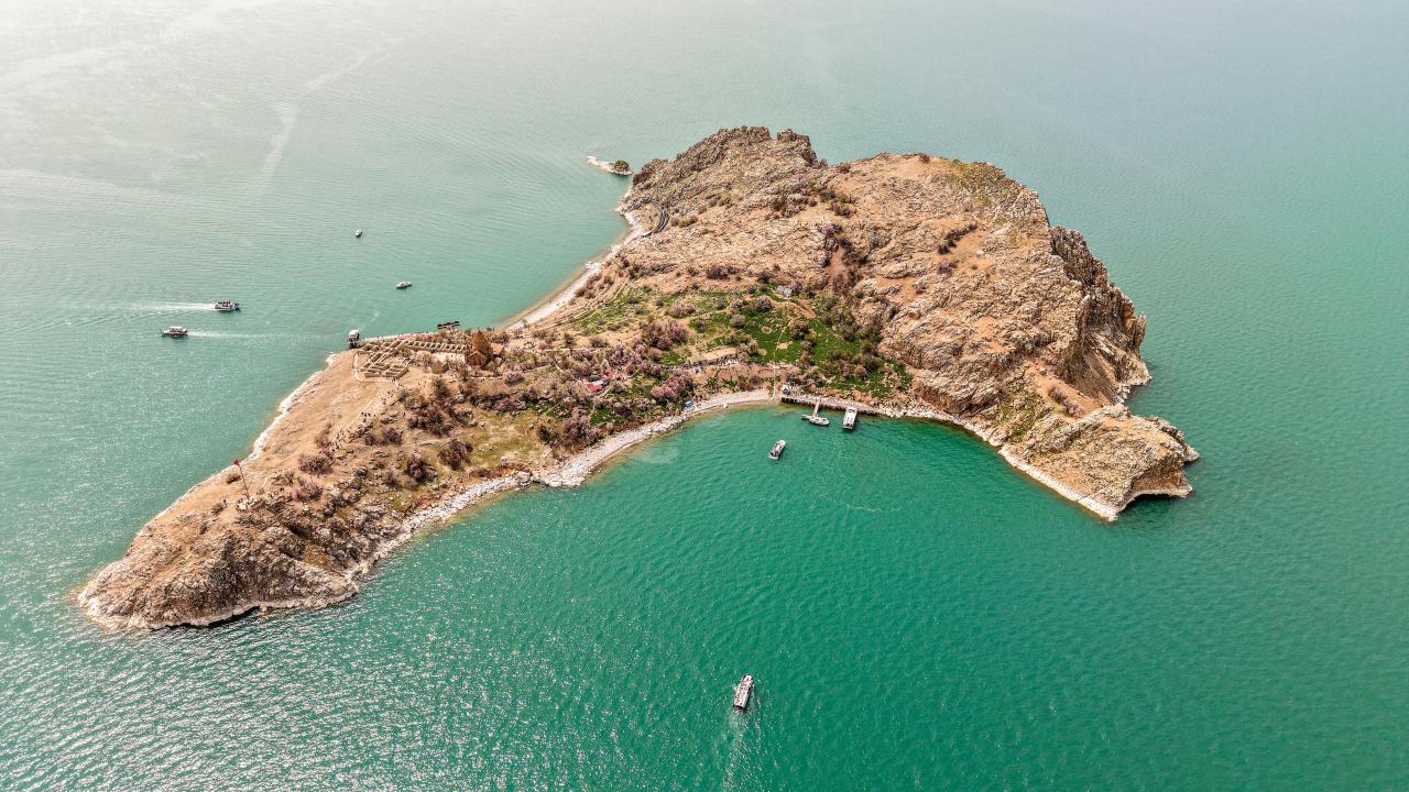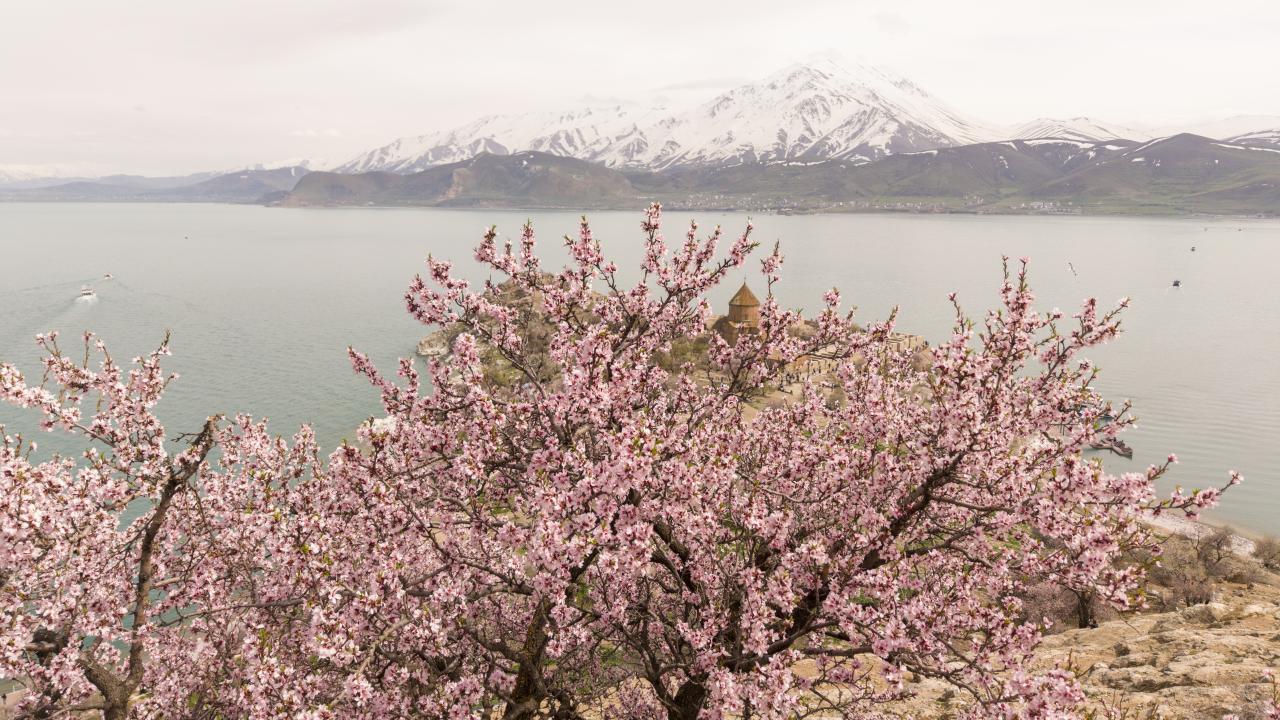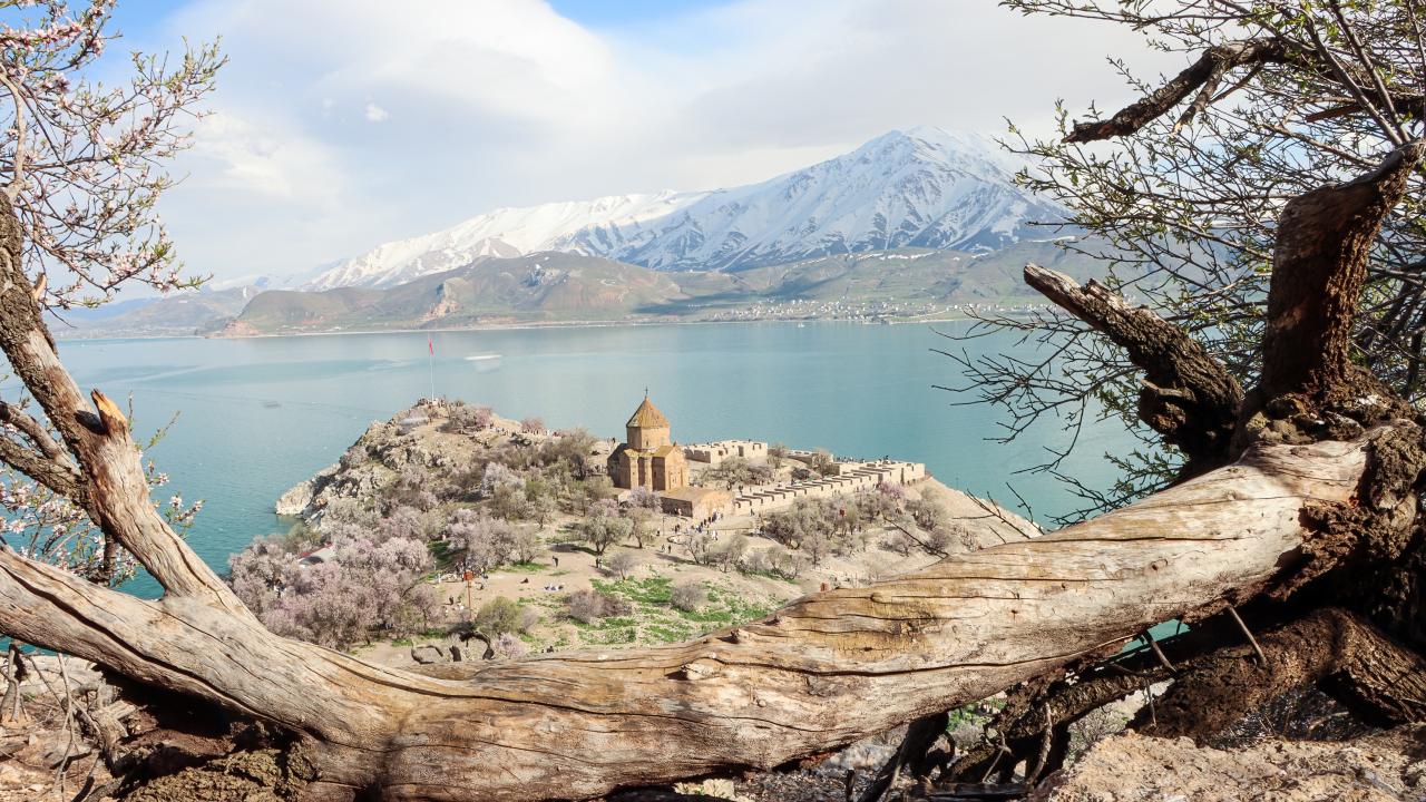 Özellikle drone görüntülerinde Van Gölü’nün mavisi, karlı Artos Dağı manzarası, ada üzerindeki beyaz ve pembe çiçekler ile kilisenin tarihi silueti aynı karede buluştu.