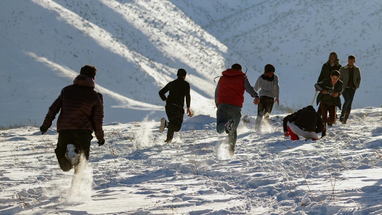 Soğuk havaya aldırış etmeden karlı tepedeki araziye çıkan mahalle sakinleri, eğlenceli anlara sahne olan oyunla günün yorgunluğunu atıyor.