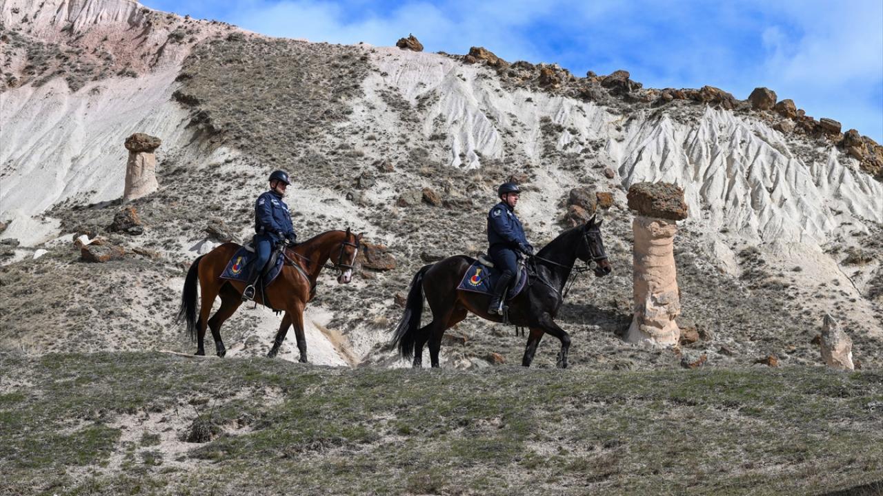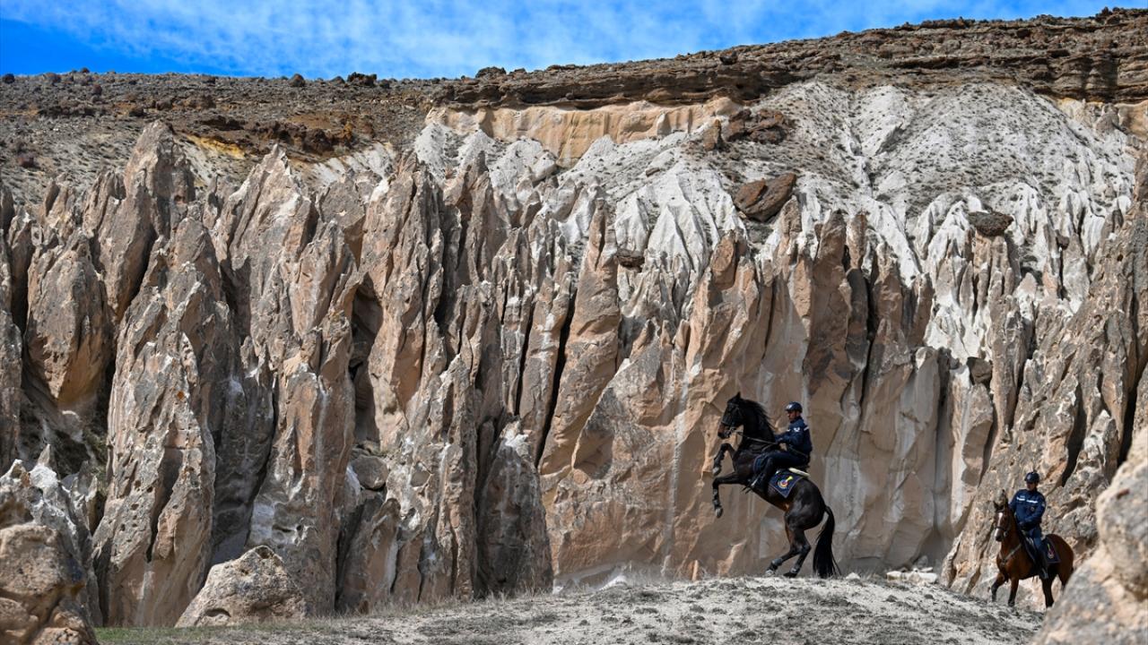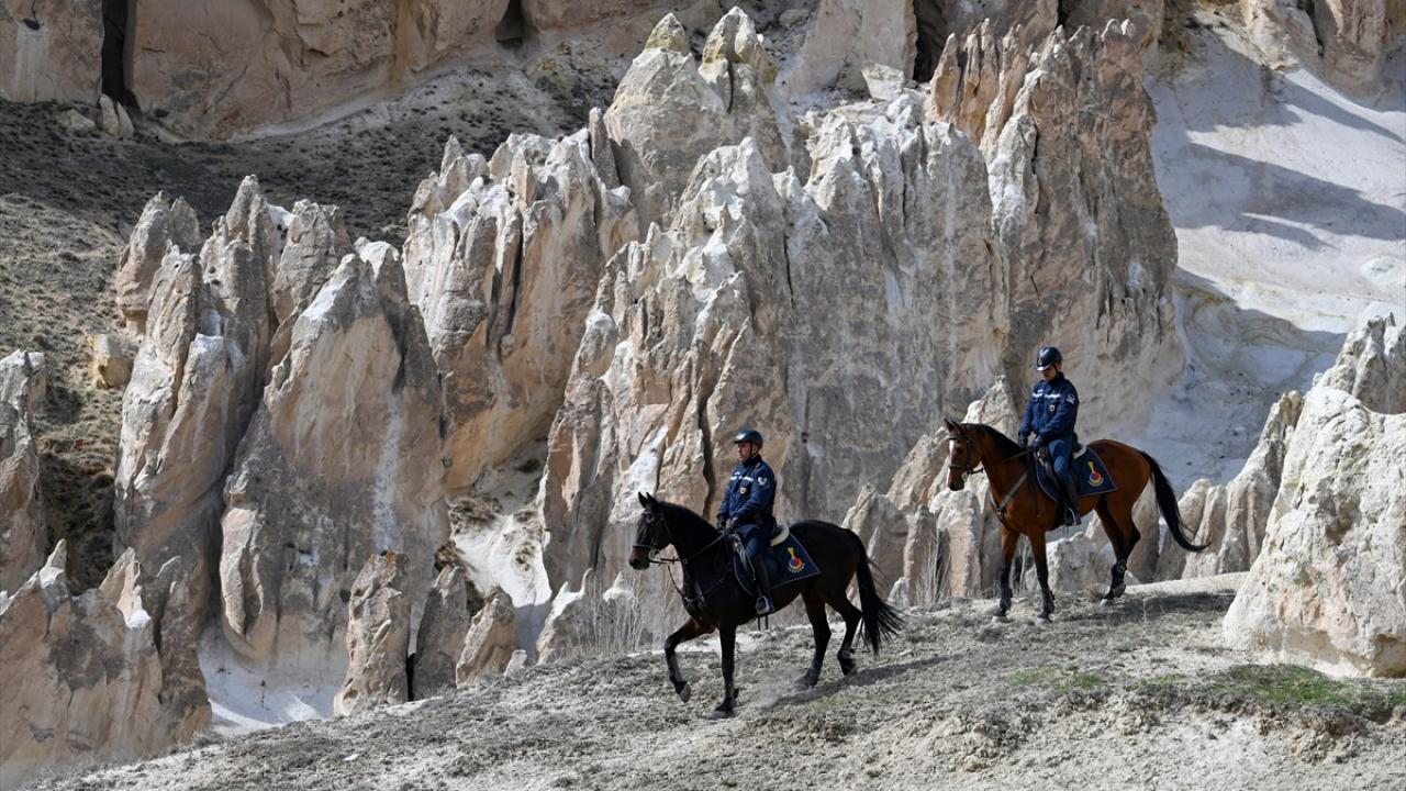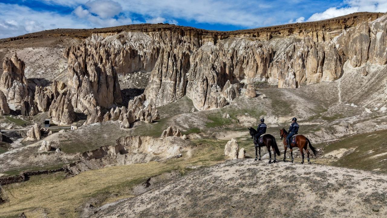 Van'ın Başkale ilçesinde "Vanadokya" olarak adlandırılan peribacalarının bulunduğu bölgede görev yapan atlı jandarma timi, hem ziyaretçilerin güvenliğini sağlıyor hem de turistik alanı koruyor.