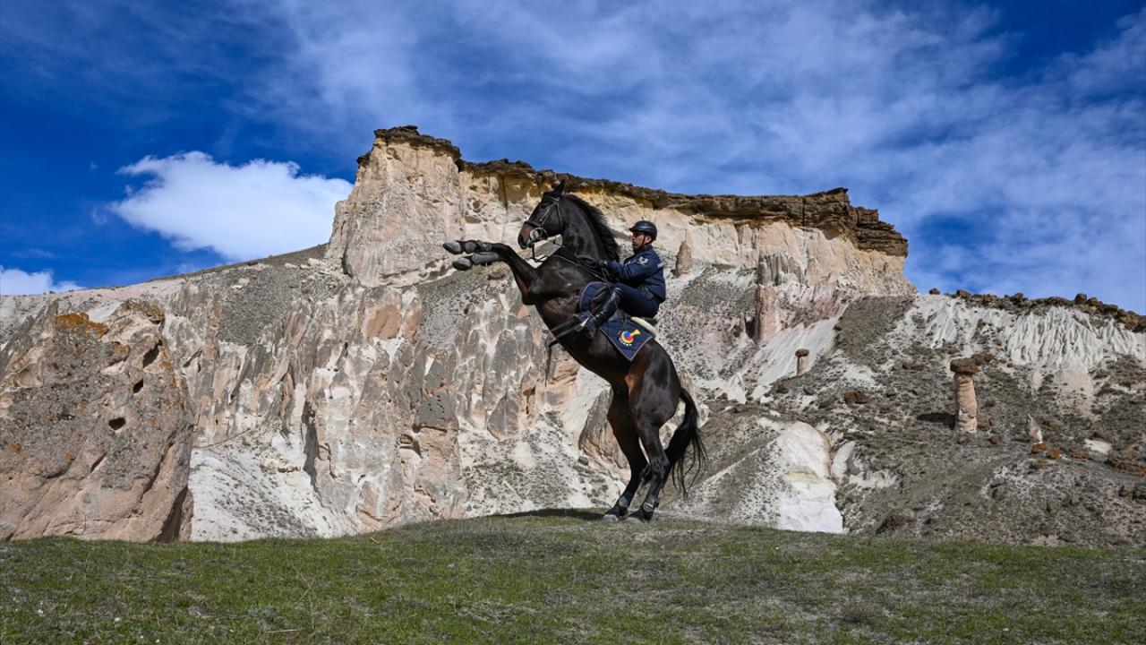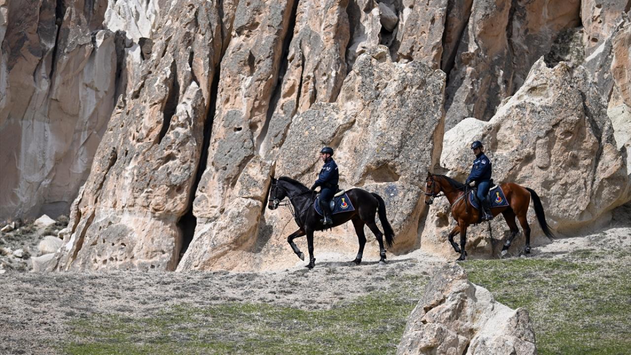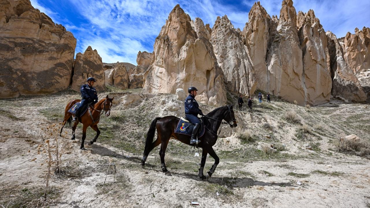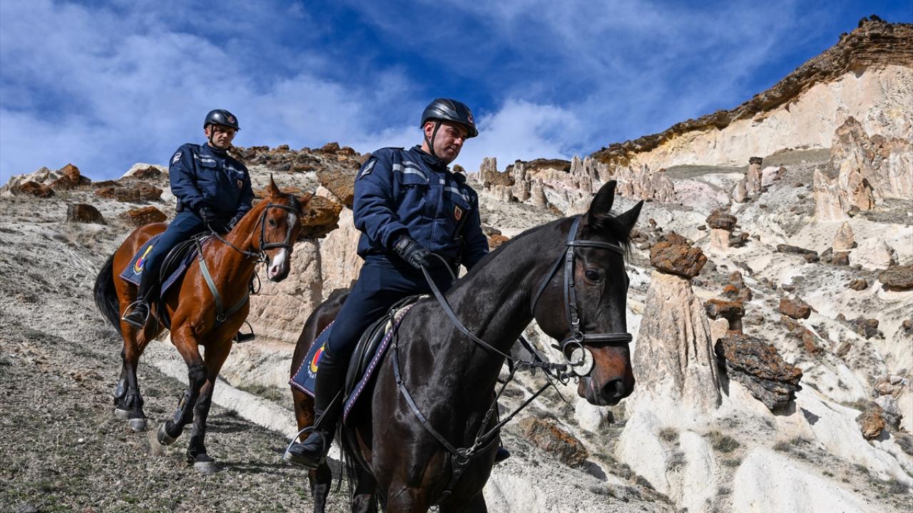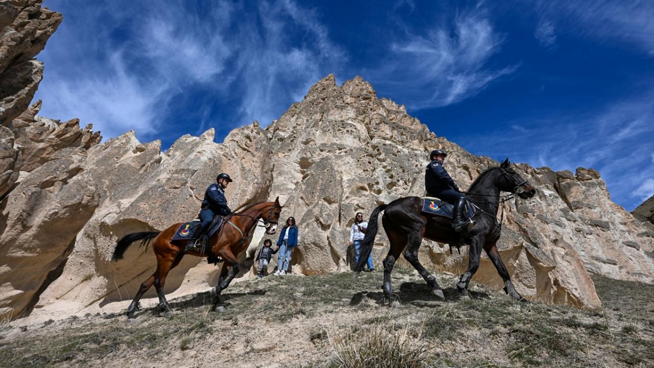 Van'ın Başkale ilçesinde "Vanadokya" olarak adlandırılan peribacalarının bulunduğu bölgede görev yapan atlı jandarma timi, hem ziyaretçilerin güvenliğini sağlıyor hem de turistik alanı koruyor.