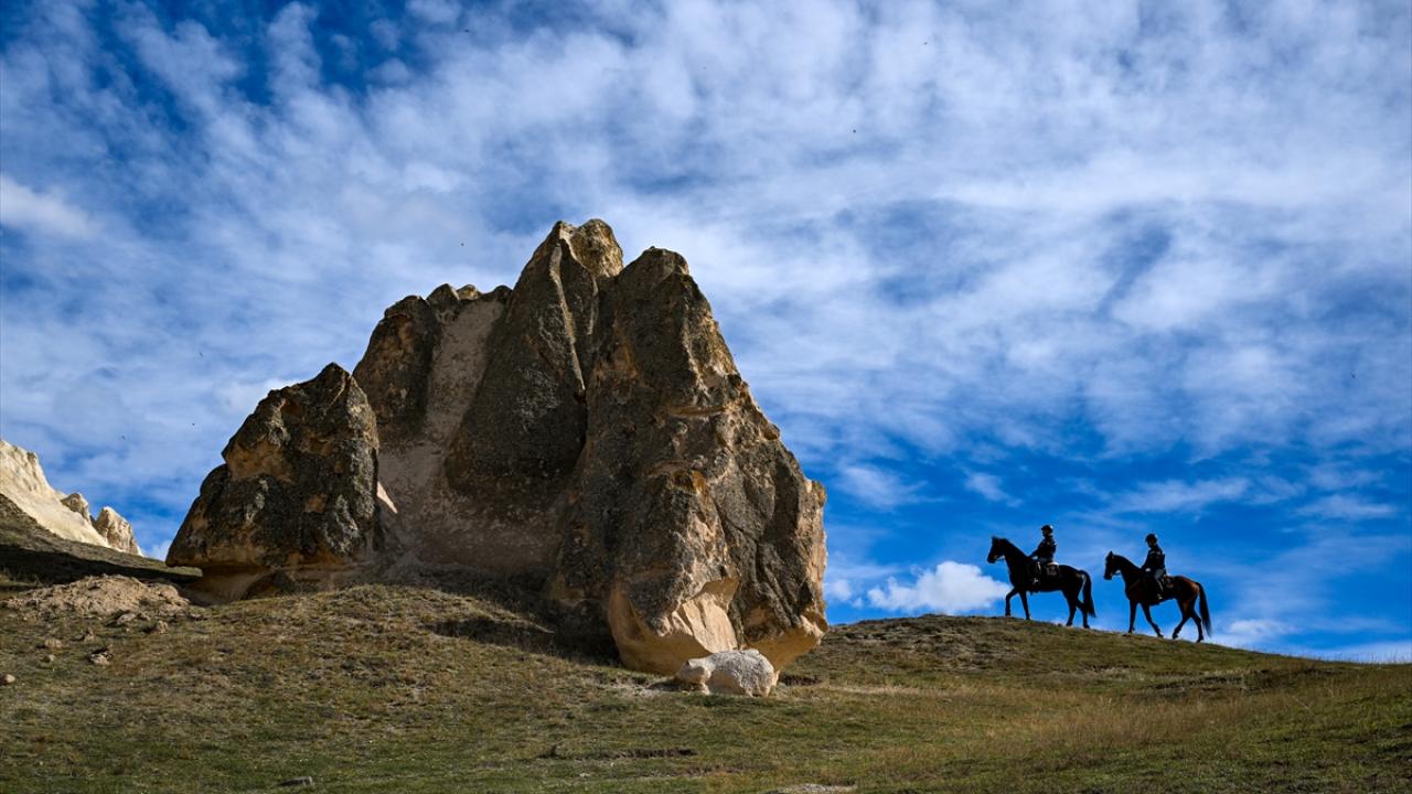 Peribacalarının olduğu vadi ve tepelik alanları dolaşan atlı ekipler, ziyaretçilere yapılara zarar verilmemesi ve kurallara uyulması konusunda uyarılarda bulunuyor.