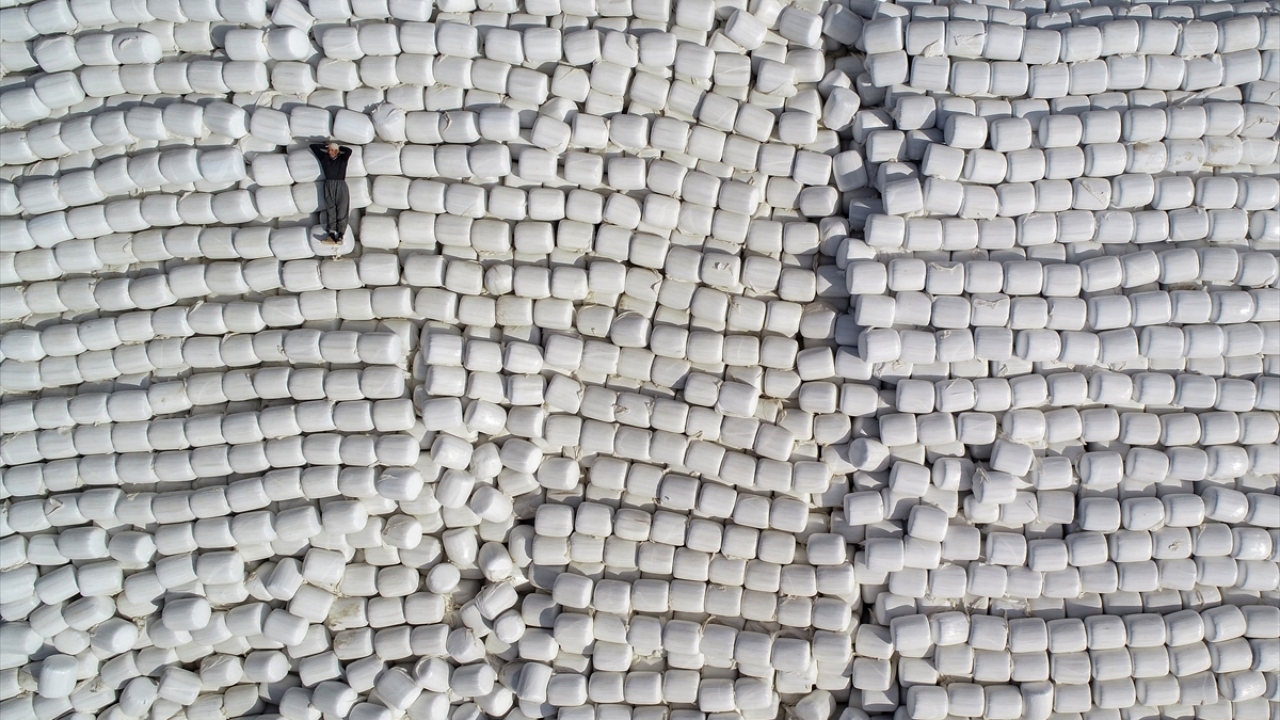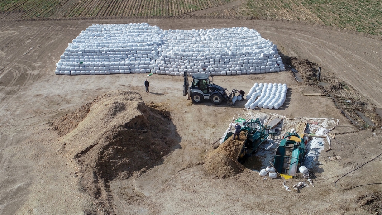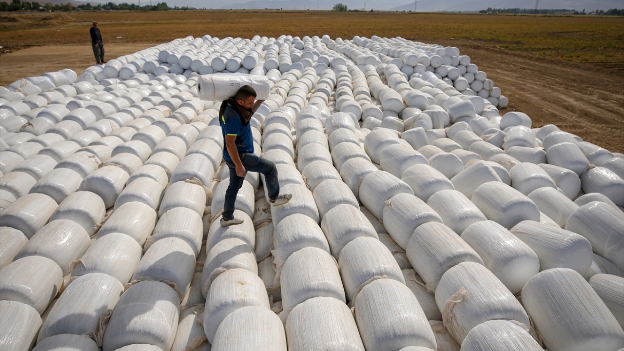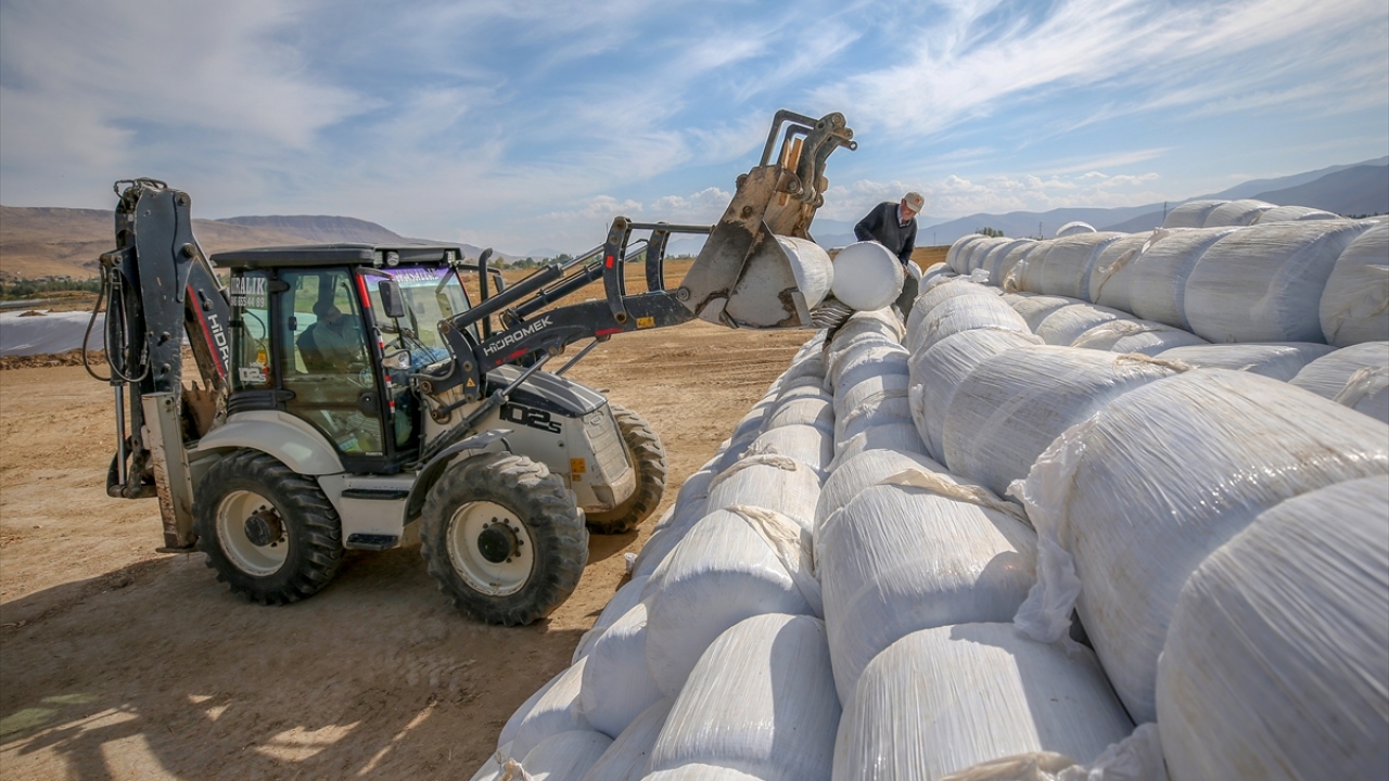 Van'ın Edremit ilçesinin Köklü Mahallesi'nde 250 dekarı dane, 900'ü ise silaj olmak üzere toplam bin 150 dekarlık mısırın hasadı yapılıp, ardından paketleniyor.