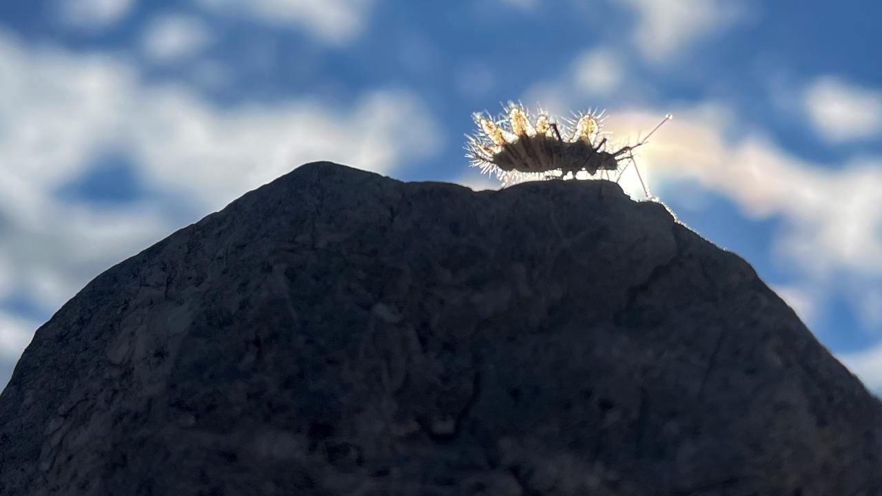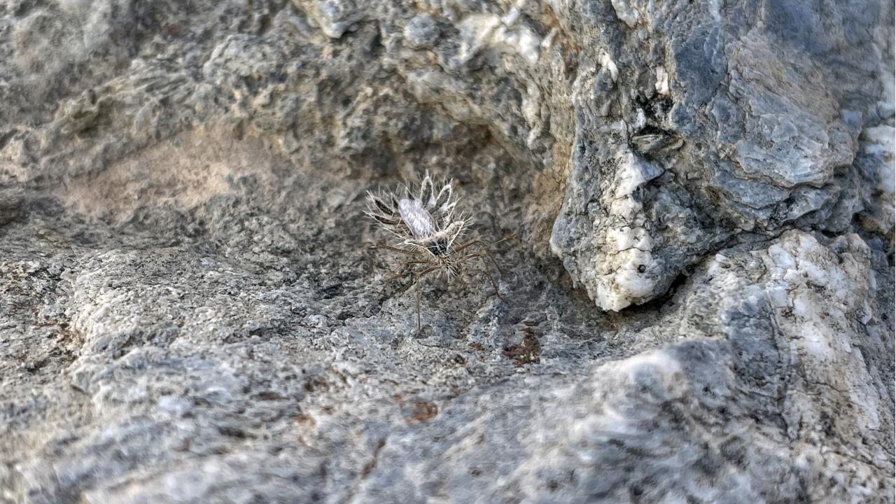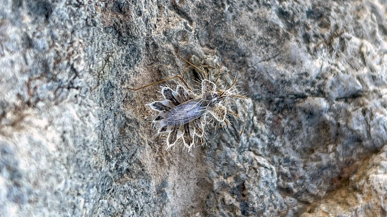 Hemiptera (yarım kanatlı) türlerinden olan böcek, dikenli kanatları ve nohut büyüklüğündeki örümceğe benzer yapısı ile kayalık bir alanda görüntüledi.