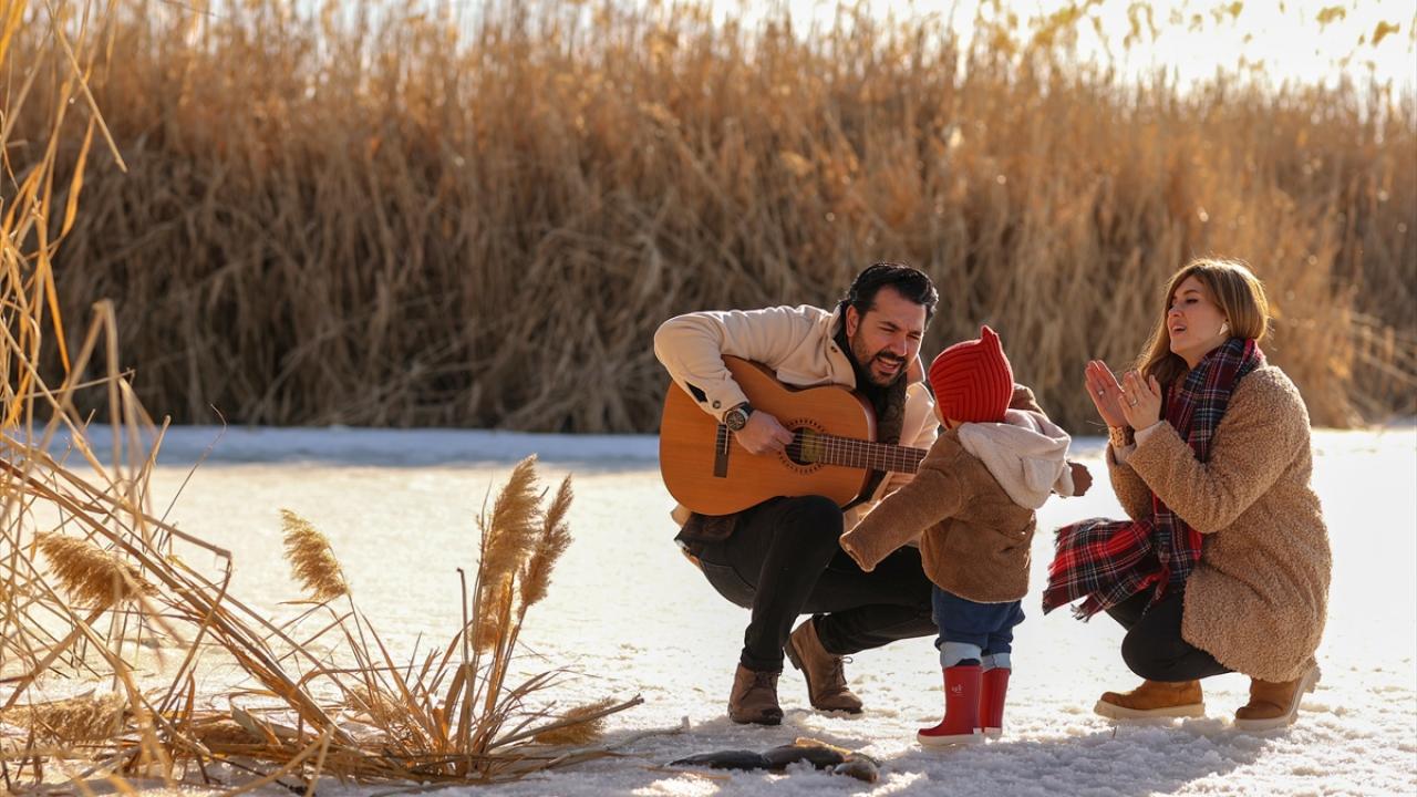 Köşk Mahallesi`ndeki sazlık alana gelen öğretmen çift, buz tabakasının üzerinde gitar ve flüt çalarak çocuklarına mini konser verdi.