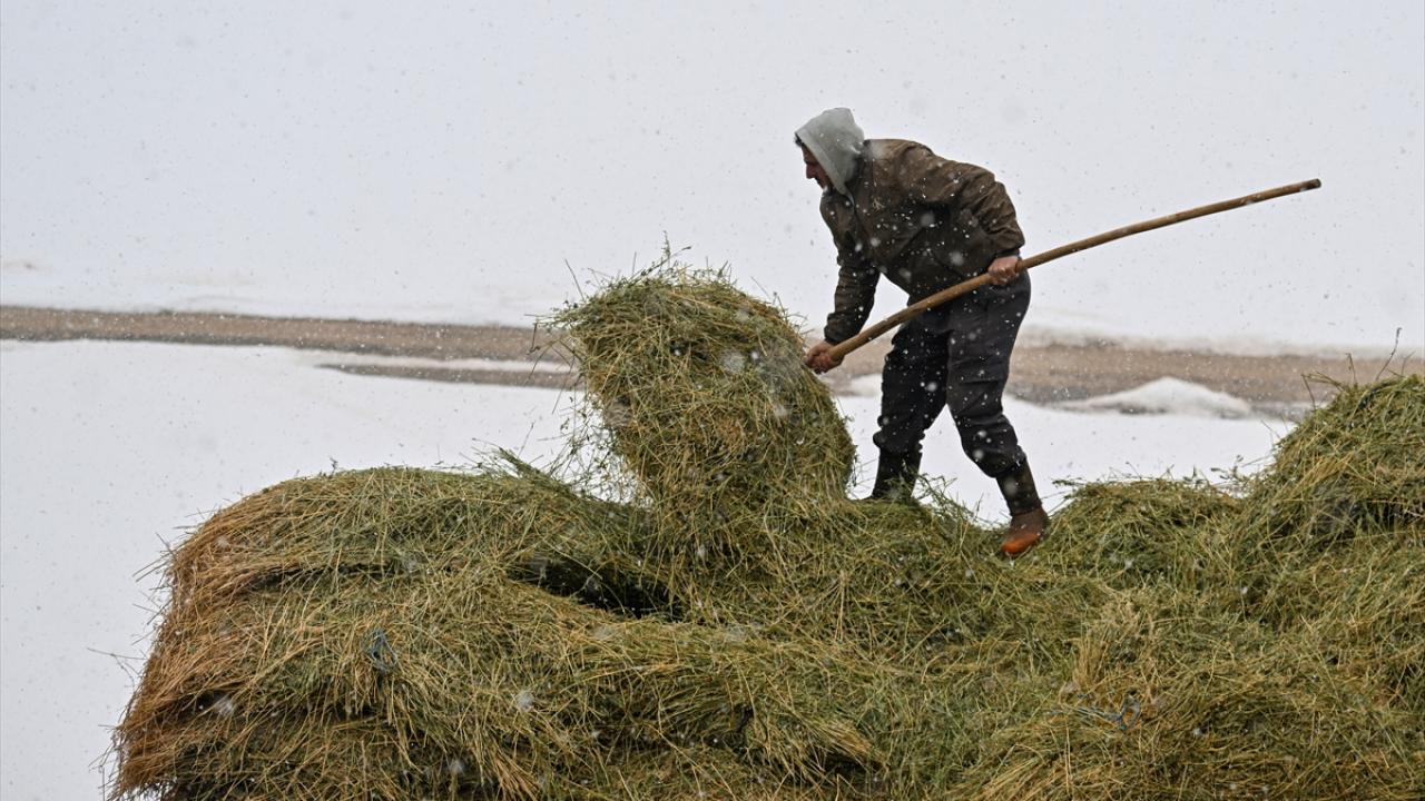 Olumsuz hava koşulları nedeniyle görüş mesafesinin düştüğü bölgede, besiciler hayvanlarını kar altında besledi.