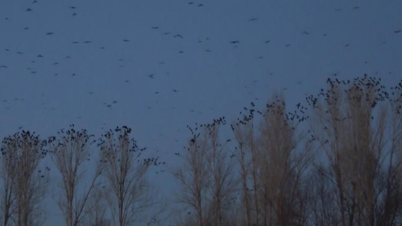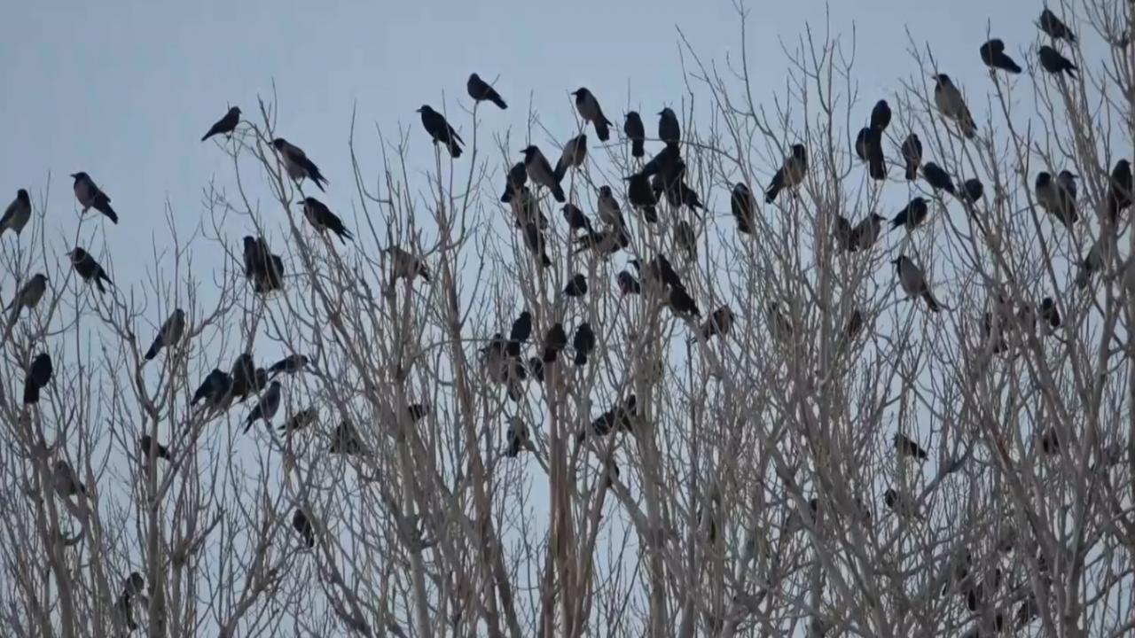 Akşam saatlerine doğru ortaya çıkan yüzledce karga, bir süre havada toplu halde sağa-sola uçup, havanın kararmaya başlamasıyla birlikte evlerin çevresindeki ağaçlara konuyorlar.