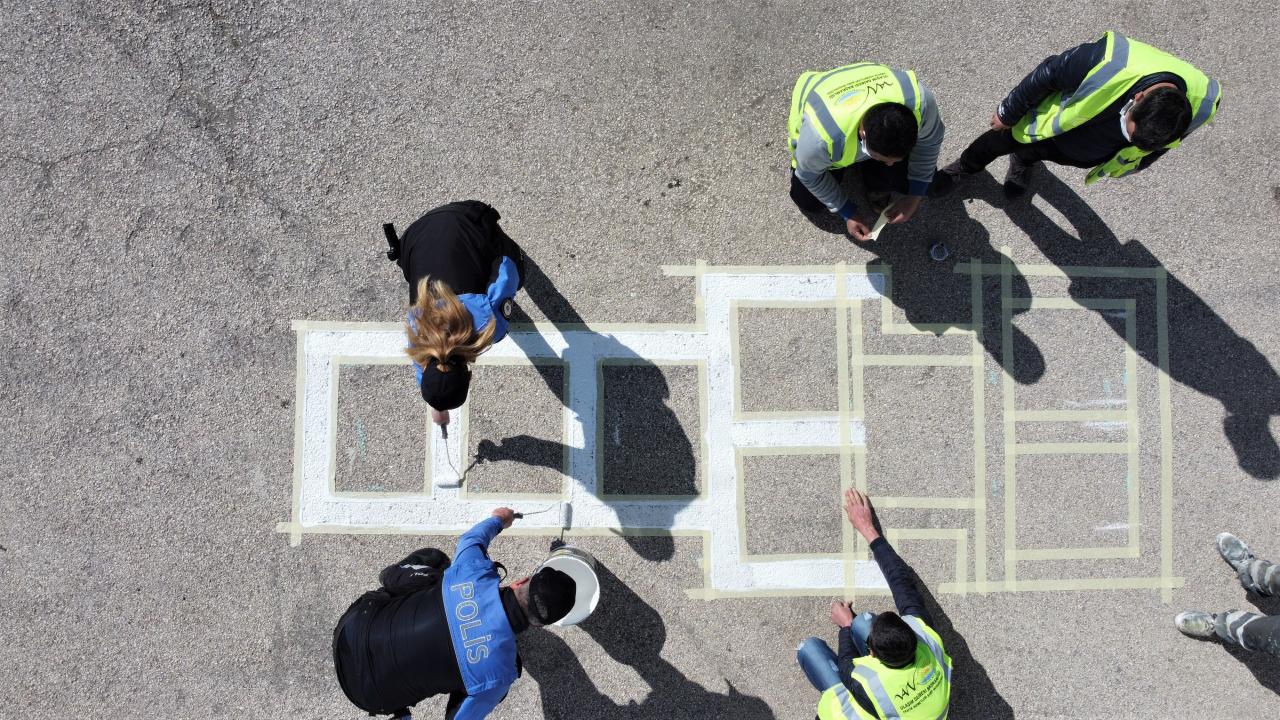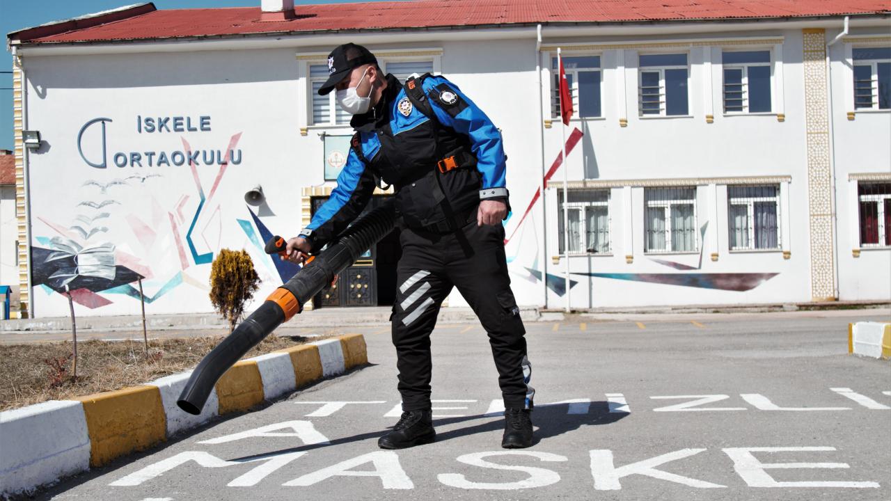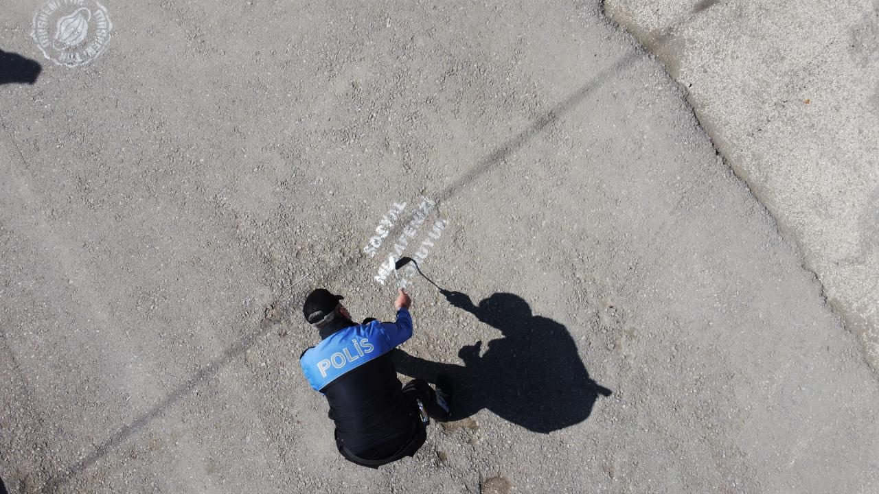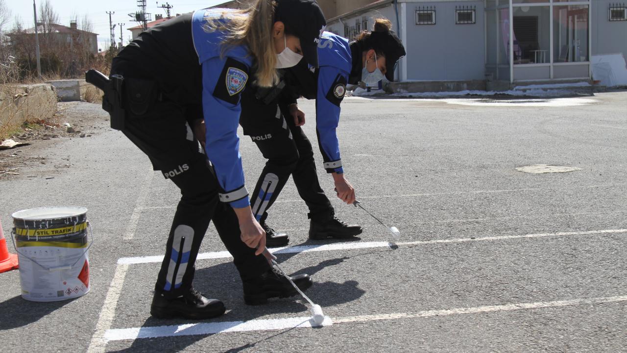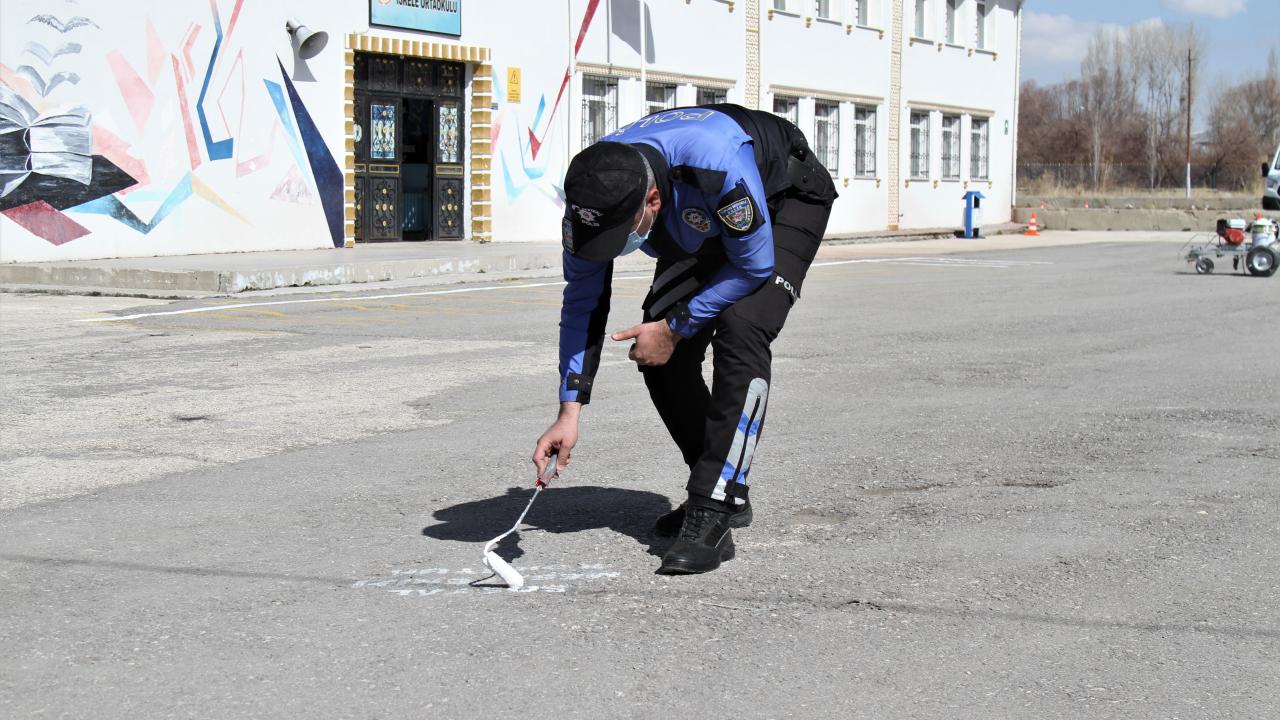 Van'da polisler okul bahçelerine sosyal mesafe uyarı işaretleri çizdi