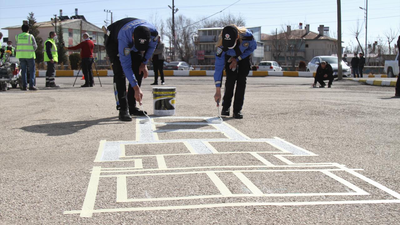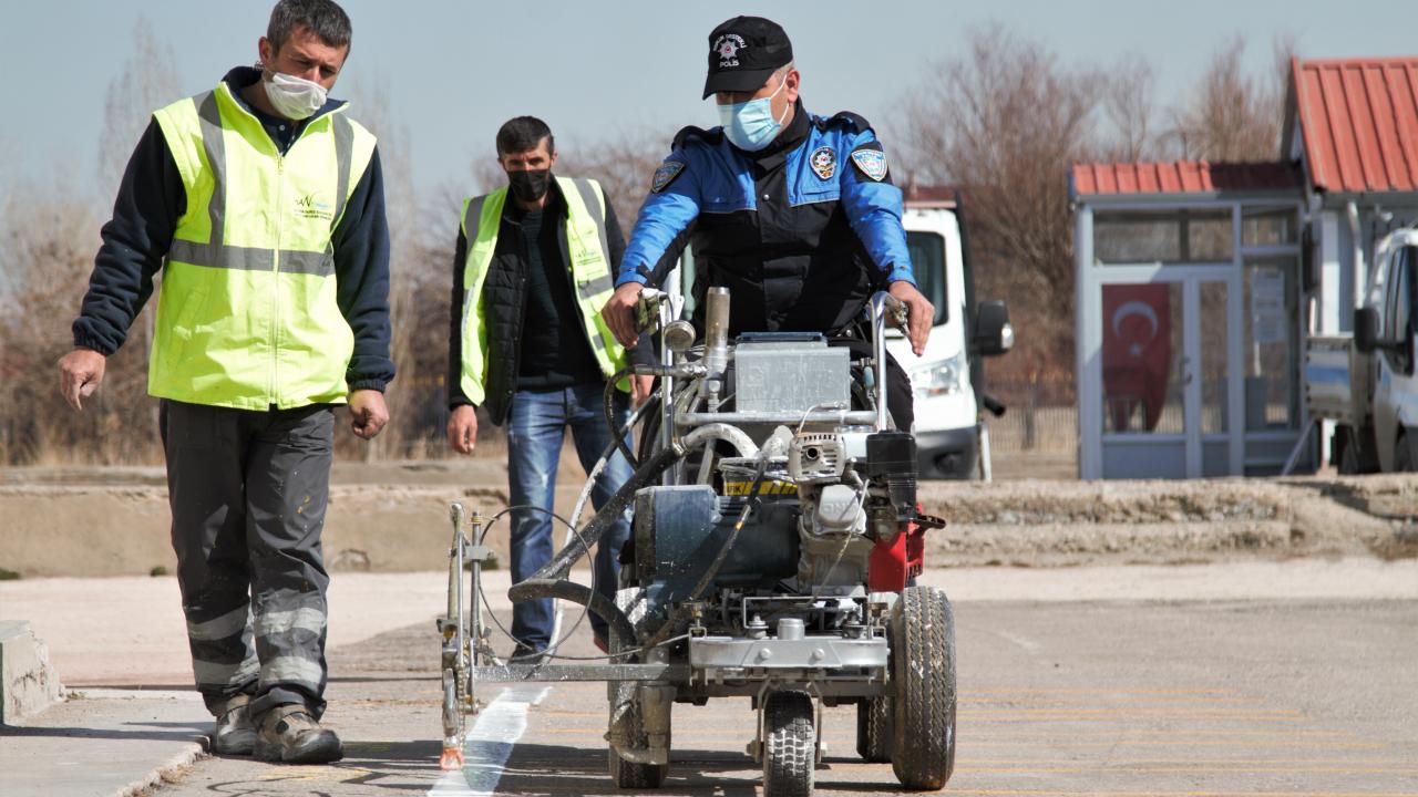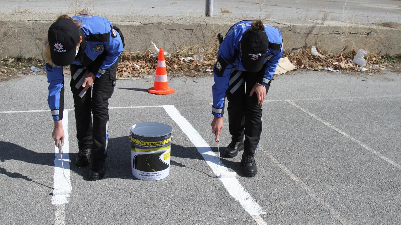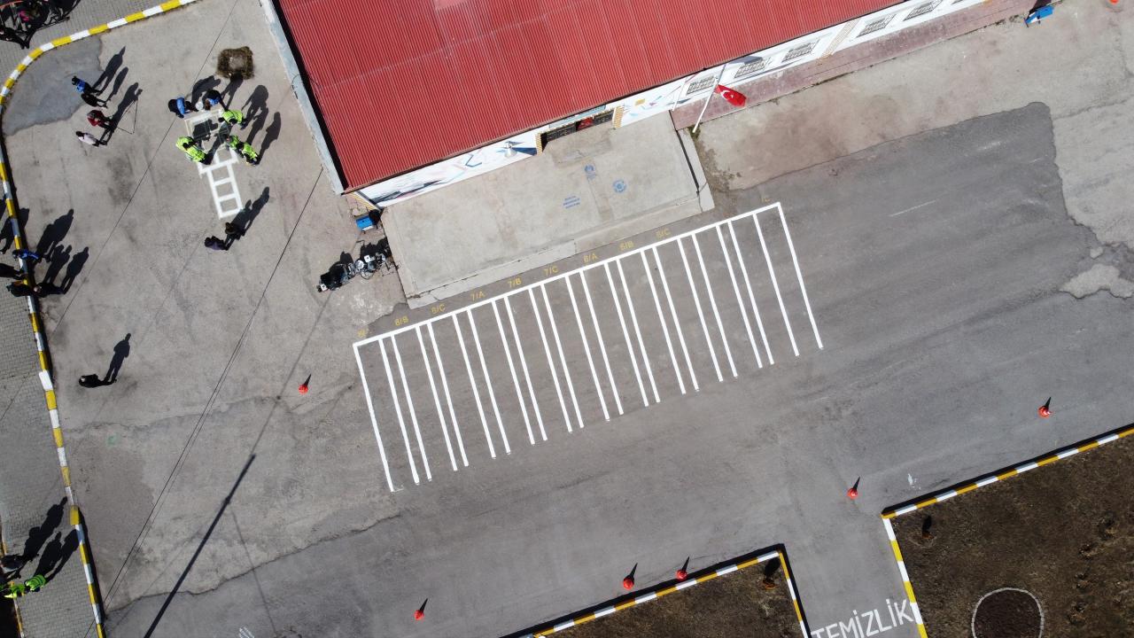 Van'da polisler okul bahçelerine sosyal mesafe uyarı işaretleri çizdi