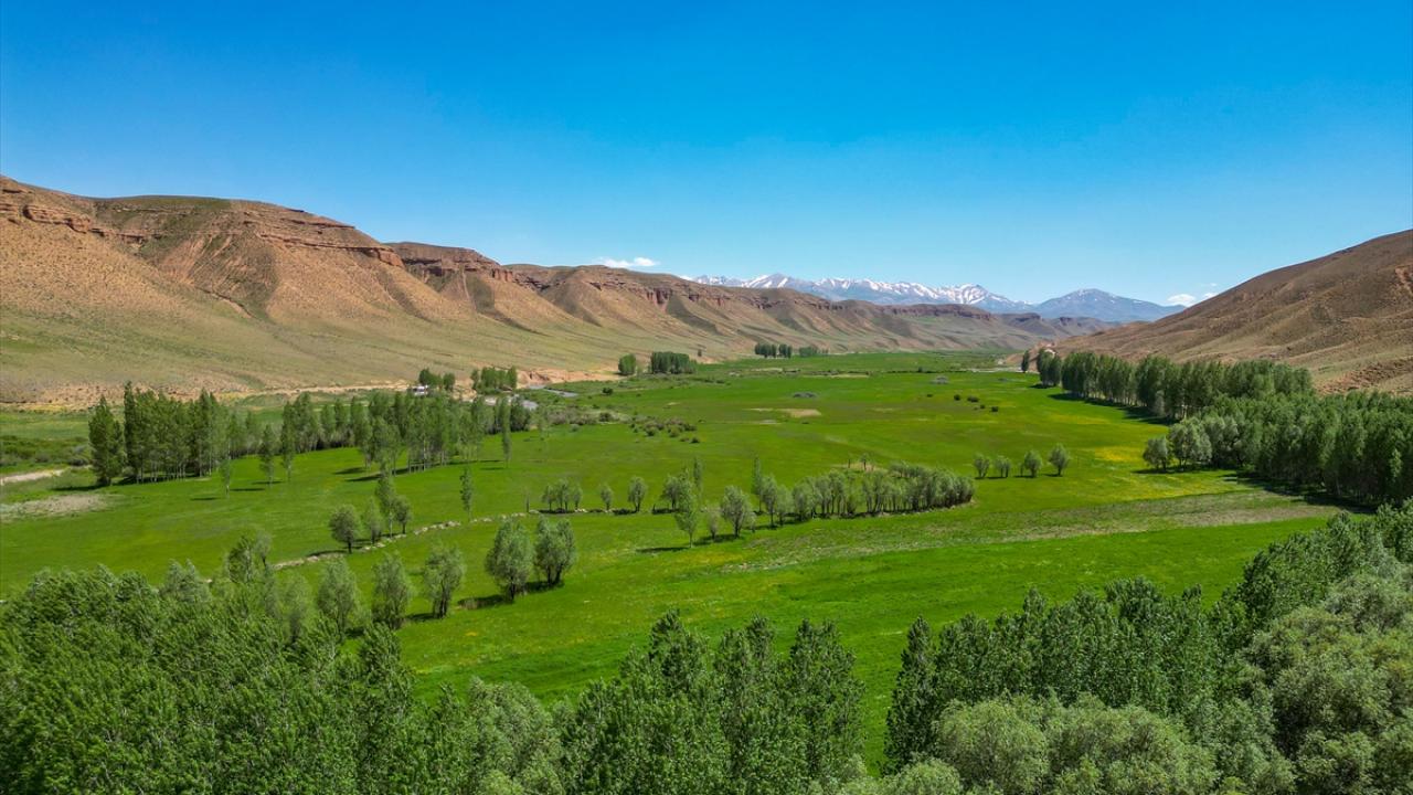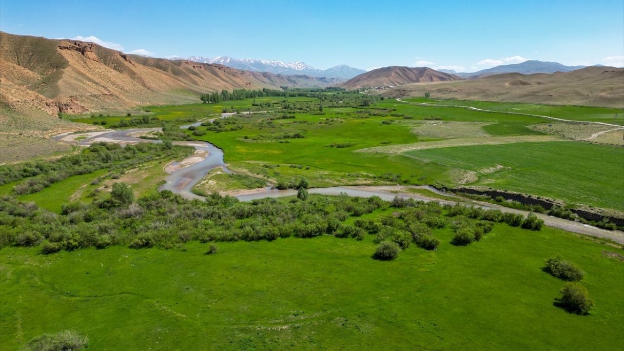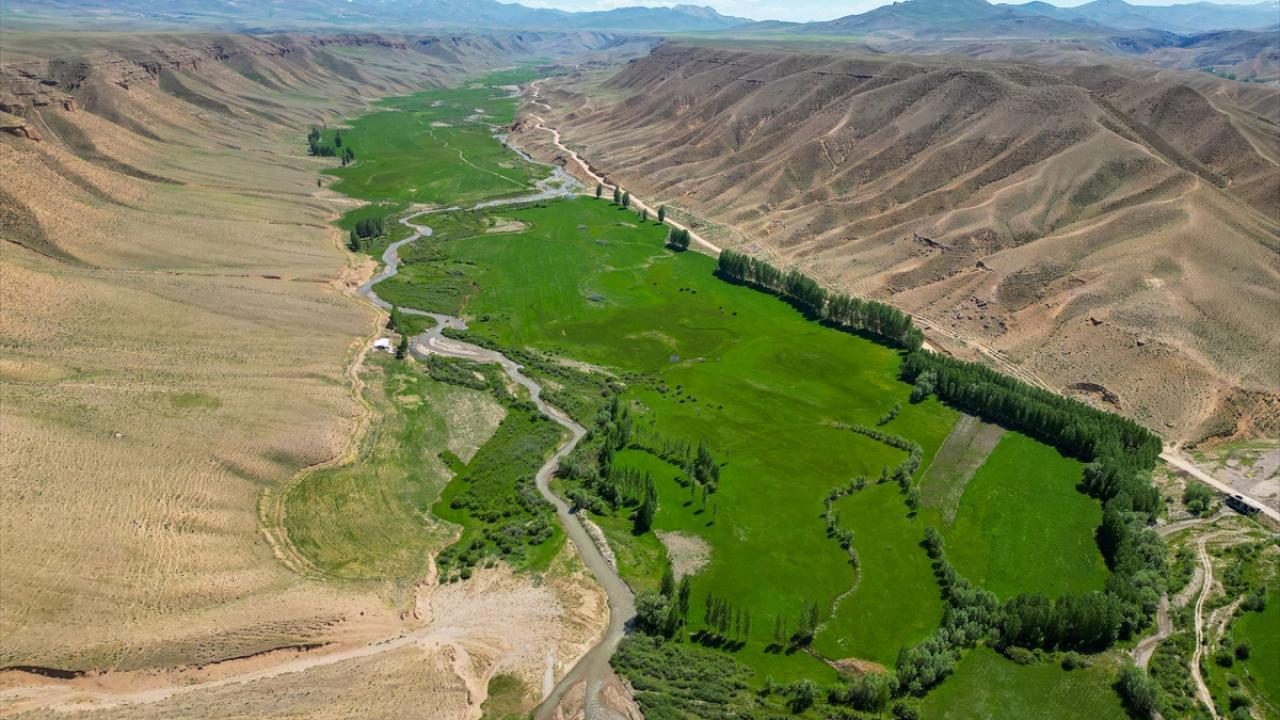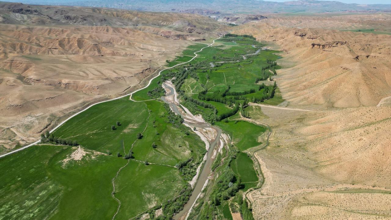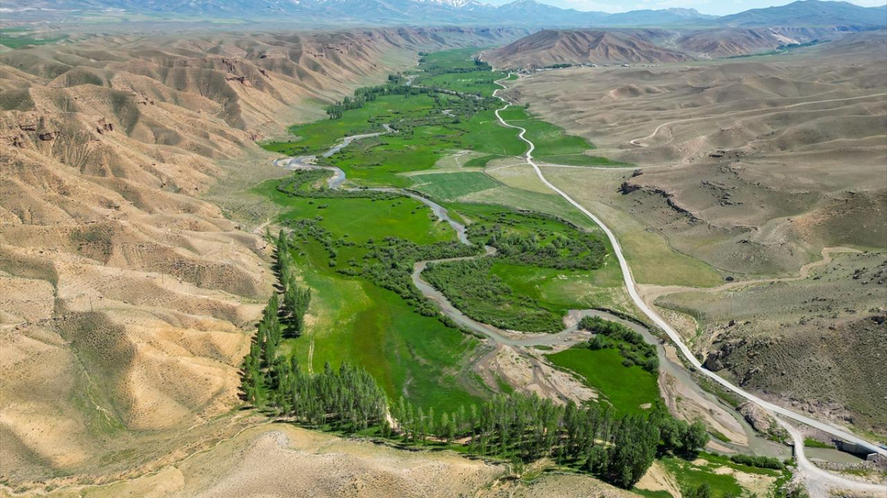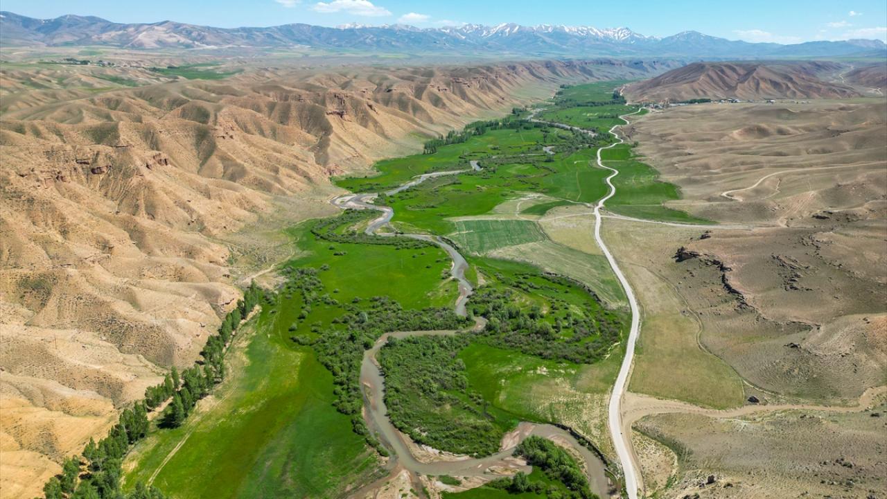 Çorak dağların arasında uzanan yemyeşil vadide kıvrımlarıyla dikkati çeken menderesler, dronla görüntülendi.