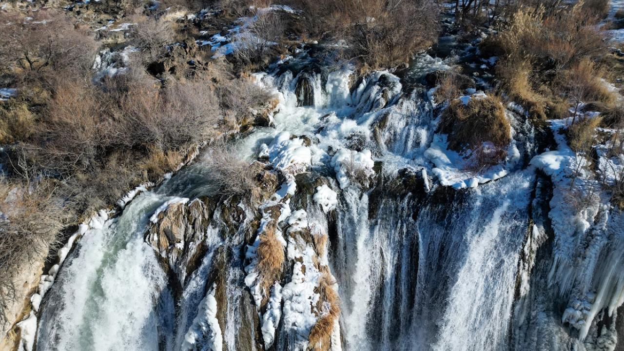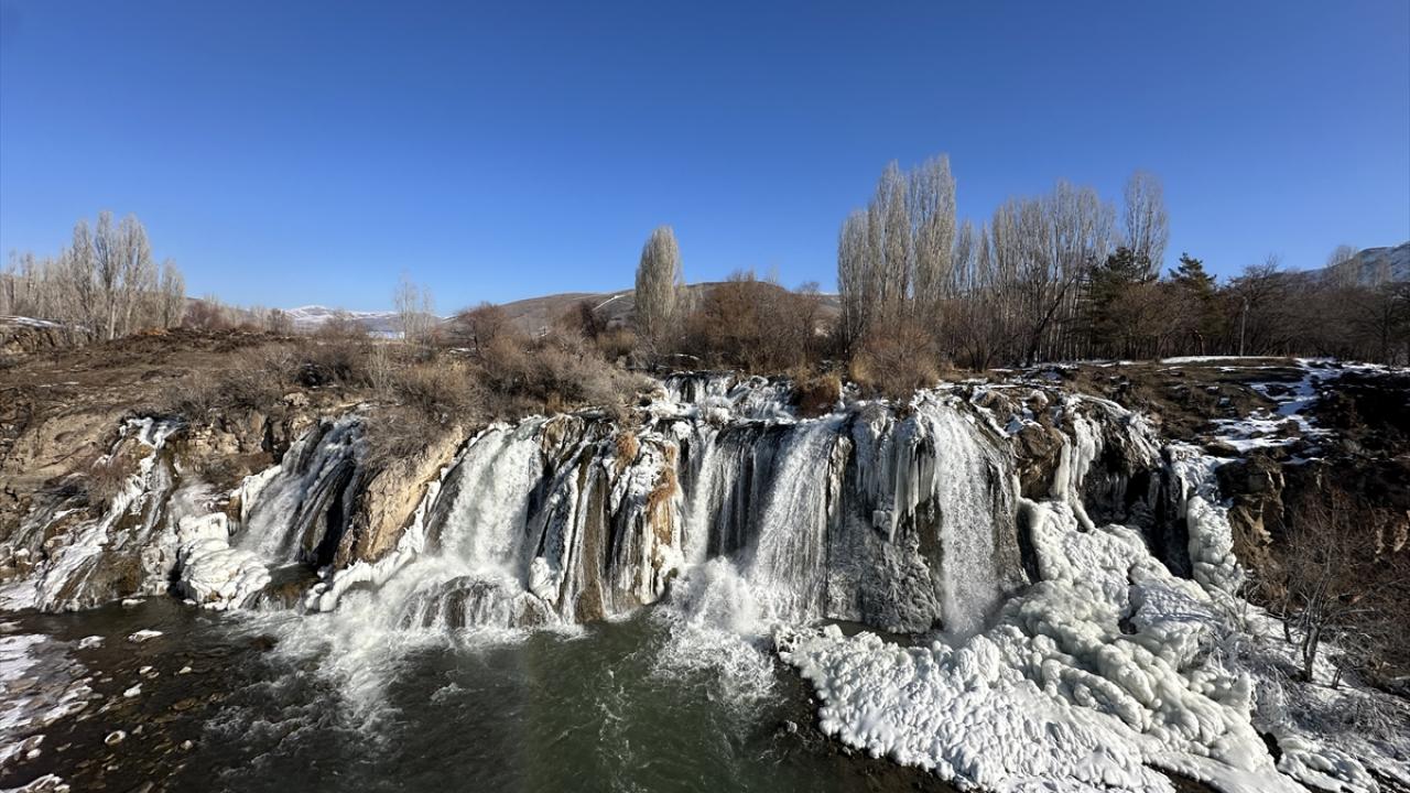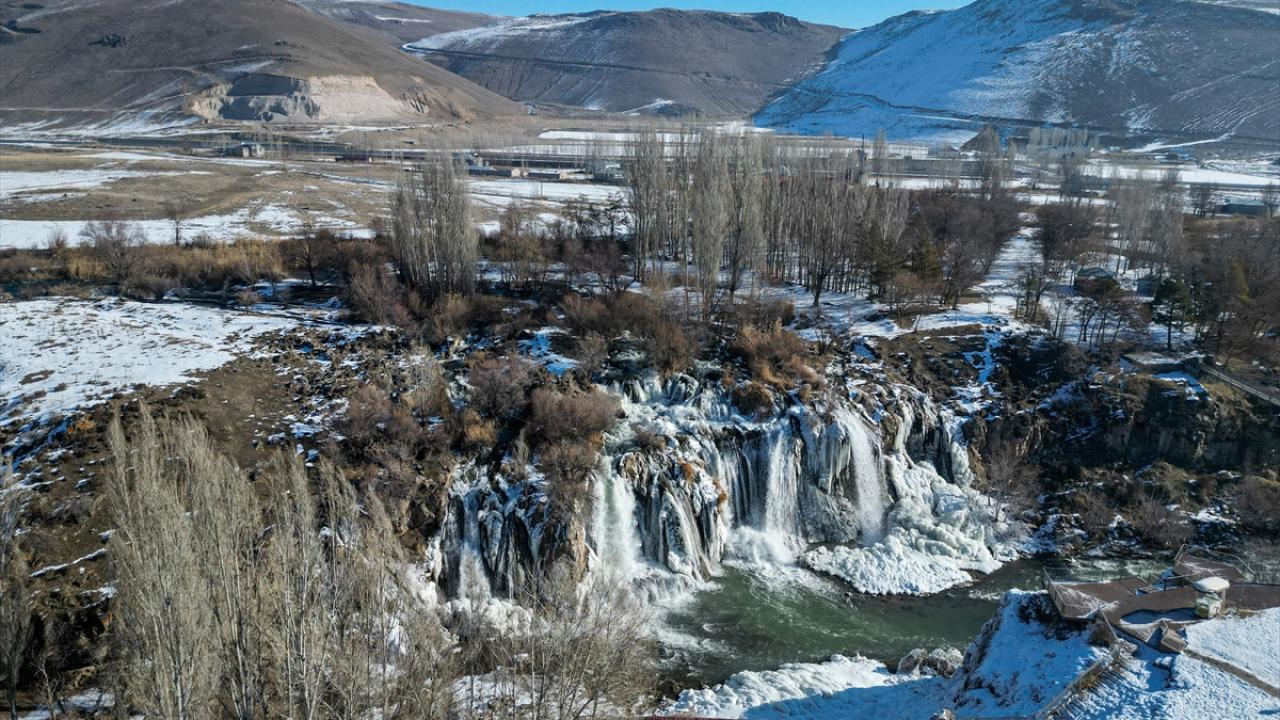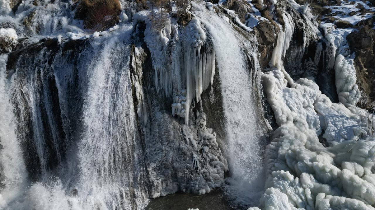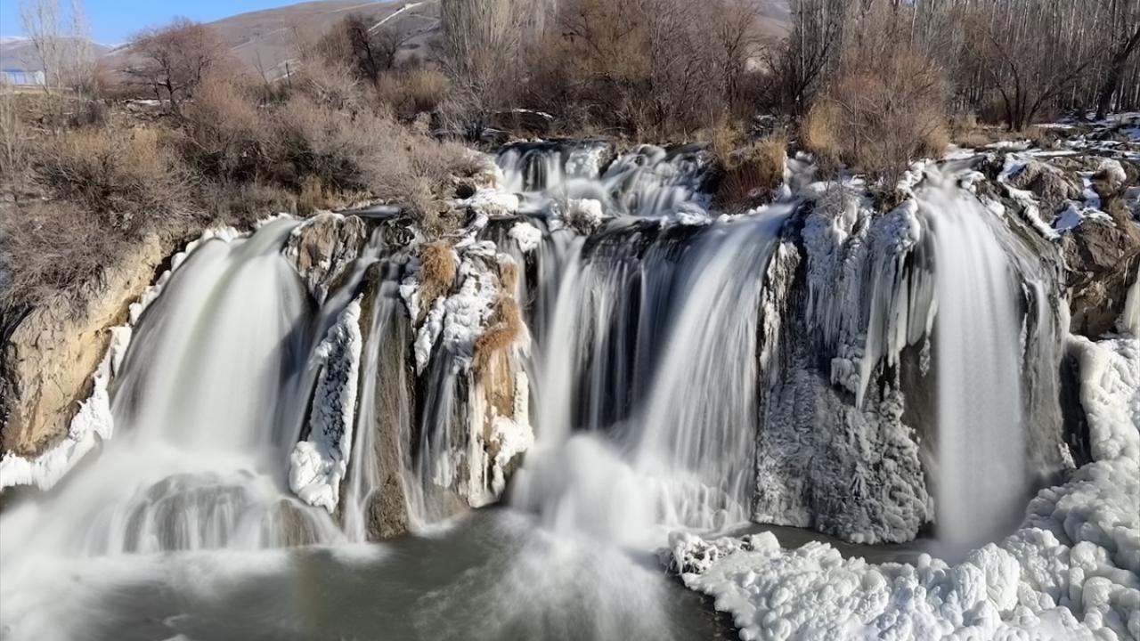 Van'ın Muradiye ilçesinde yerli ve yabancı turistlerin en çok ziyaret ettiği yerlerden Muradiye Şelalesi, soğuk havanın etkisiyle kısmen dondu.