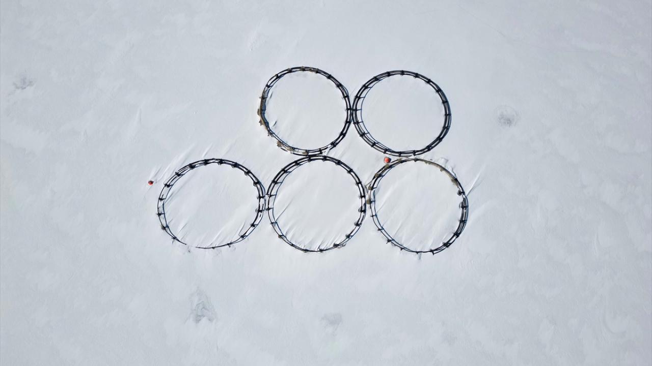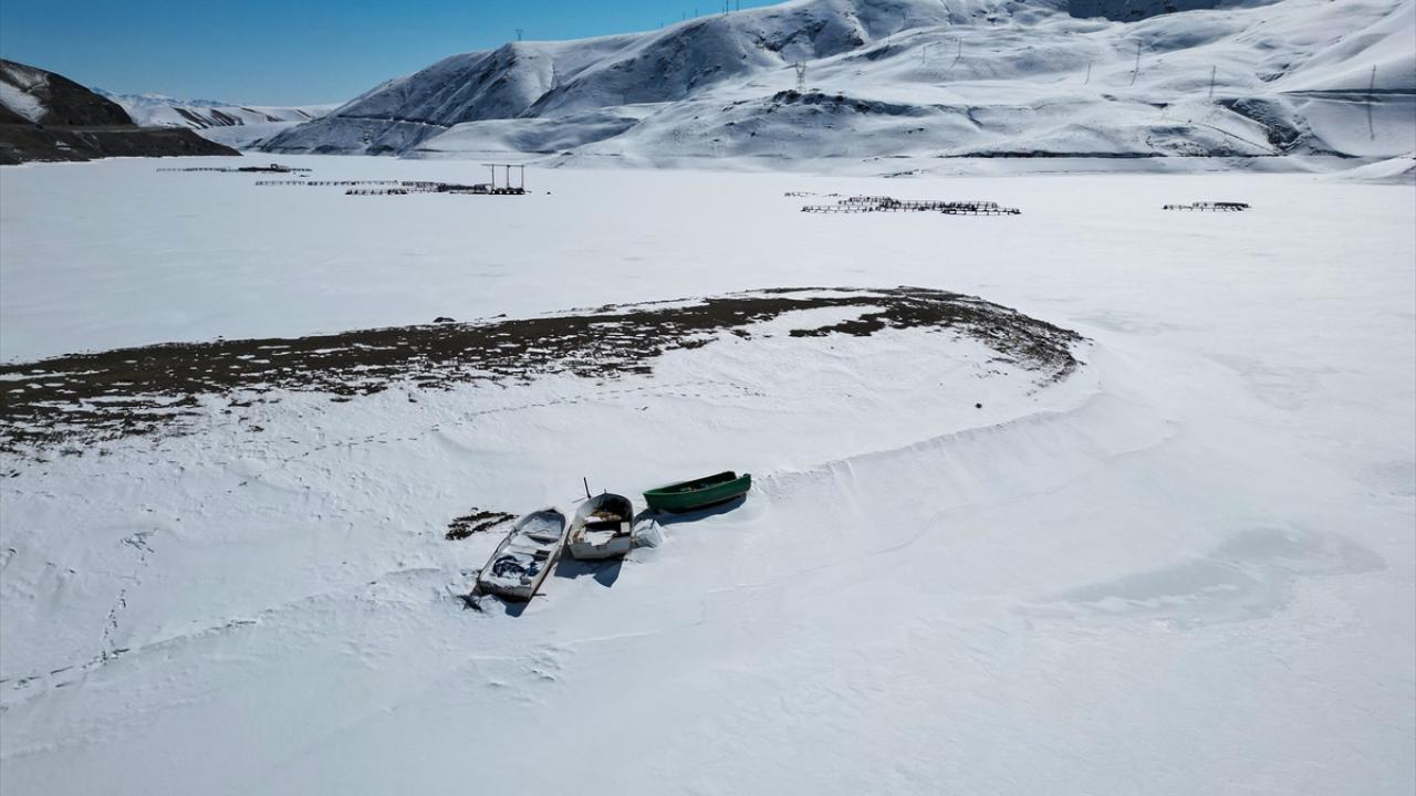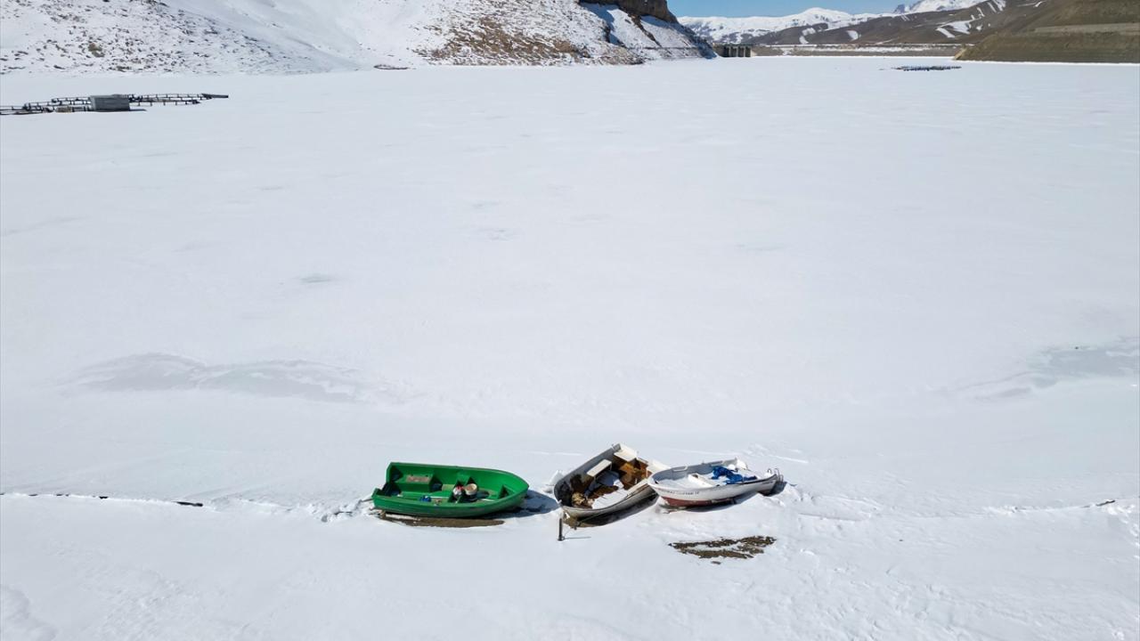 Son yağışlarla beyaza bürünen barajda, kafes balıkçılığının yapıldığı havuzlar ile balıkçı tekneleri buz kütleleri arasında kaldı.