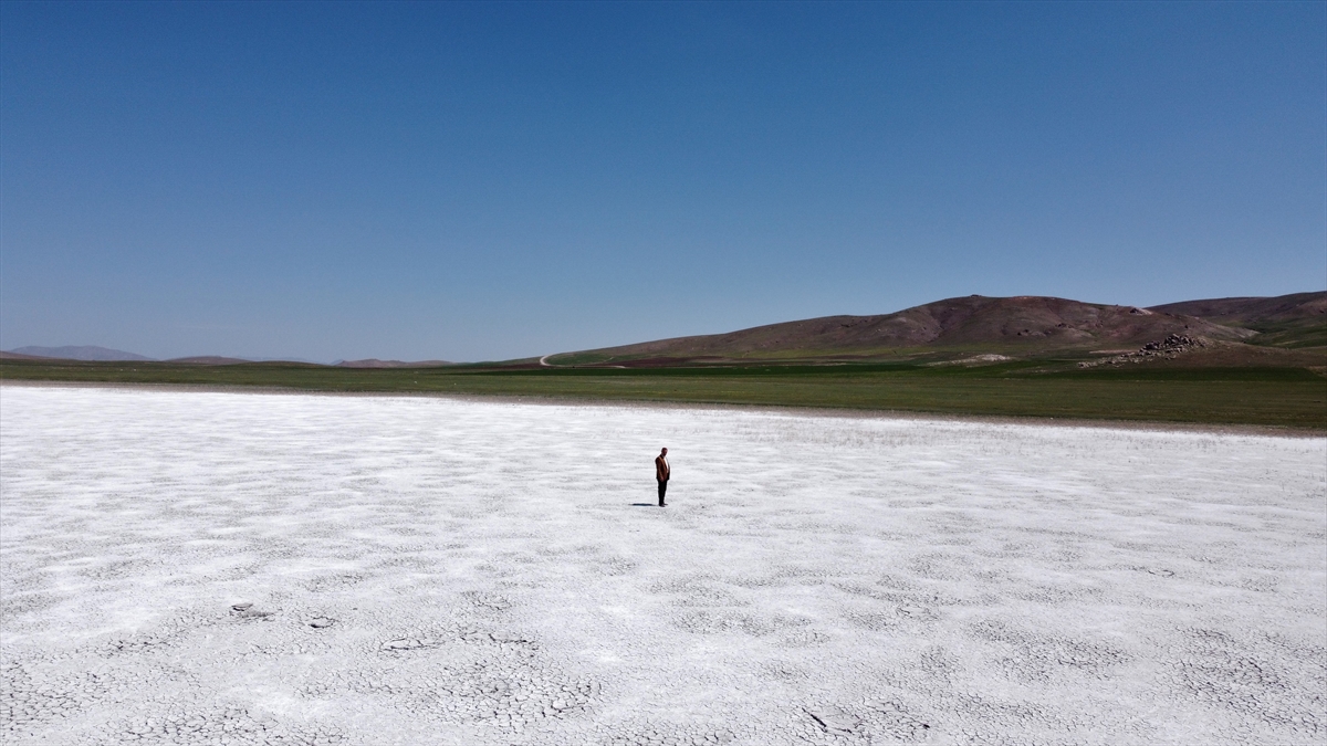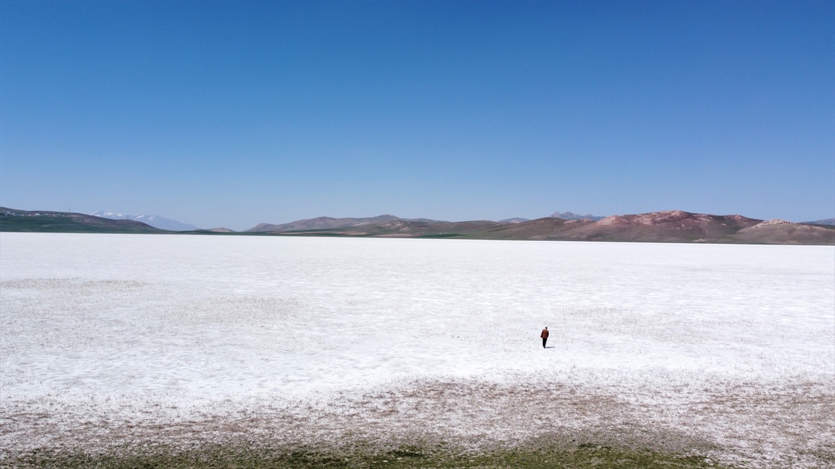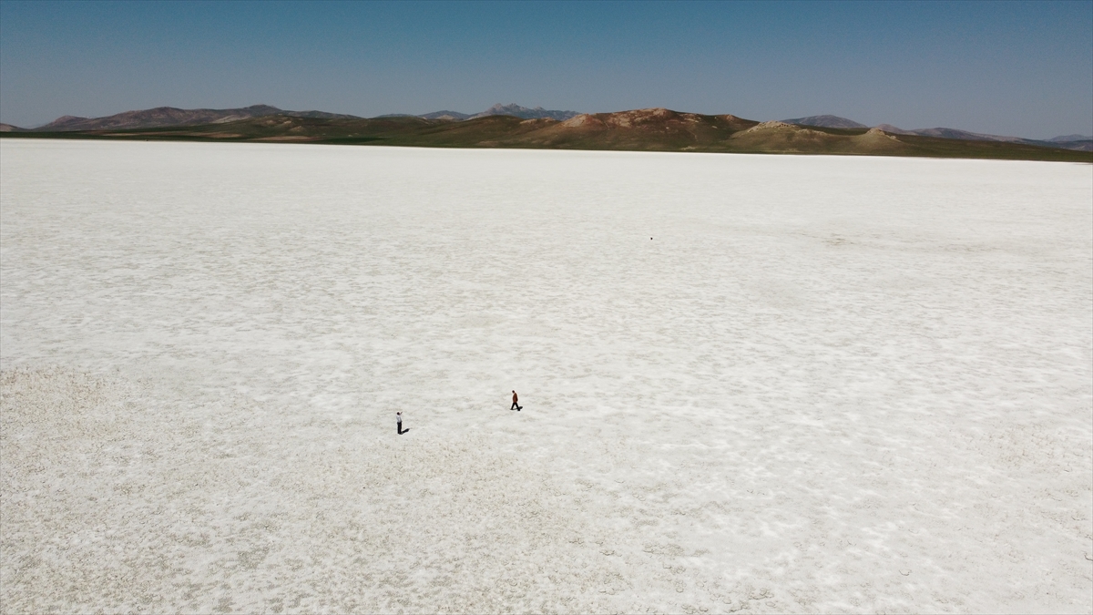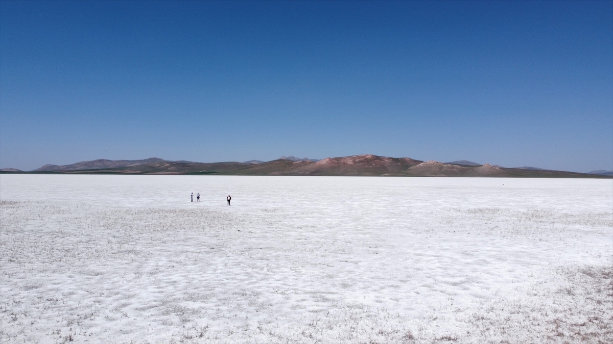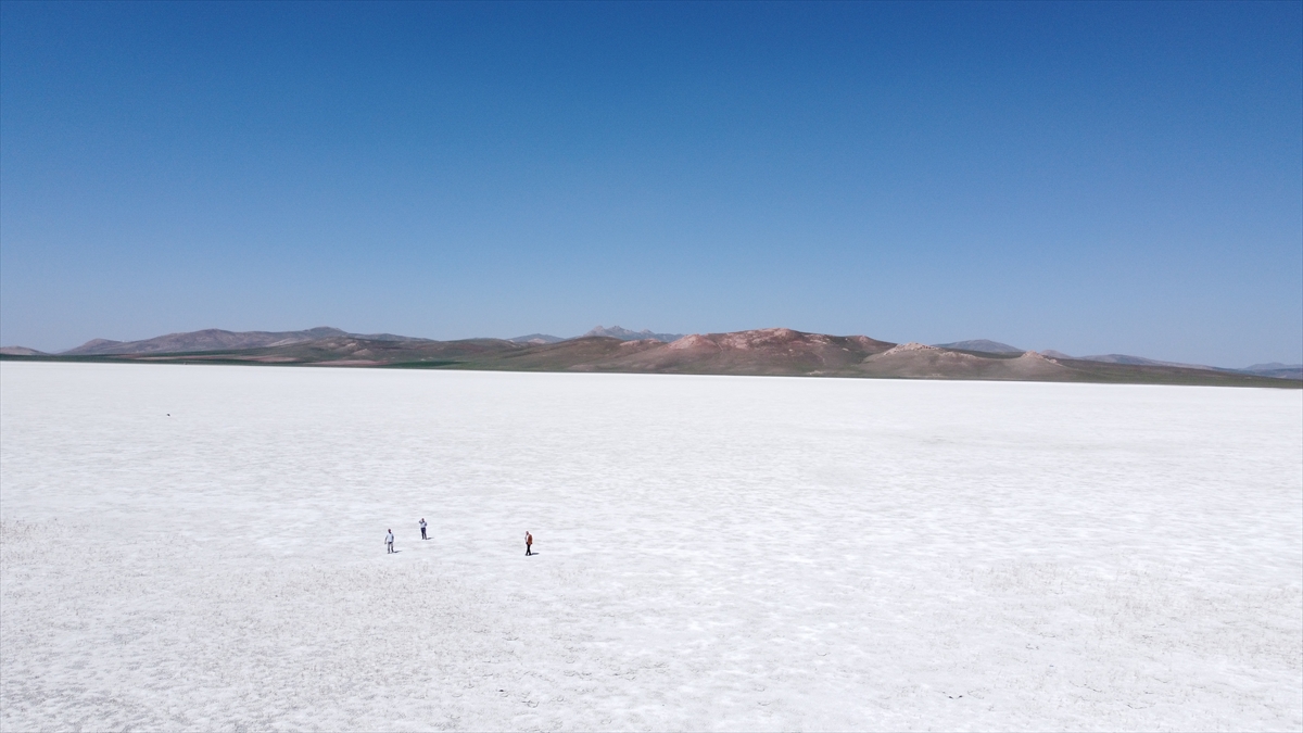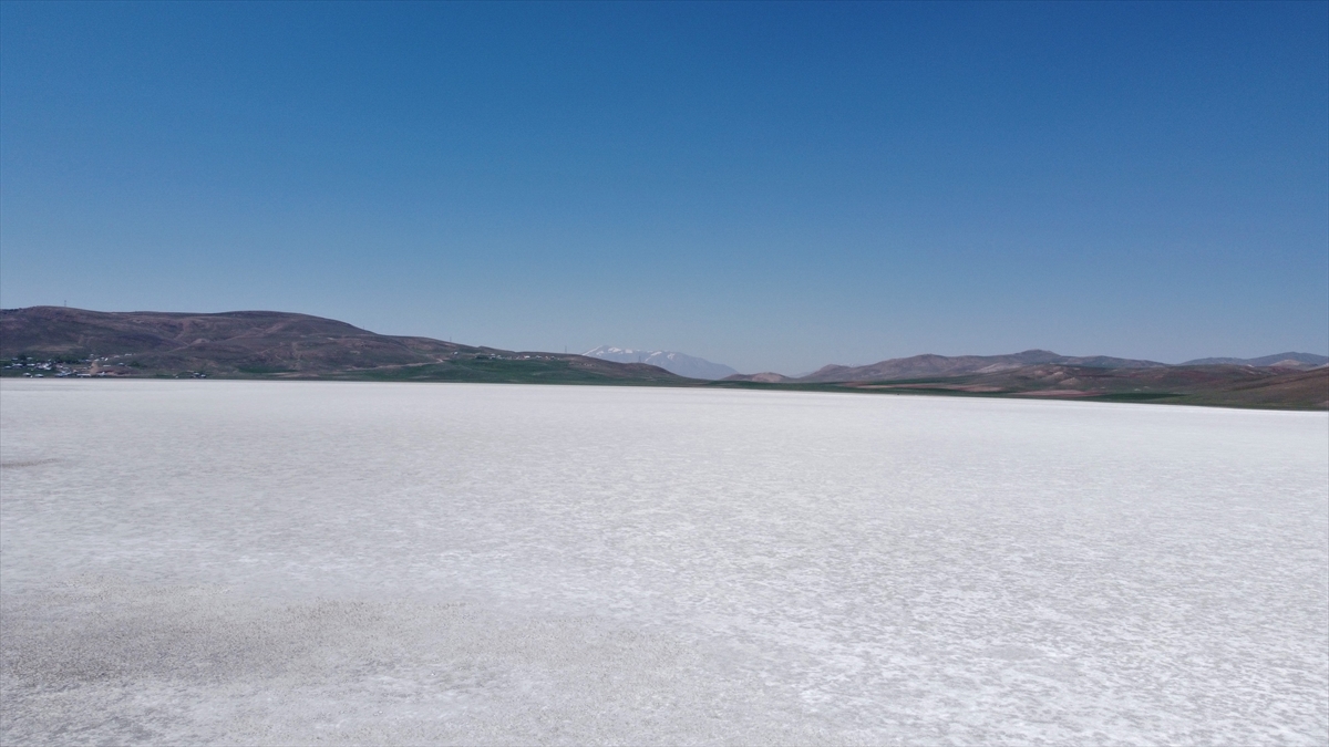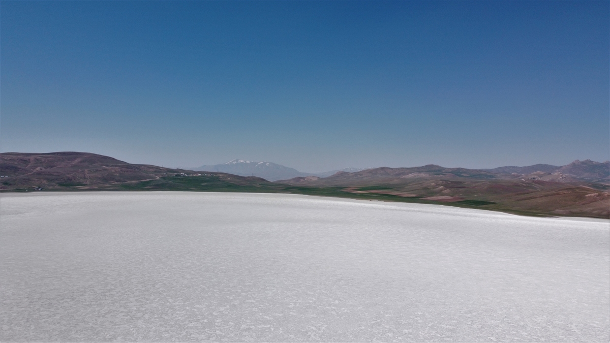 Tuz oranının yüksek olması nedeniyle zemini beyaza bürünen göl, drone ile görüntülendi.