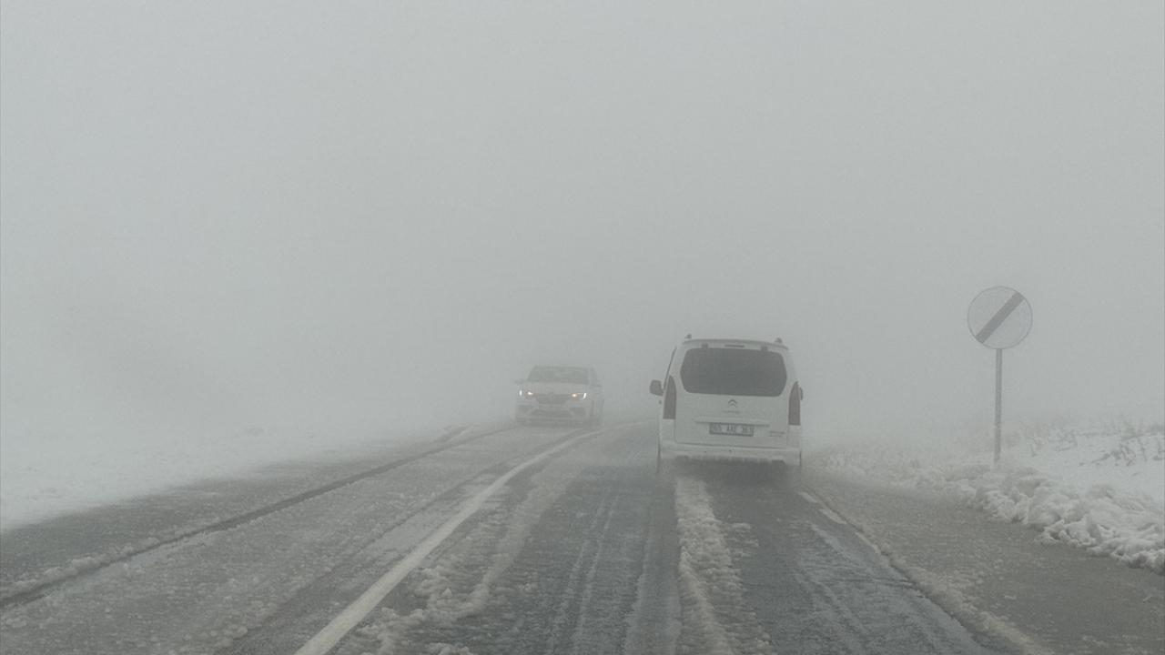 Kar ve yoğun sis nedeniyle ilerlemekte güçlük çeken sürücüler, araçlarını yol kenarına çekerek bir süre bekledi.