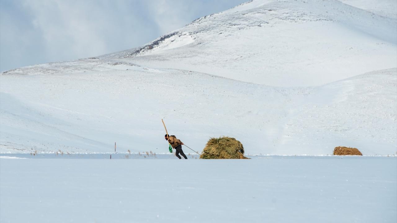 Bazen sırtlarında bazen de kızaklarla taşıdıkları otları ezdikleri karın üzerine seren çiftçiler, ağılda beklettikleri hayvanlarını bu alana getirerek gün boyunca yemliyor.