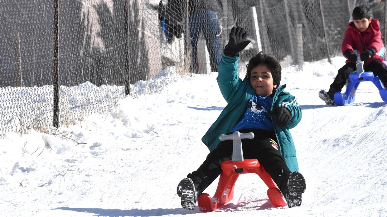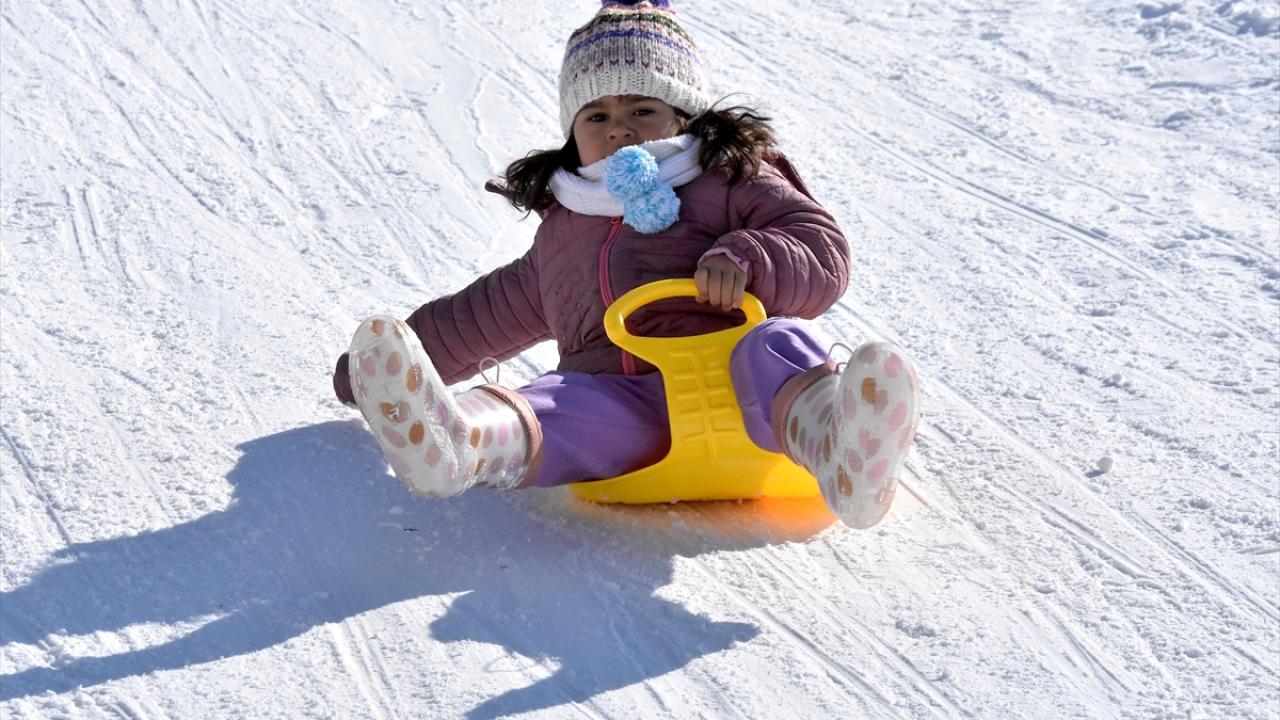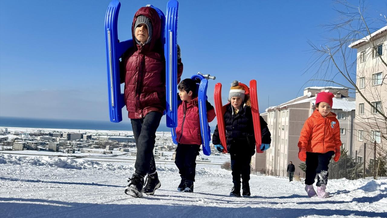 Kızaklarıyla tepeye tırmanan çocuklar, gün boyunca kayarak eğlenceli zaman geçiriyor.