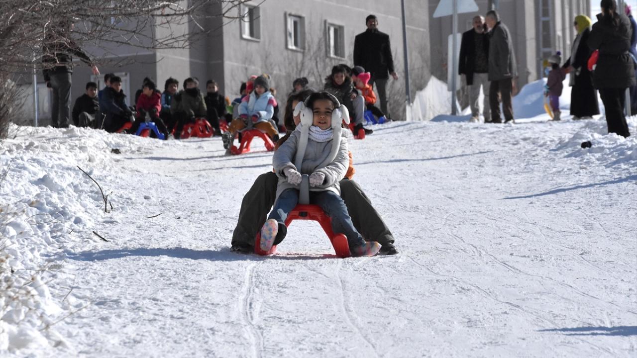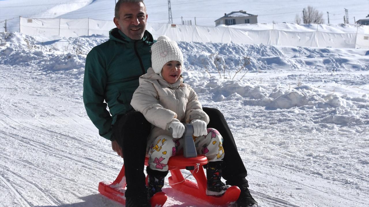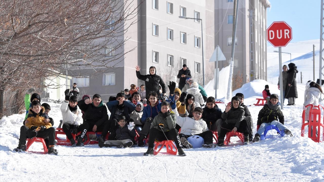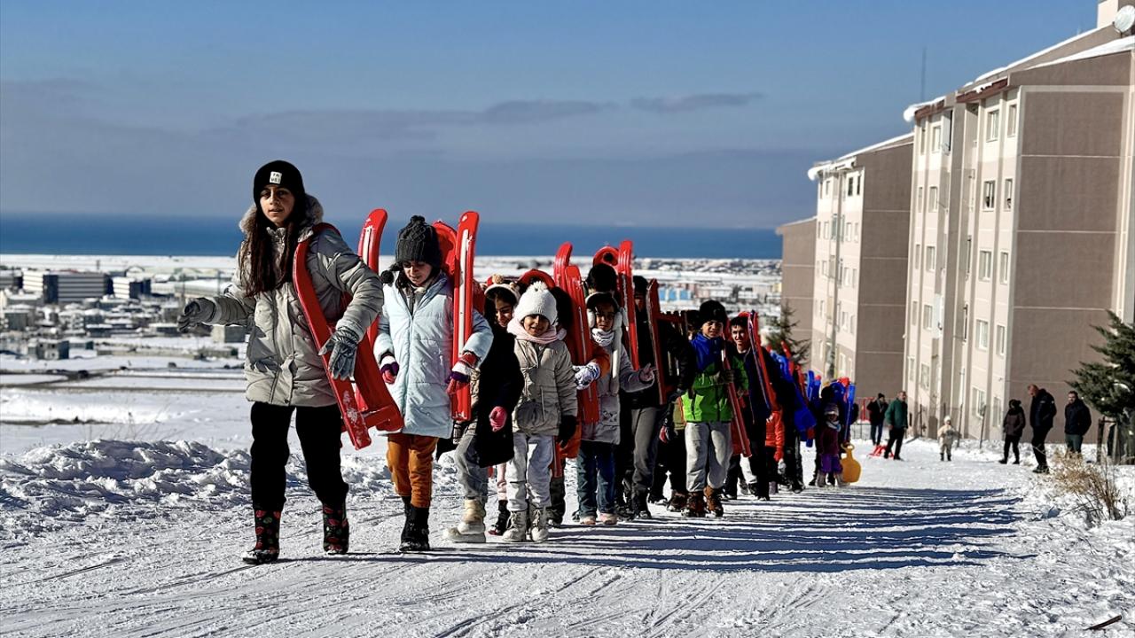 Kızaklarıyla tepeye tırmanan çocuklar, gün boyunca kayarak eğlenceli zaman geçiriyor.