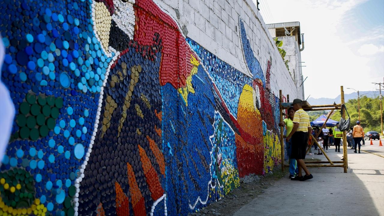 Venezuelalı sanatçı Oscar Olivares, Miranda'ya bağlı Guatire kentinde iklim değişikliğine dikkat çekmek için plastik kapaklardan duvar resmi yapıyor.