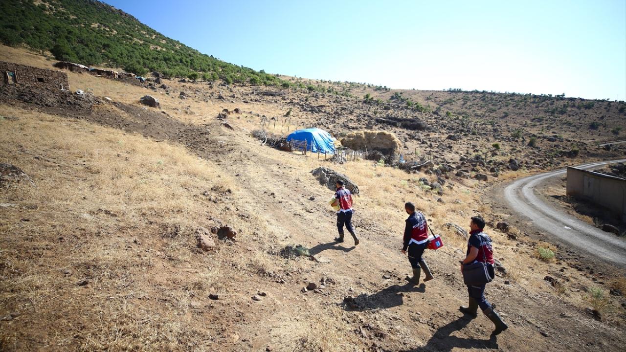 Kent merkezinden araçlarla yola çıkan ekipler, araçla ulaşımın olmadığı noktalarda ekipmanlarını ellerinde taşıyarak yaylalardaki hayvanlara ulaşmak için kilometrelerce yürüyor.
