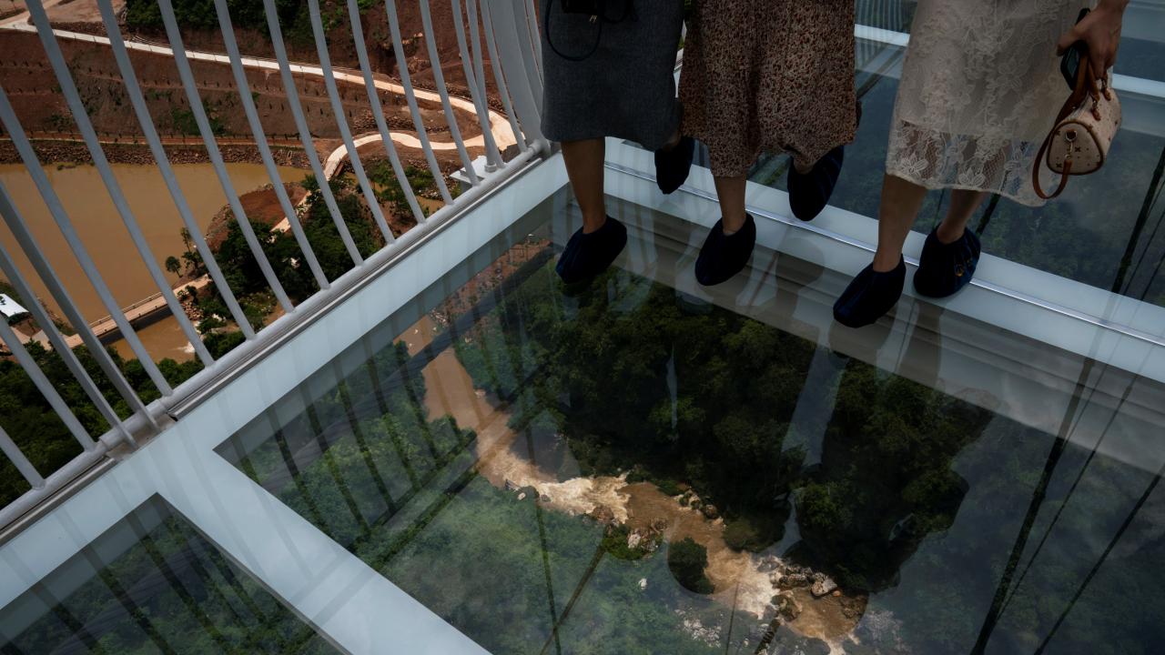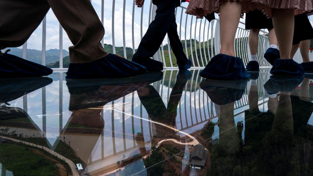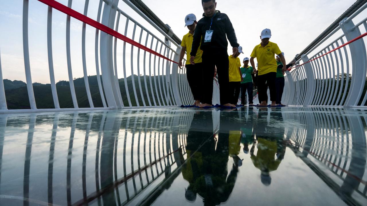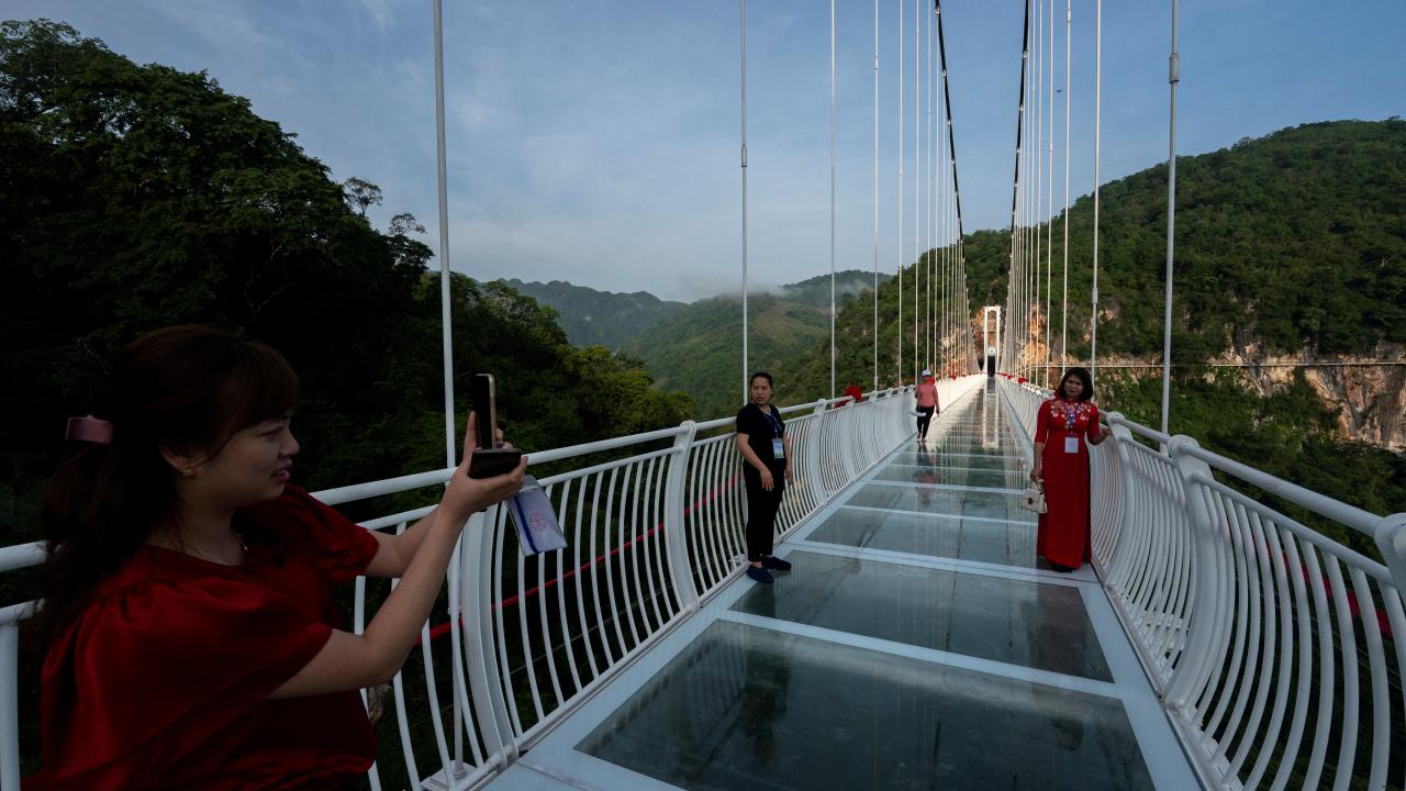 Vietnam'ın Son La eyaletindeki Moc Chau semtindeki açılış töreni sırasında insanlar dünyanın en uzun cam köprüsünde yürüdü.